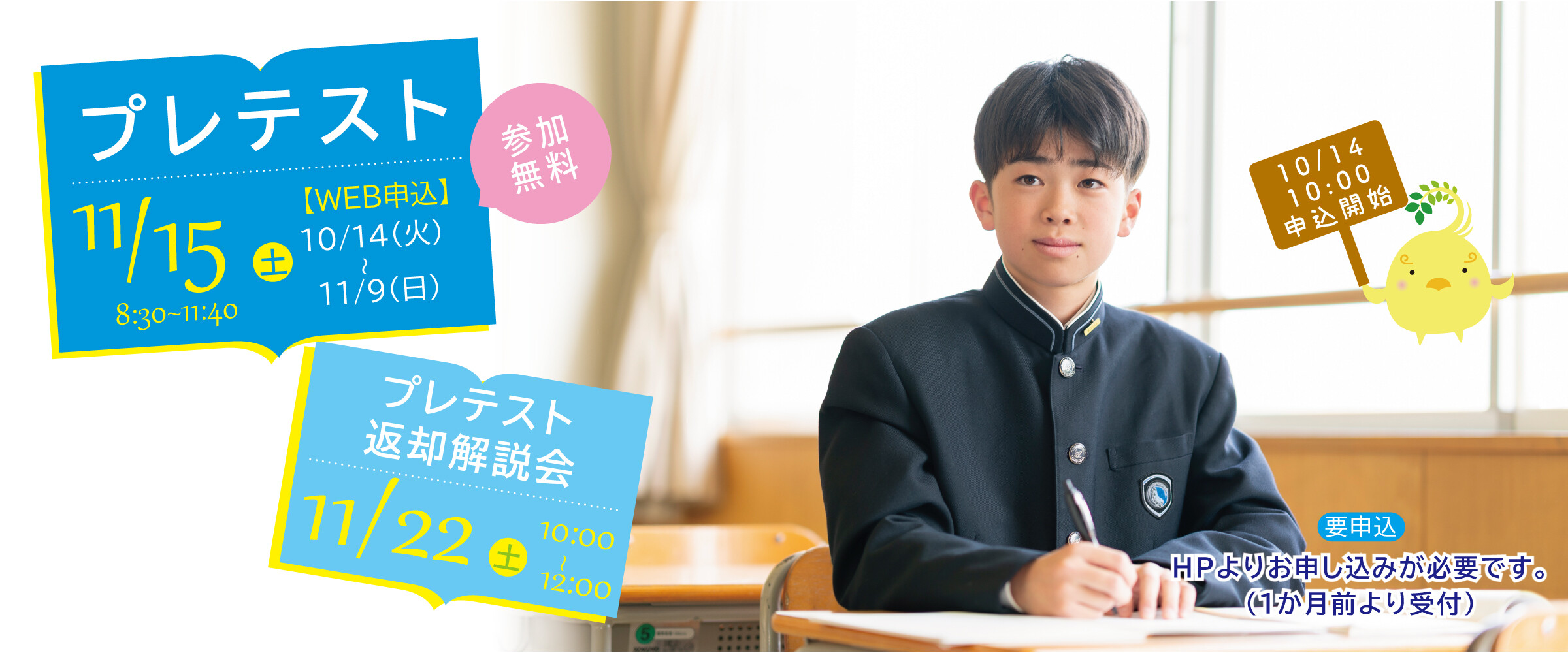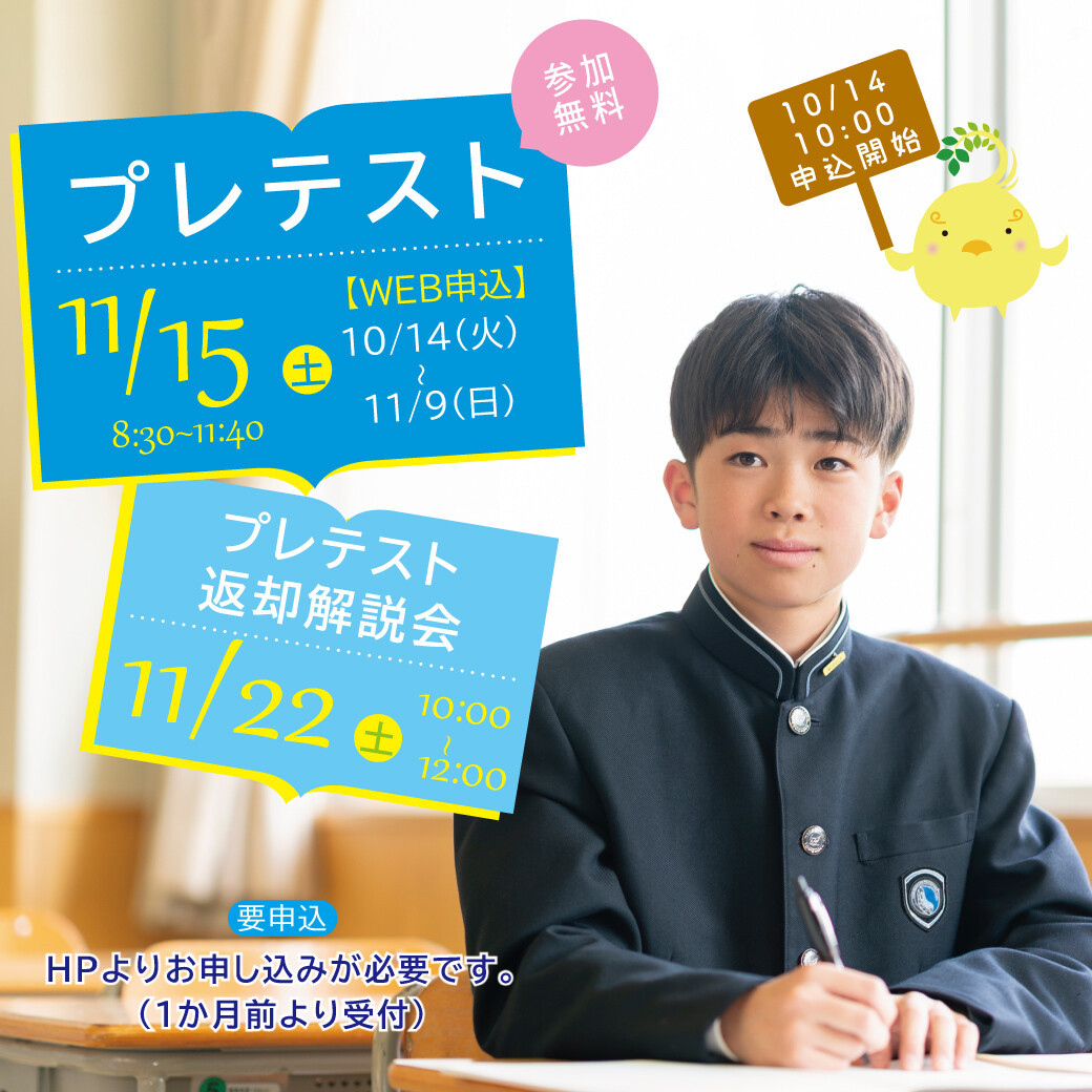 2025.10.1011/15(土)プレテストの申込は、10/14(火)10:00から開始します 2025.10.06【読売オンライン】新設の「シンガポール研修」で世界人材へさらに一歩 2025.10.05校外入試説明会のご案内 2025.09.24【youtube】学校紹介 2025 2025.09.18【9/25(木)申込受付】10/25(土)入試説明会・学校見学会のご案内 2025.09.04【youtube】『日能研NEWS速報!奈良県有名私立中学受験ナビ 2025』に本校が出演しました