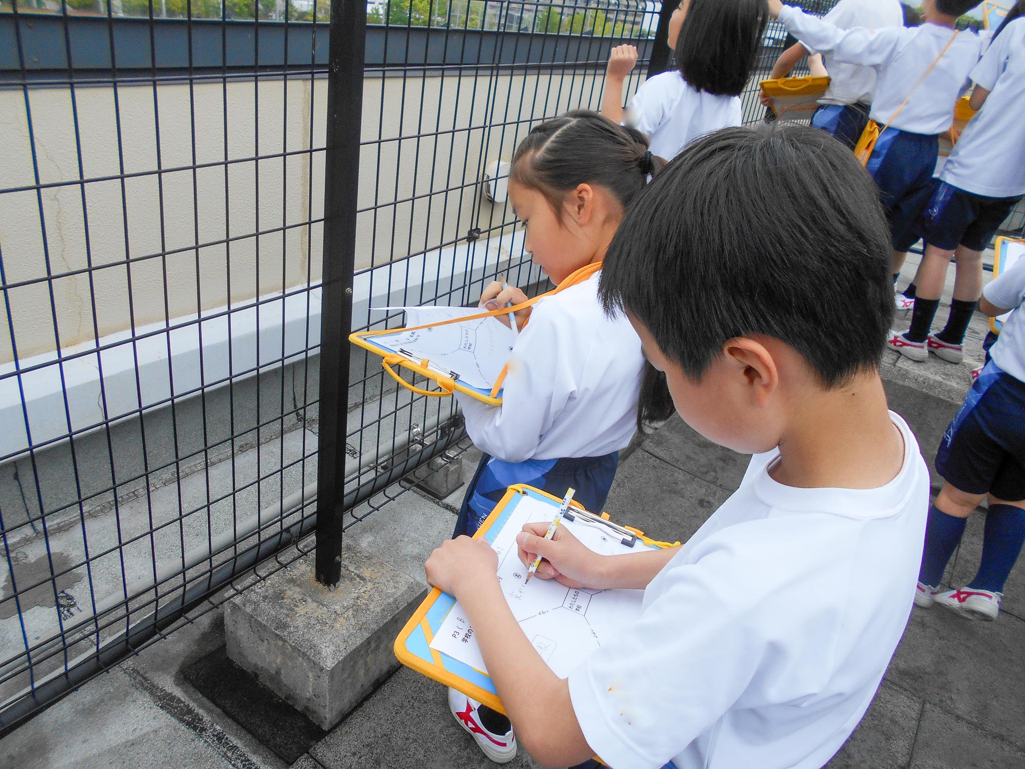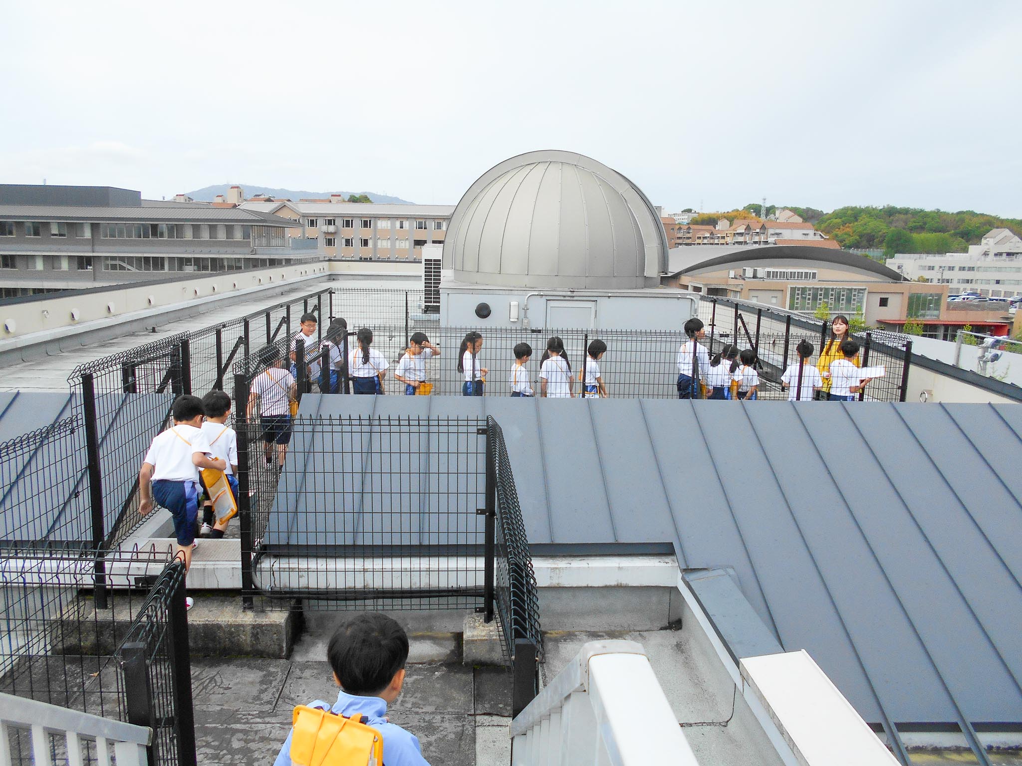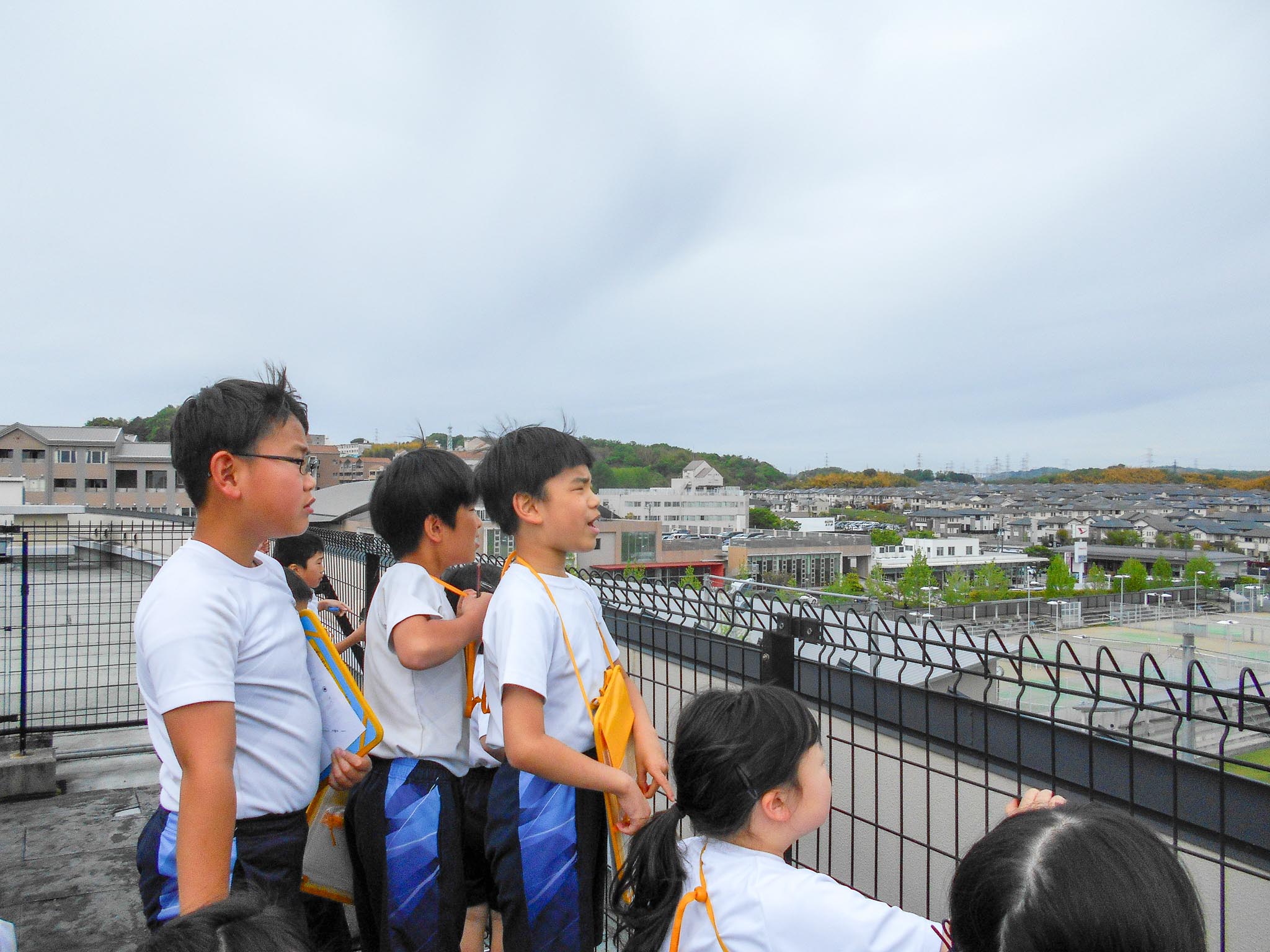 学校の屋上から見た学校のまわり 2026.04.27(月)校長 Post P3生(3年生)が、社会科の学習で、学校の屋上に上って、学校の周りの風景を見学しました。 屋上から見た東西南北の風景は、普段地上から見たものと違って、子どもたちにとってとても新鮮だったようです。 「あっ、あそこに電車が走ってる!」などとびっくりした様子で話をしていました。 « 学校たんけん P1お迎えの会 »