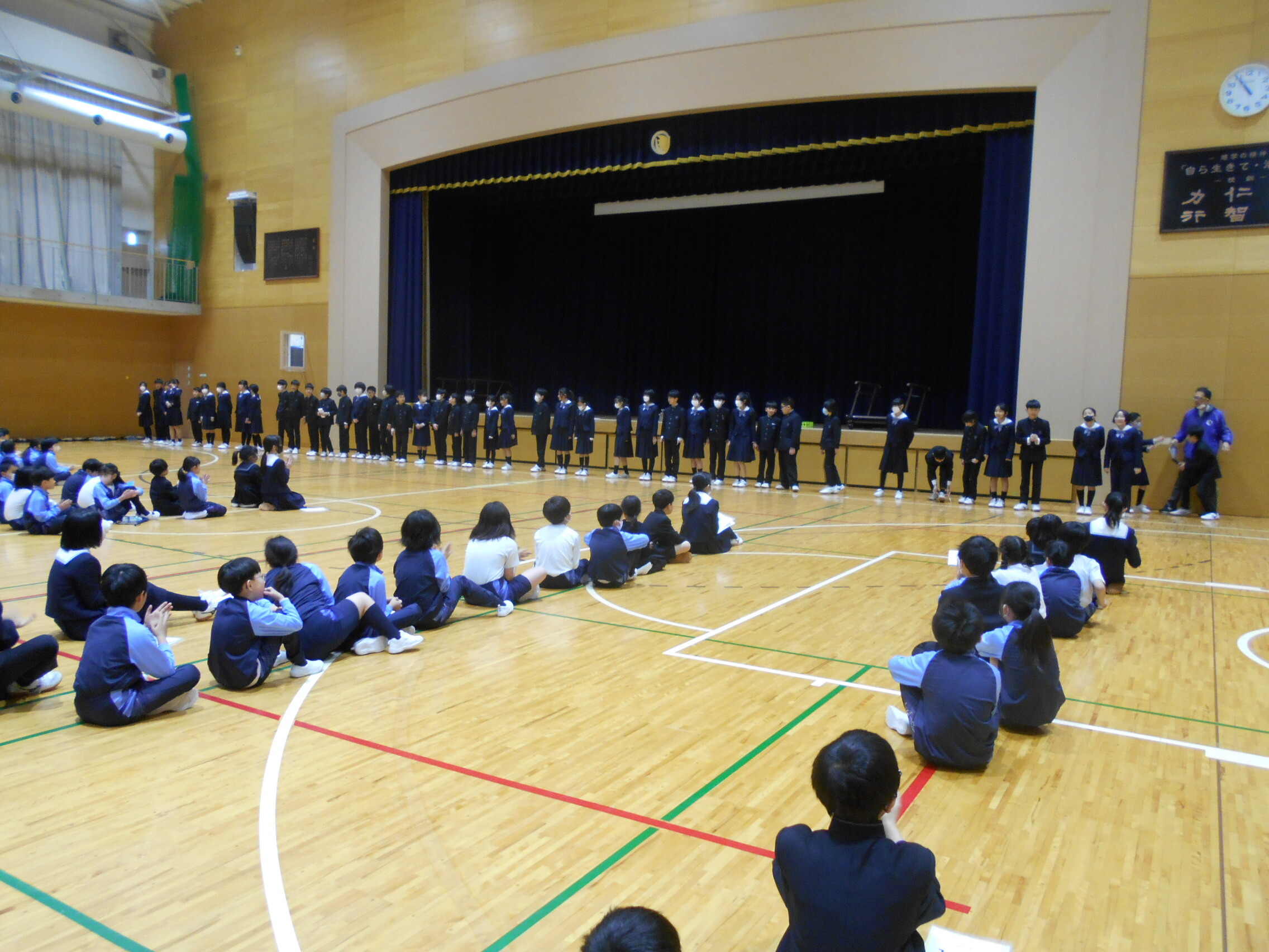 11日に全校児童がMY体育館に集まり、M2生(6年生)を送る会を行いました。