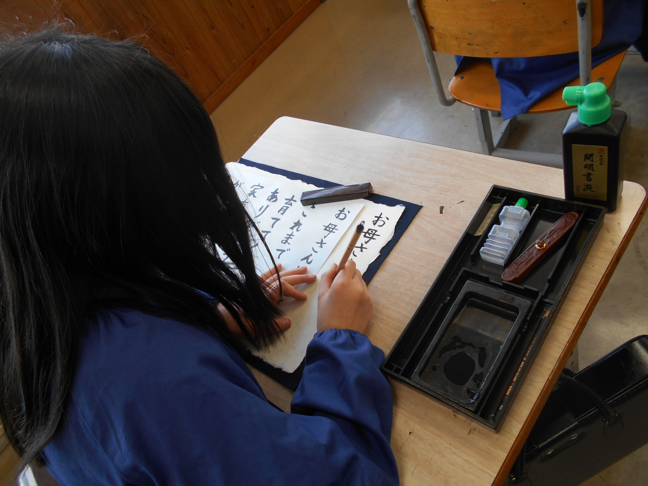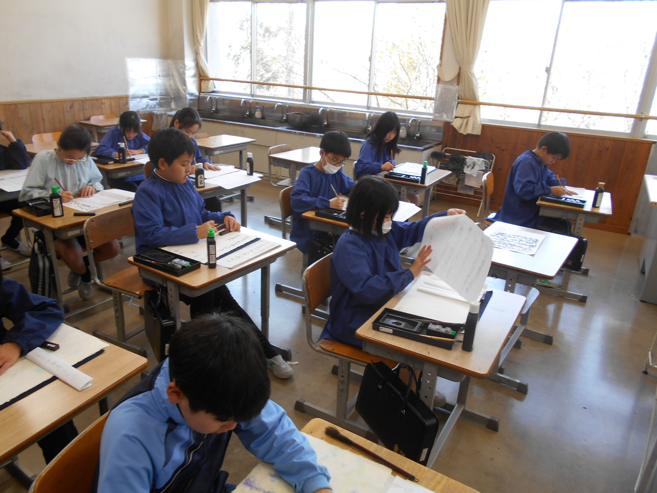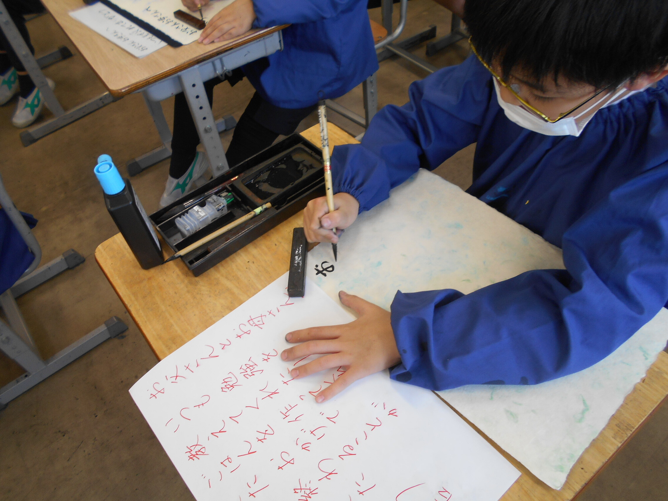 P4生(4年生)が書写の時間、以前に吉野の和紙職人の方に教えていただきながら作成した和紙を使って、習字をしていました。
