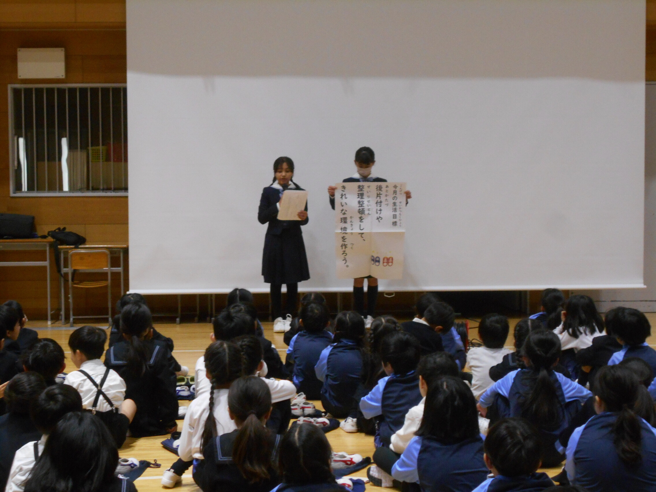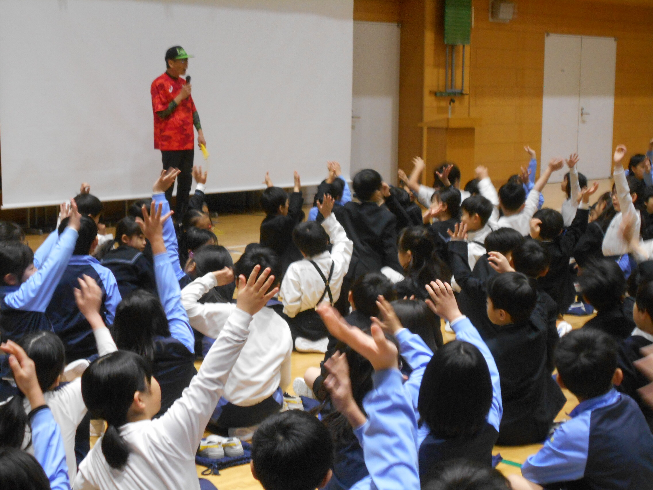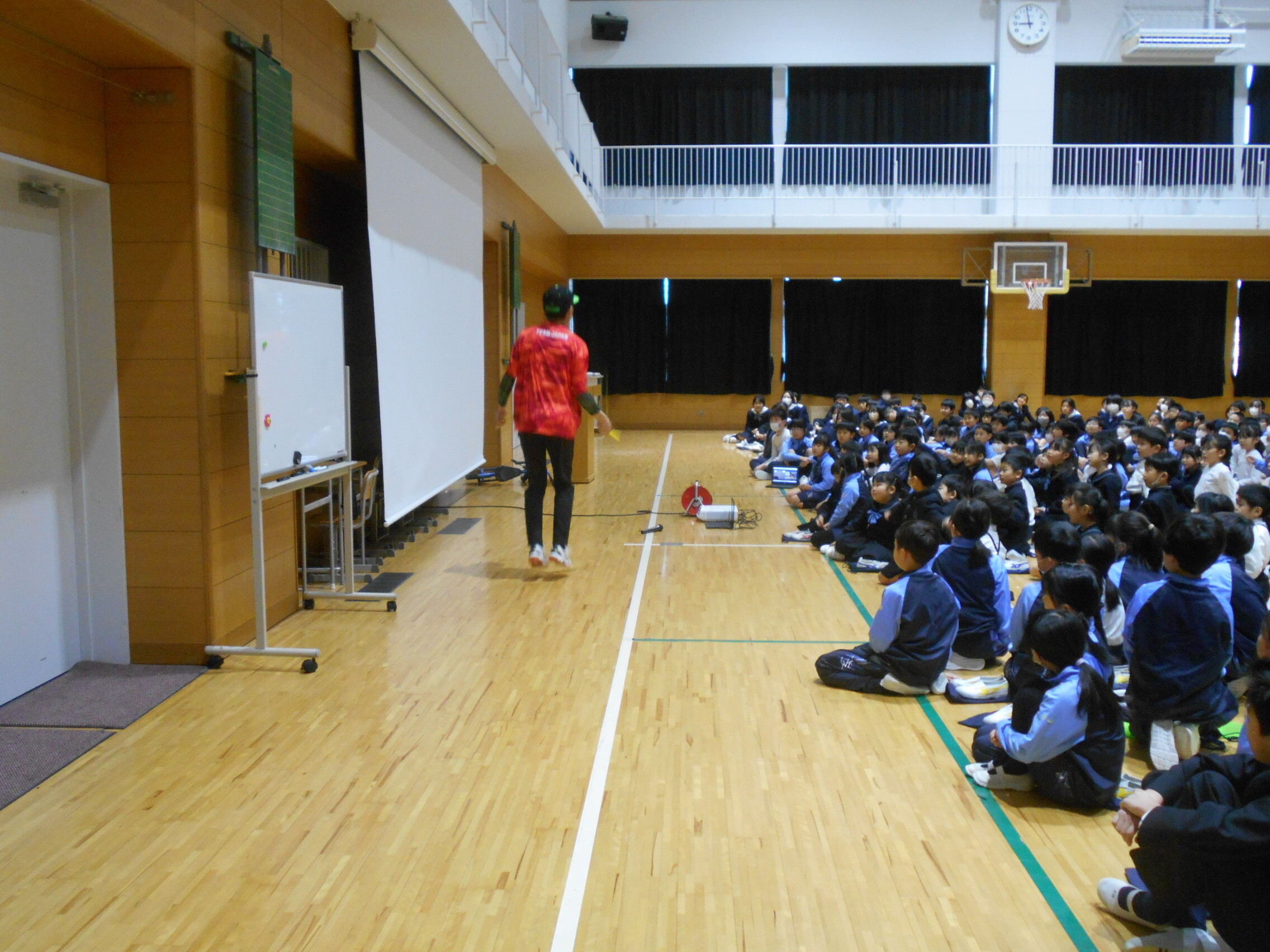 全校朝礼にジャンピングロープマン現れる! 2026.02.03(火) Tweet 2月に入り、2日に全校朝礼を行いました。 はじめに表彰を行った後、校長から「運動をしよう!」というテーマでお話がありました。 そのときに、ジャンピングロープマンが表れて、なわとびの跳び方のコツを教えてもらいました。子どもたちもぜひこの寒い季節になわとびをして体をきたえてほしいものです。 最後に各委員会から連絡があり、全校朝礼は終わりました。 « 理科論文始まる! 雅楽を知ろう »