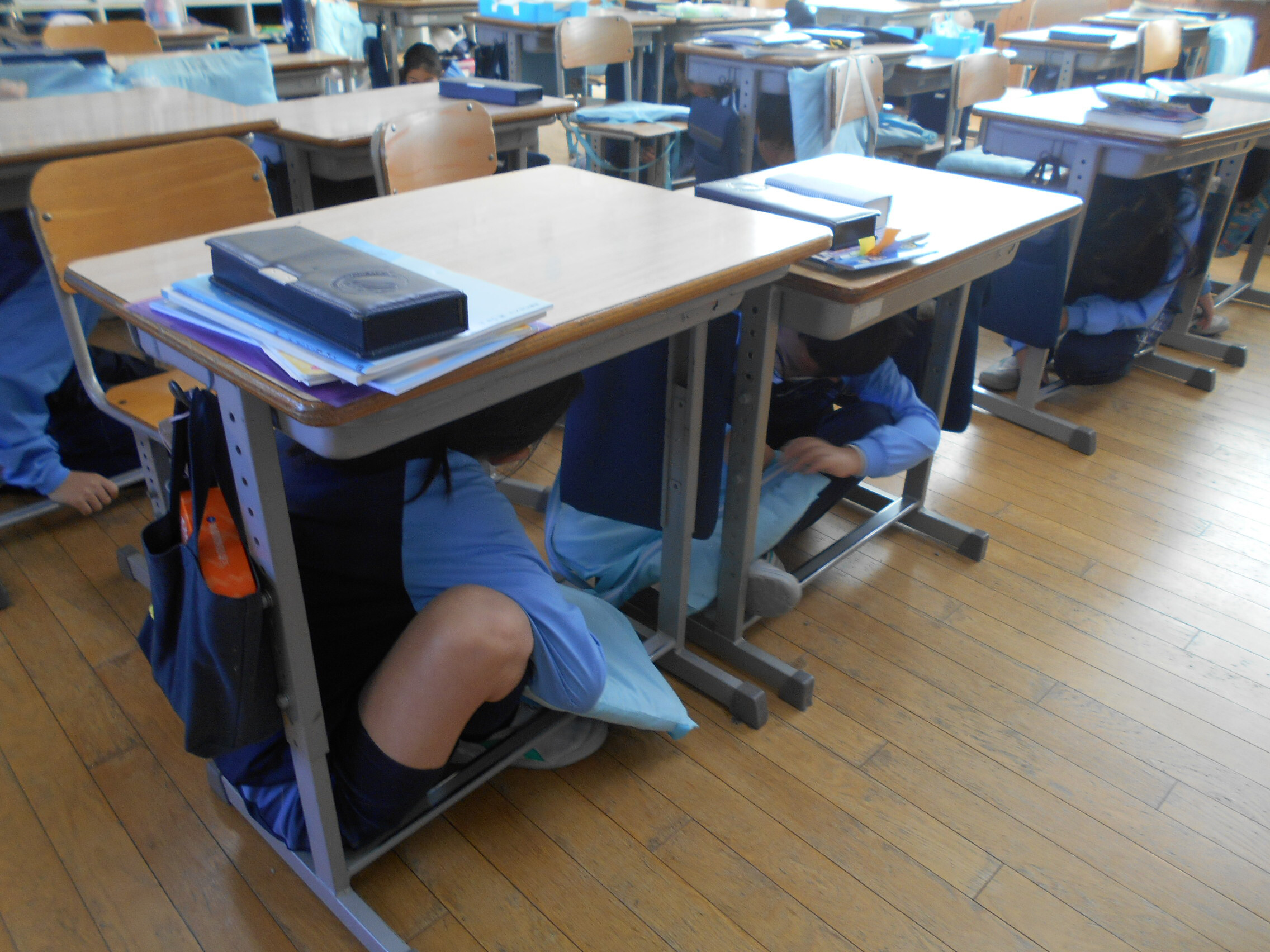 全館に緊急の一斉放送が流れた後、一次避難として子どもたちは机の下にかくれます。