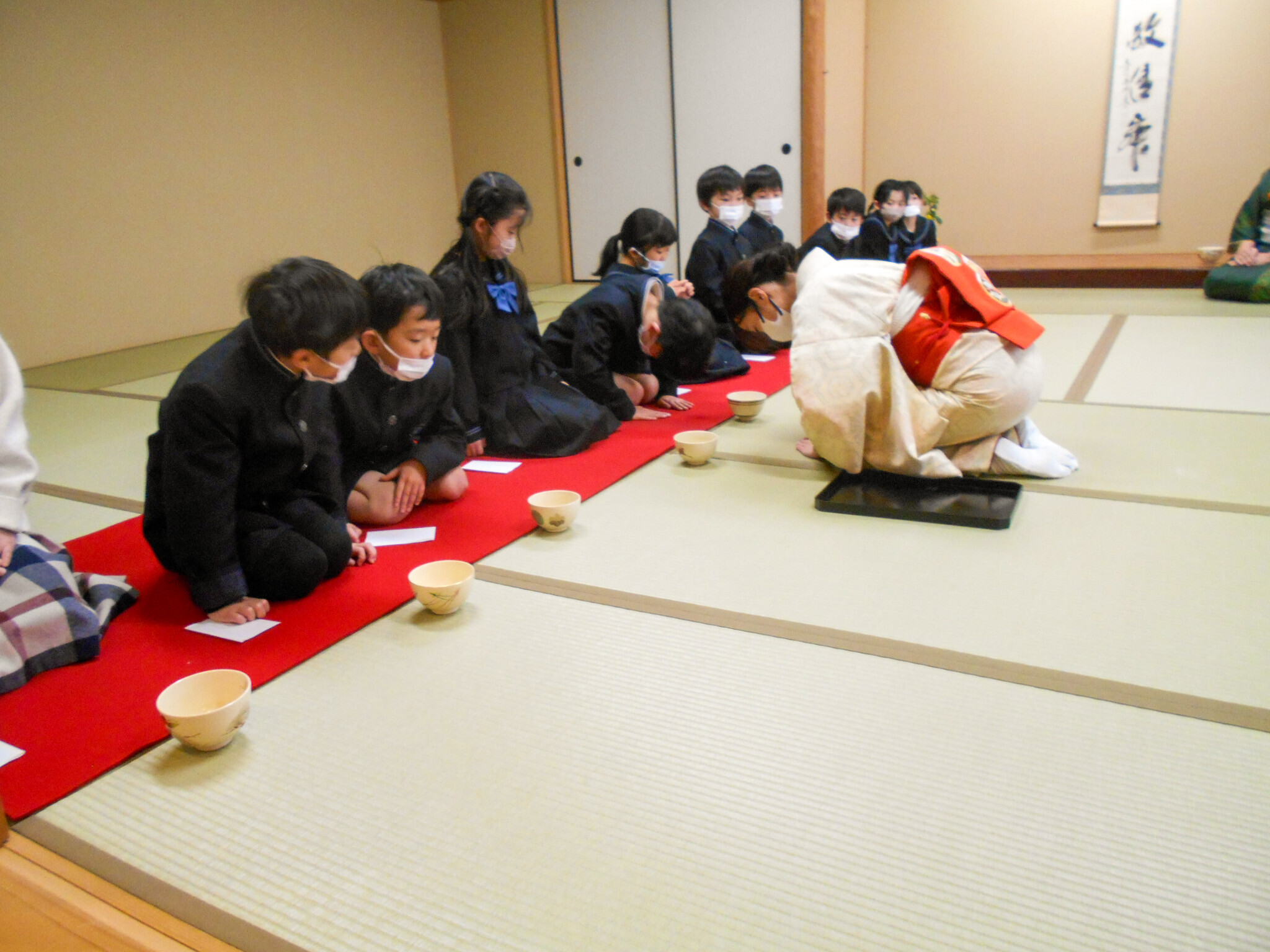 正座をしてお菓子をいただいた後、先生が運んでくれたお茶が入った茶碗を一人ずつ受け取ります。その際の作法についても、先生から教わったことを礼儀正しく行いました。