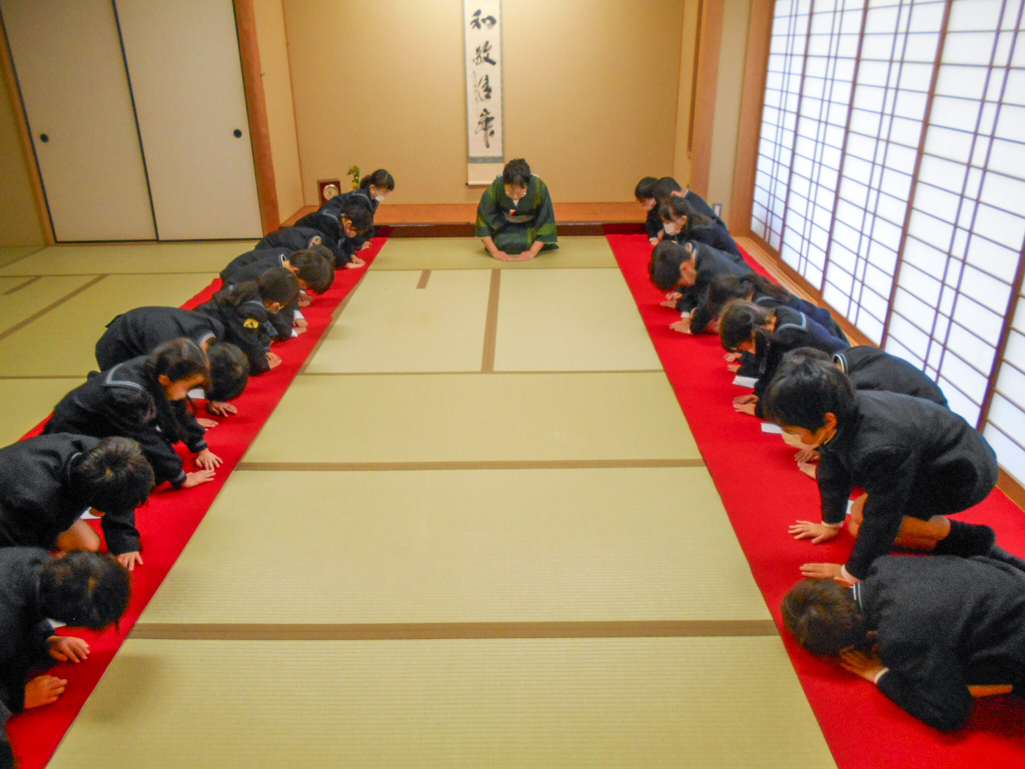 最後には、人とすれ違った際の会釈などお辞儀の仕方の練習もしました。