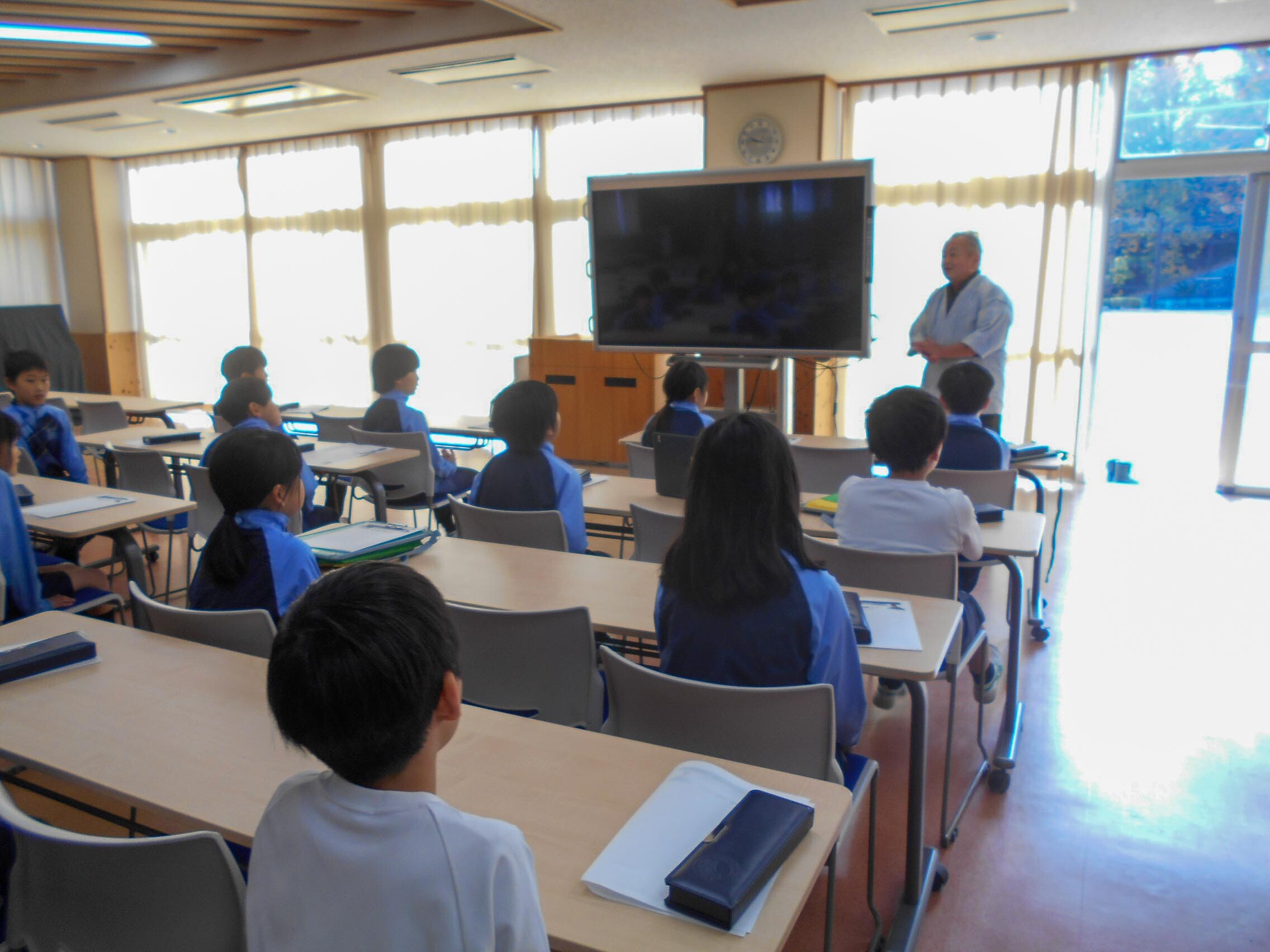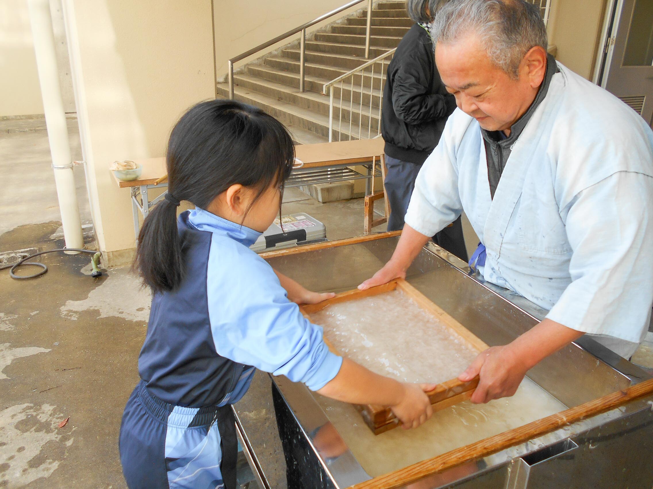 P4生(4年生)が紙漉き体験を行いました。ゲストティーチャーとして、吉野地方にお住いの奈良県伝統工芸士 福西さんに来ていただき、和紙作りにチャレンジしました。