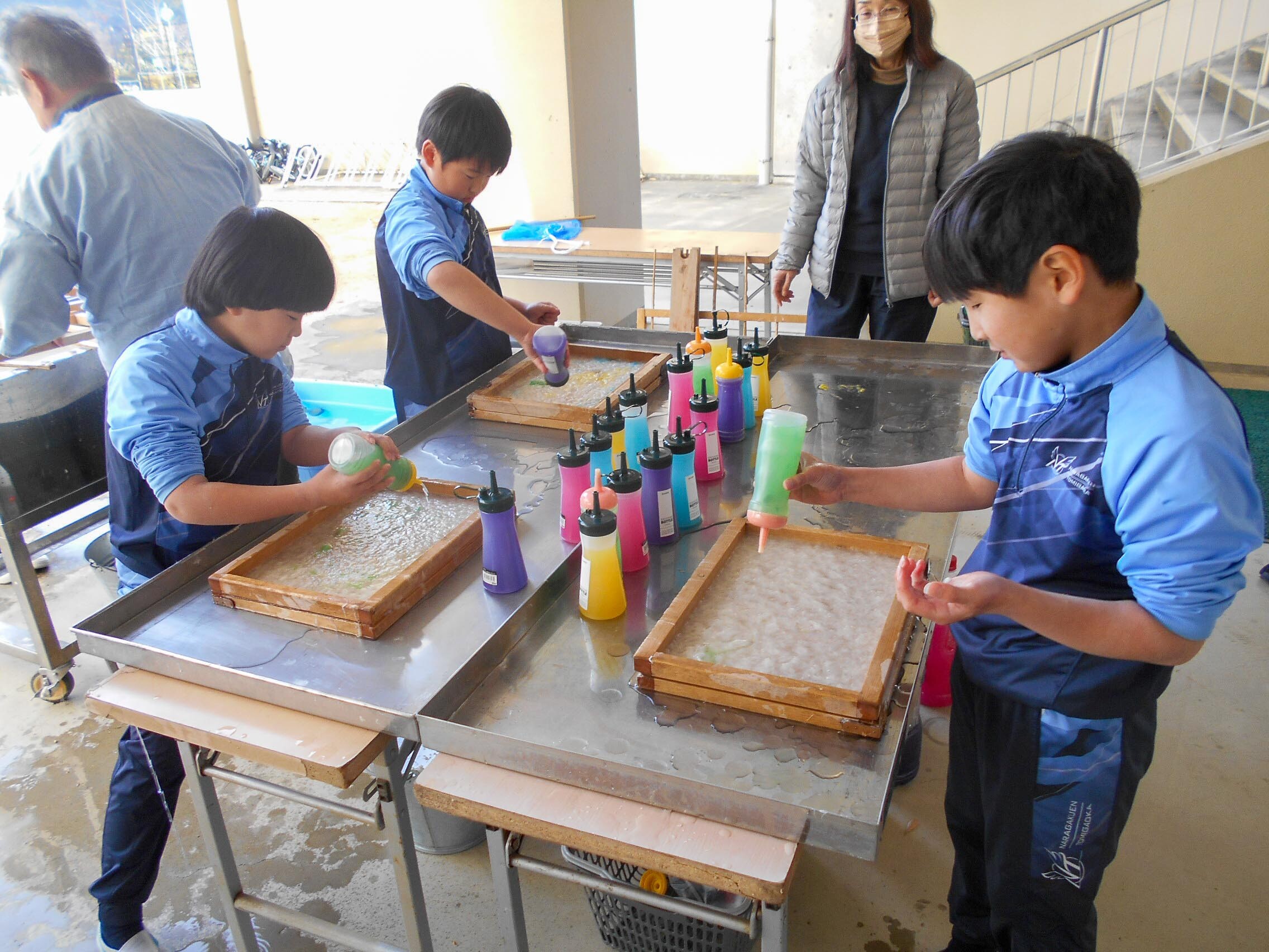 水の中に手を入れて手漉き体験をすると、子どもたちから冷たいという声が数多く聞こえてきました。思い思いの色をつけて、完成。後日、和紙が乾き、自分だけのオリジナル和紙ができあがってくるのがとても楽しみです。