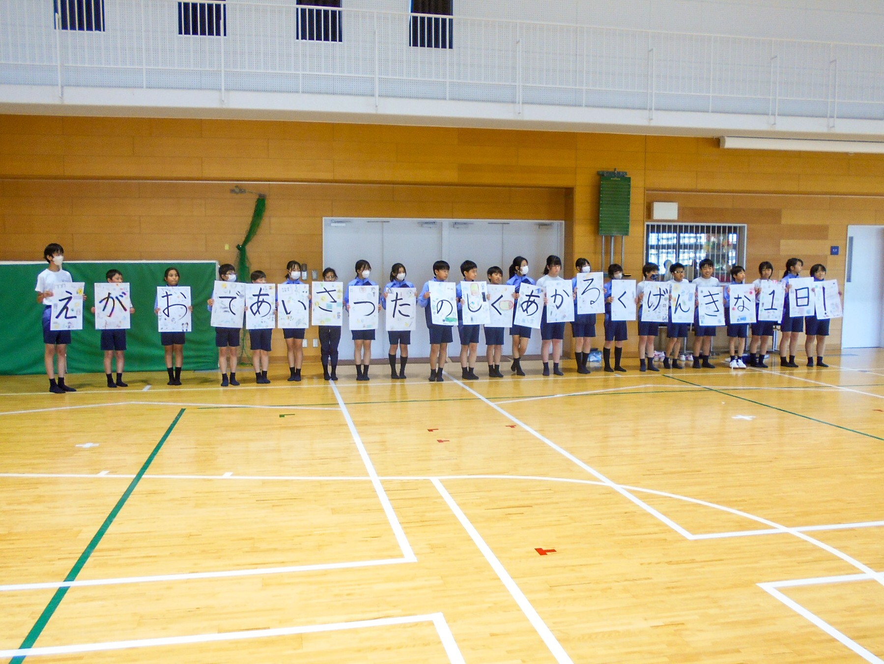 最後にはM2生が、出来上がった画用紙を持って体育館に集まり並べて、オンラインで各教室に映し出しました。