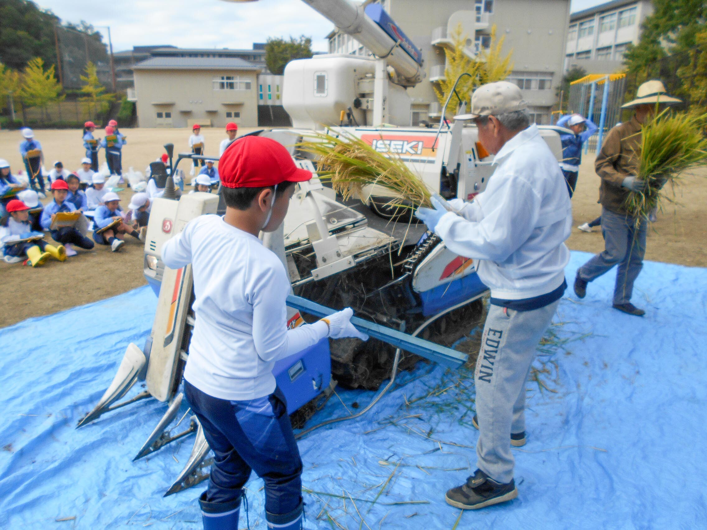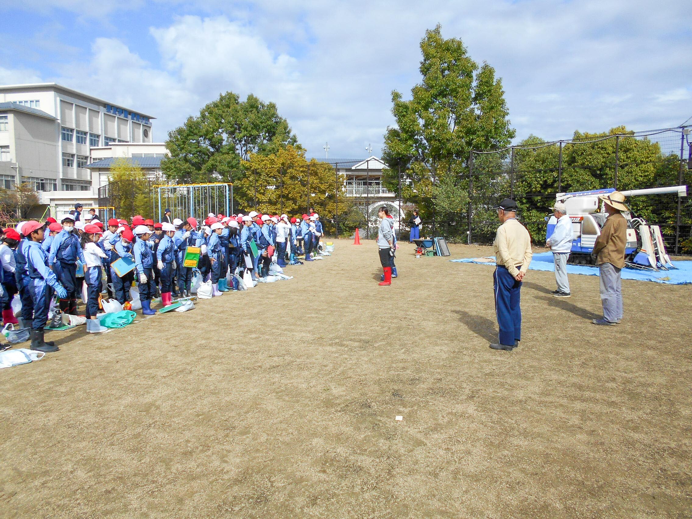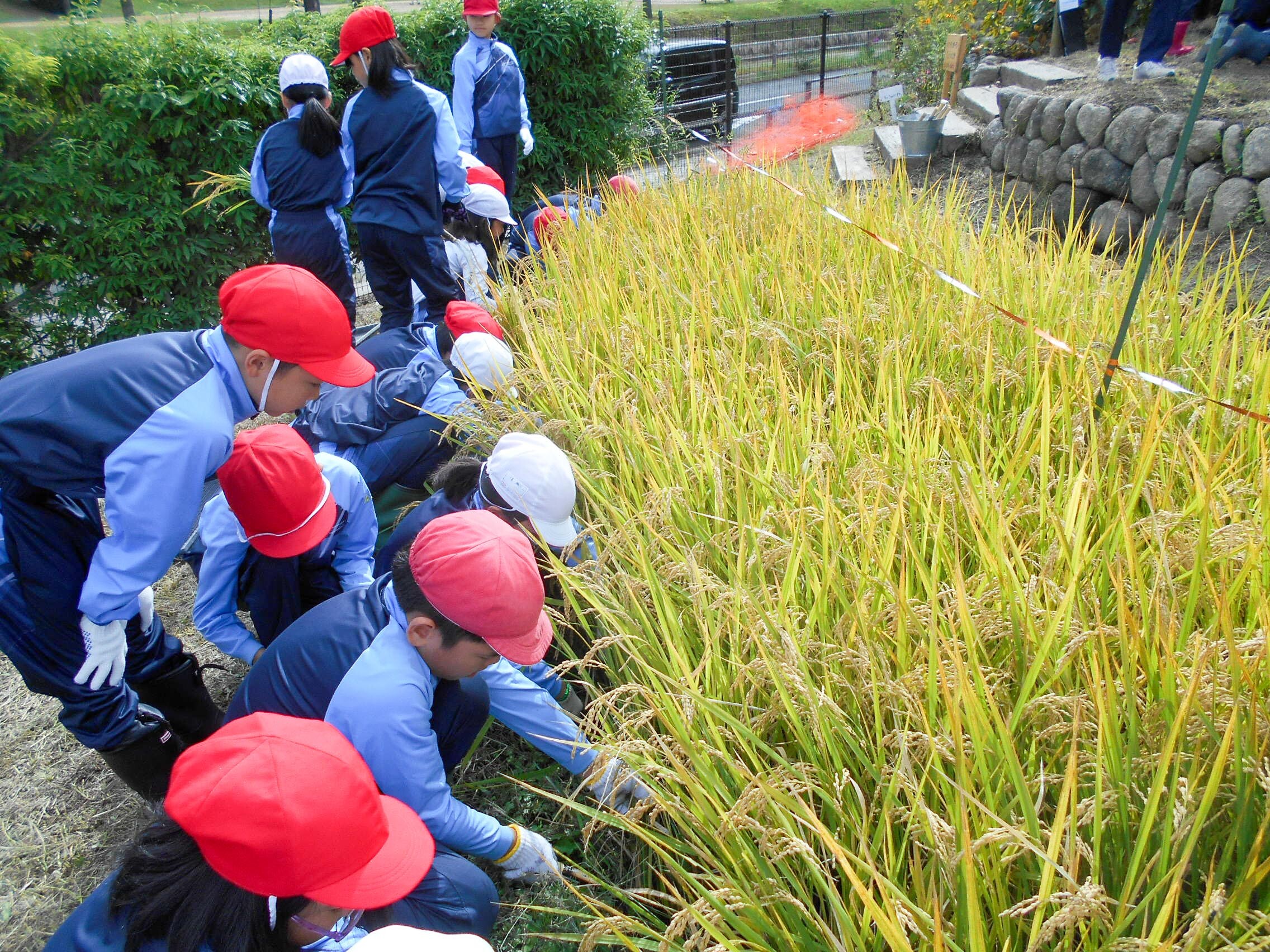 青空の下でP3・4生(3・4年生)が、春から育ててきたお米を収穫する稲刈りをしました。