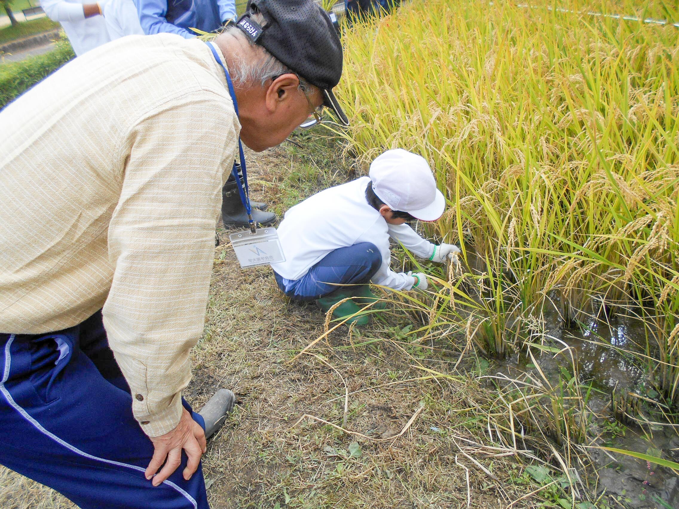 黄色く色づく稲穂の下の方を持ち、いざ稲刈りにチャレンジ!子どもたちはとても楽しそうに取り組んでいました。