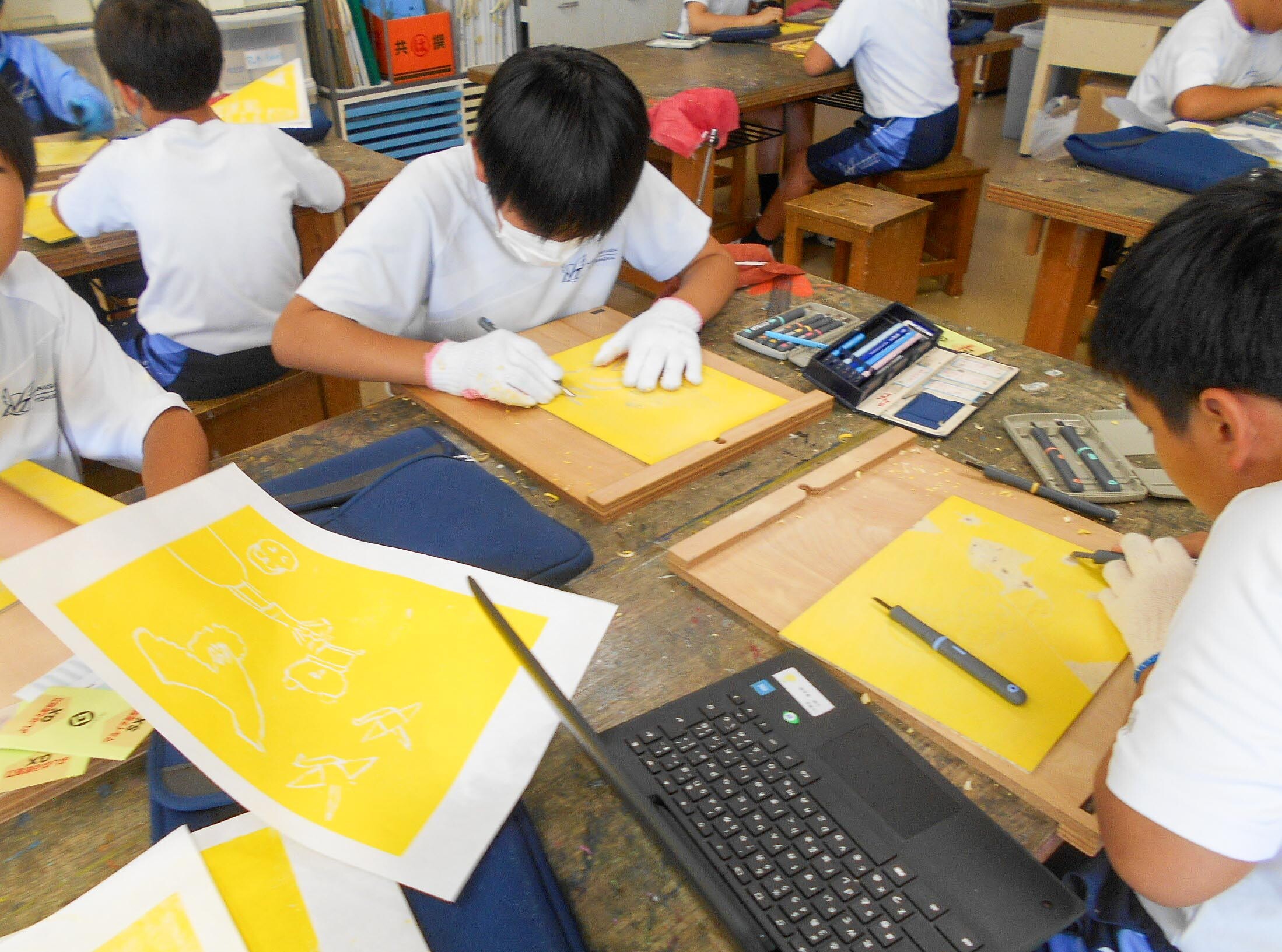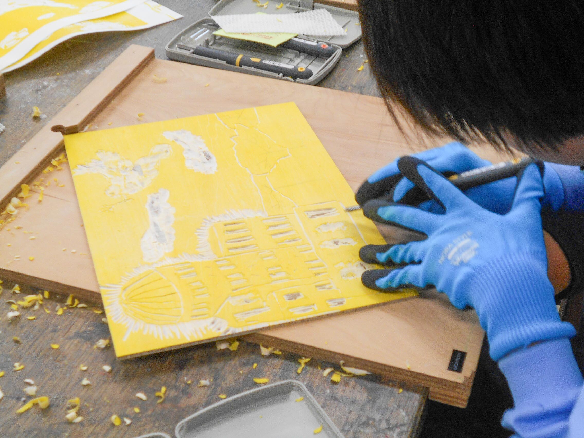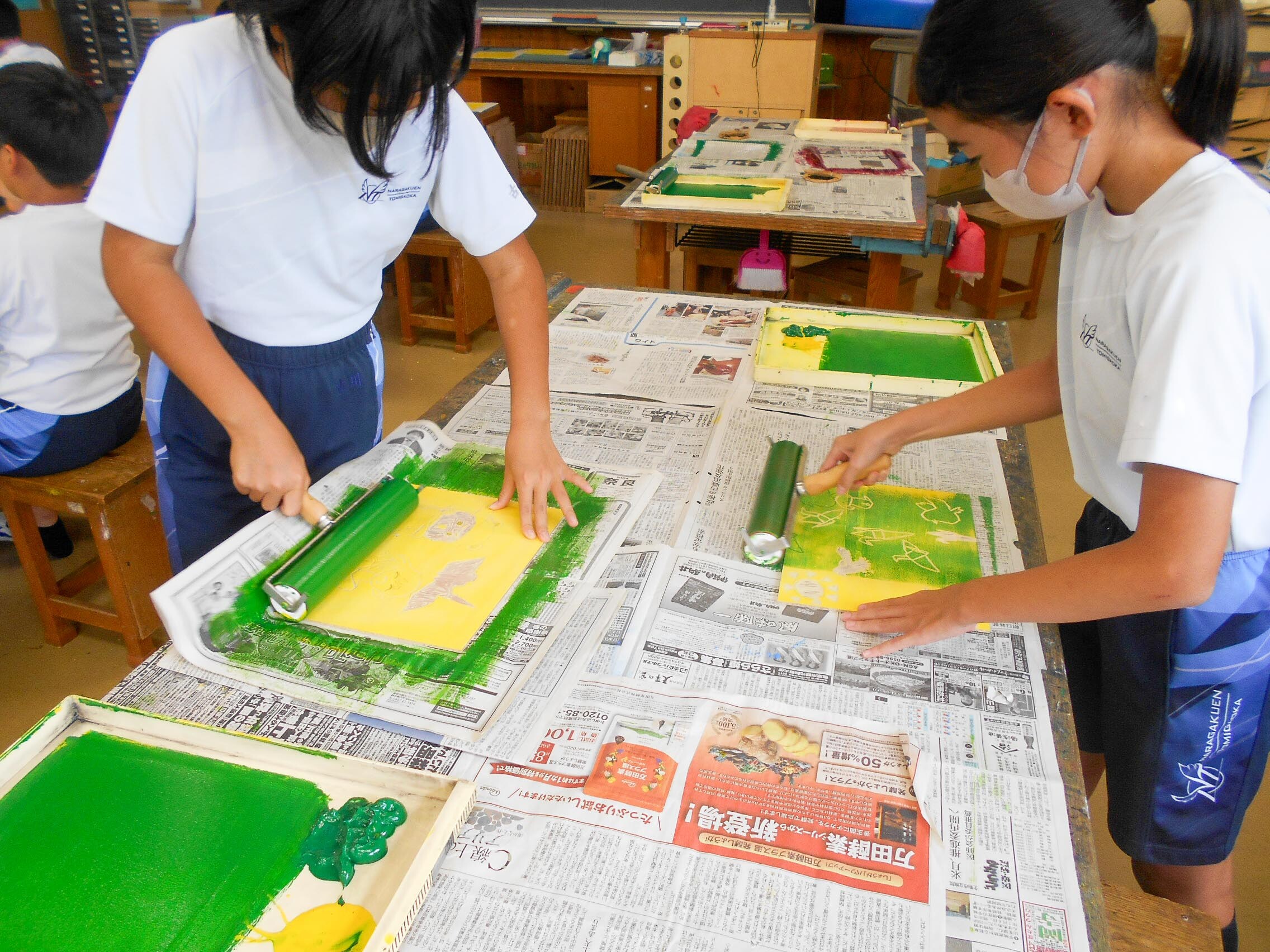 ほり進み版画 2025.10.09(木) Tweet M1生(5年生)が図工科で、ほり進み版画を作成していました。 この版画は1色ではなく、1版目が黄色、2版目が赤・緑・青色、3版目が茶・黒色と3色の色を重ねて刷っていきます。 どの部分を何色にするのか、そしてどの部分を彫刻刀で彫ればいいのかをよく考えていかないといけません。 作品のテーマは「わたしにとっての平和」。 これから彫り進めて完成した作品が楽しみです。 « 心に残る合同運動会 アリロと遊ぼう »