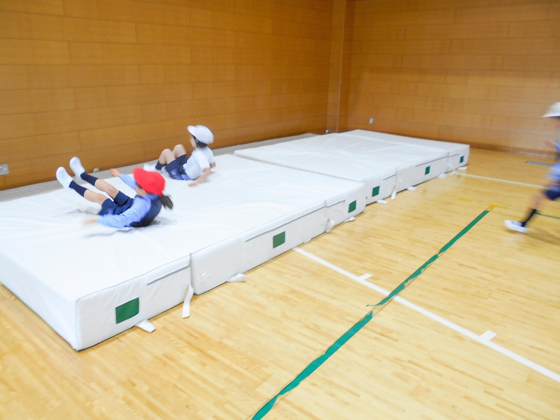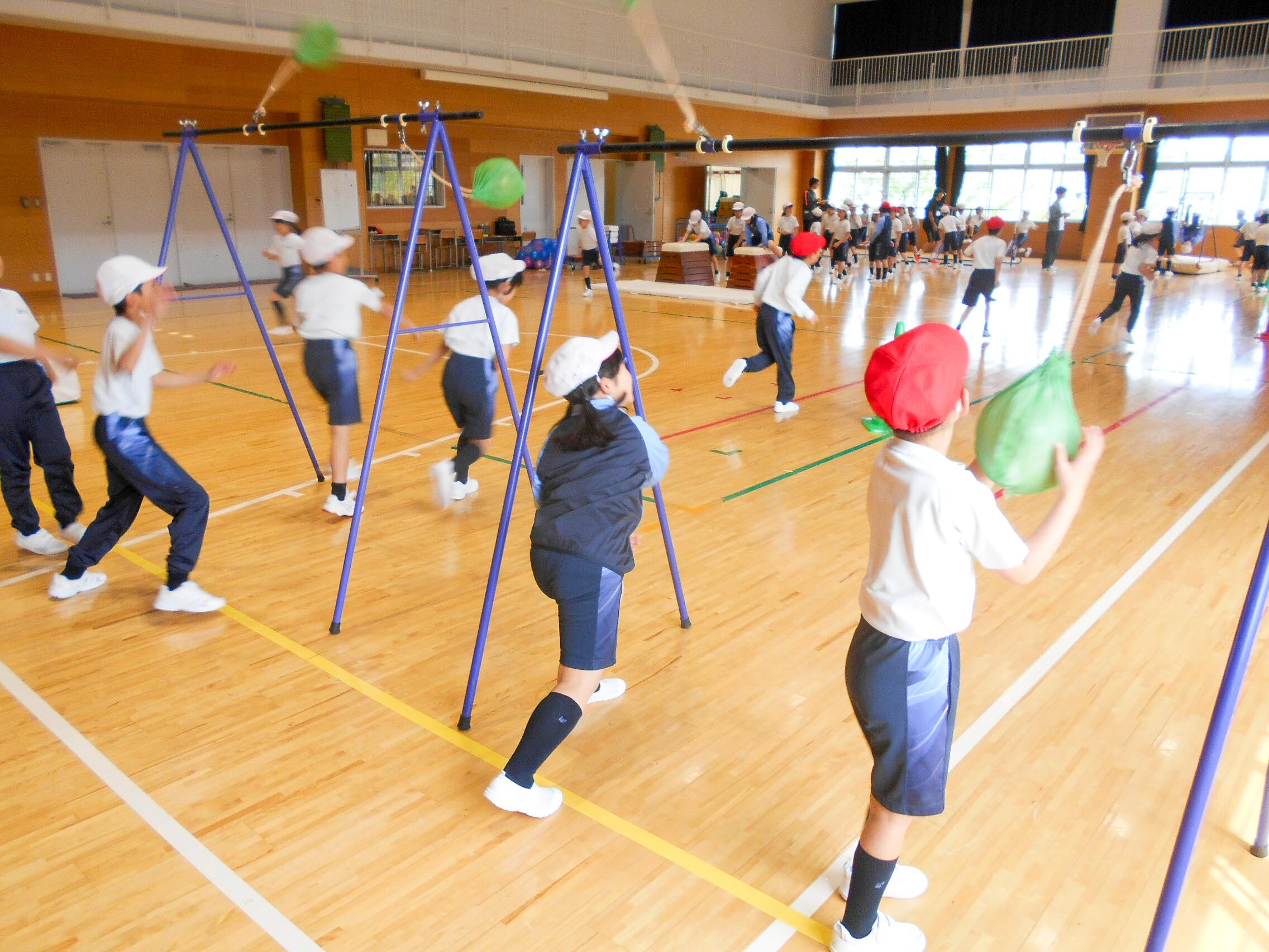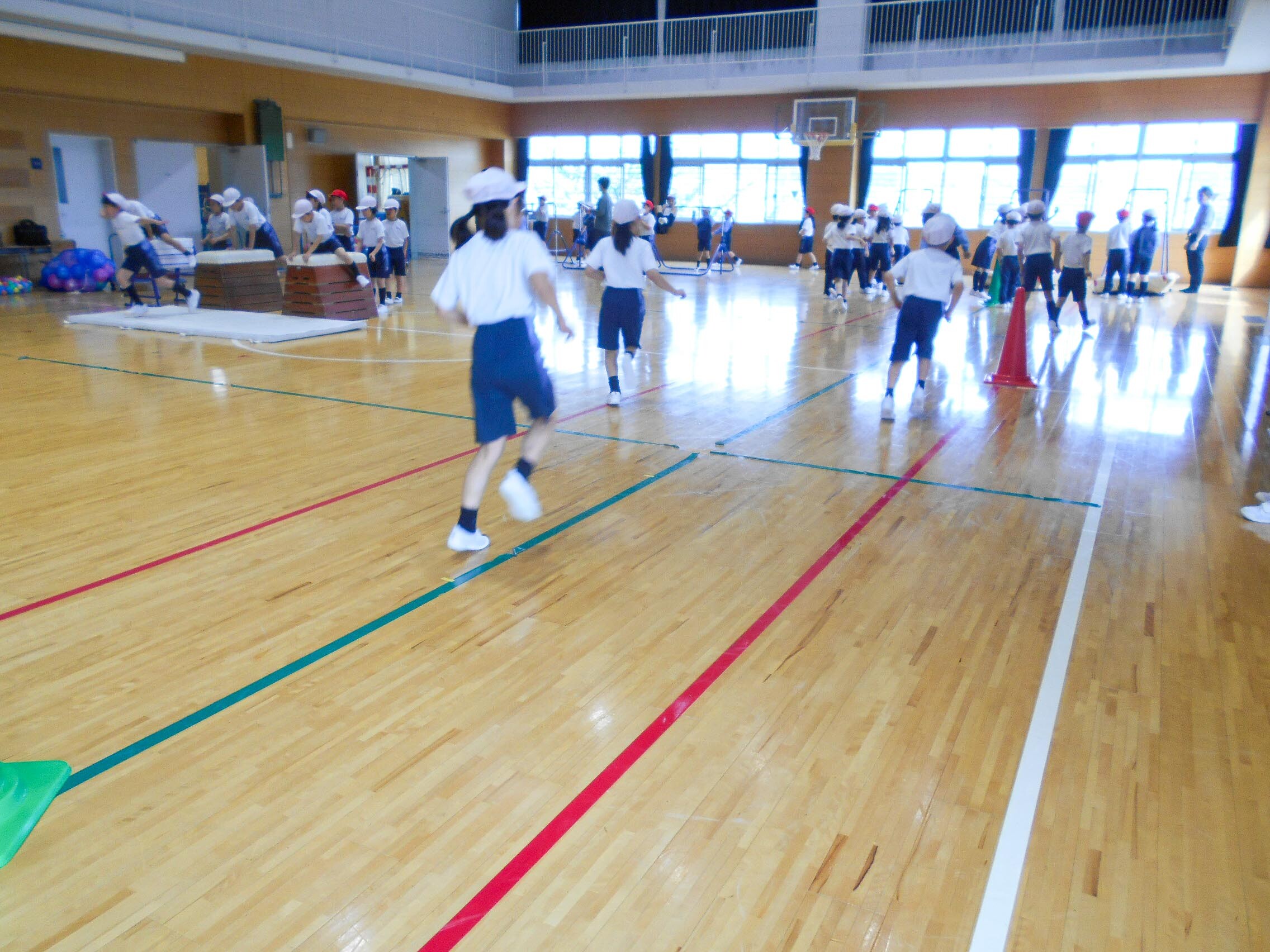 P1~M2生(1~6年生)までが、学年ごとにスッパマン先生と一緒に体力づくりを行いました。跳び箱やマット、けんけん跳びなど6種目の運動を子どもたちは何回も繰り返してチャレンジしていました。