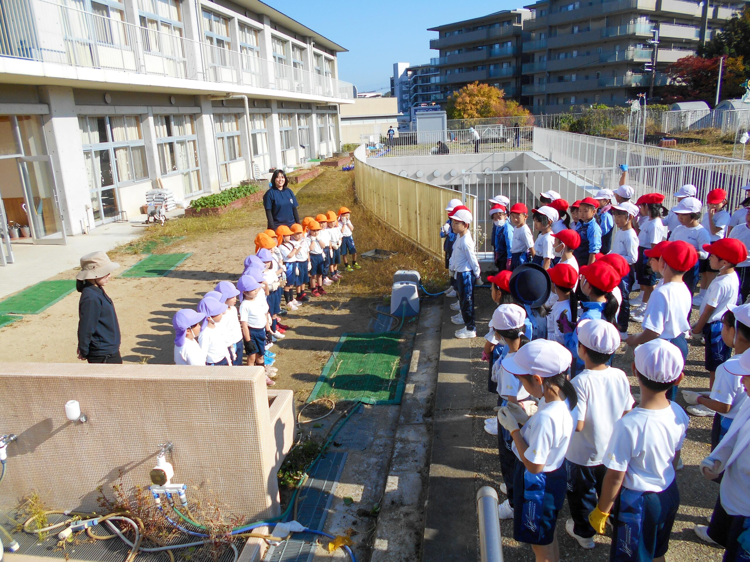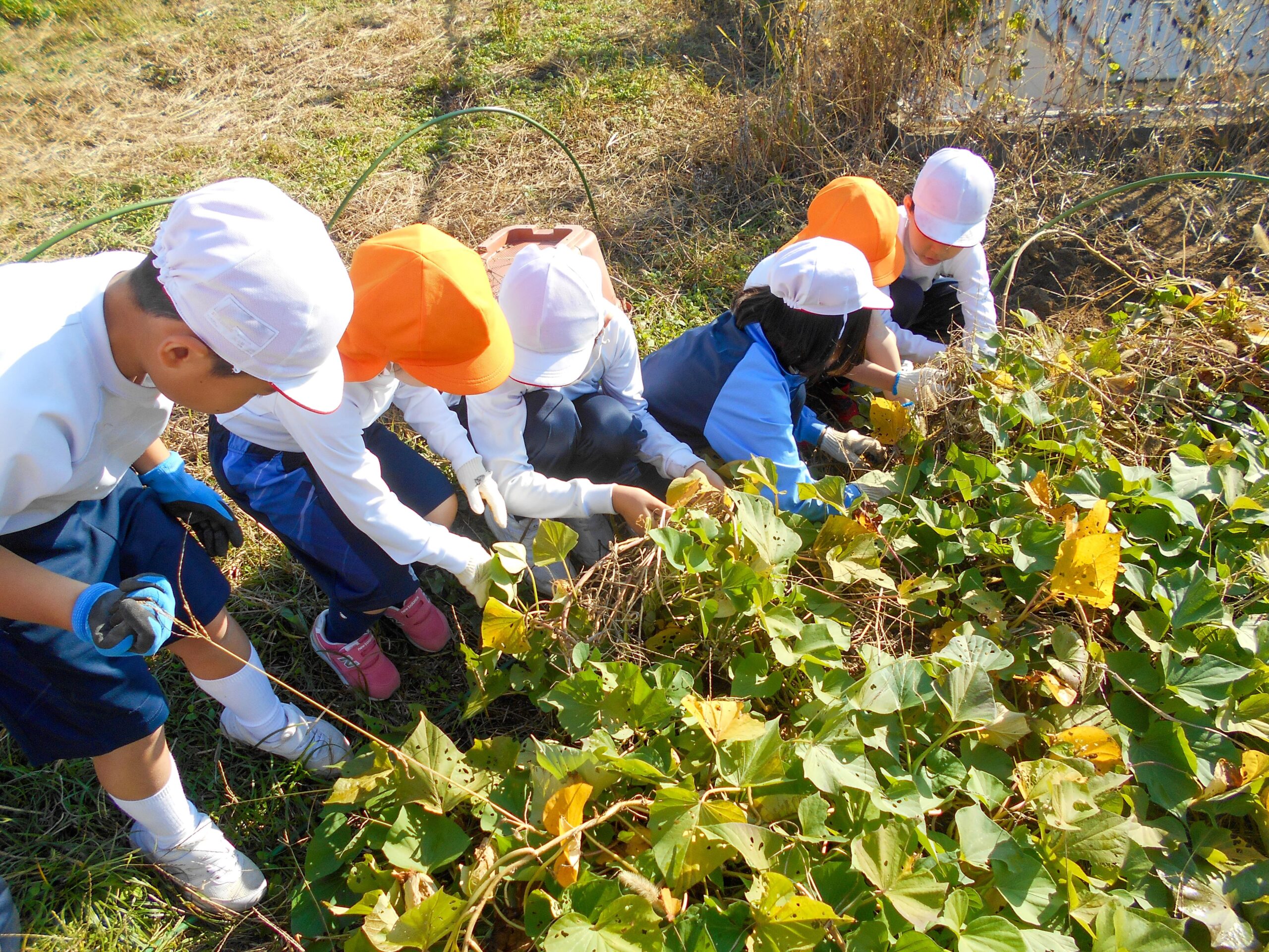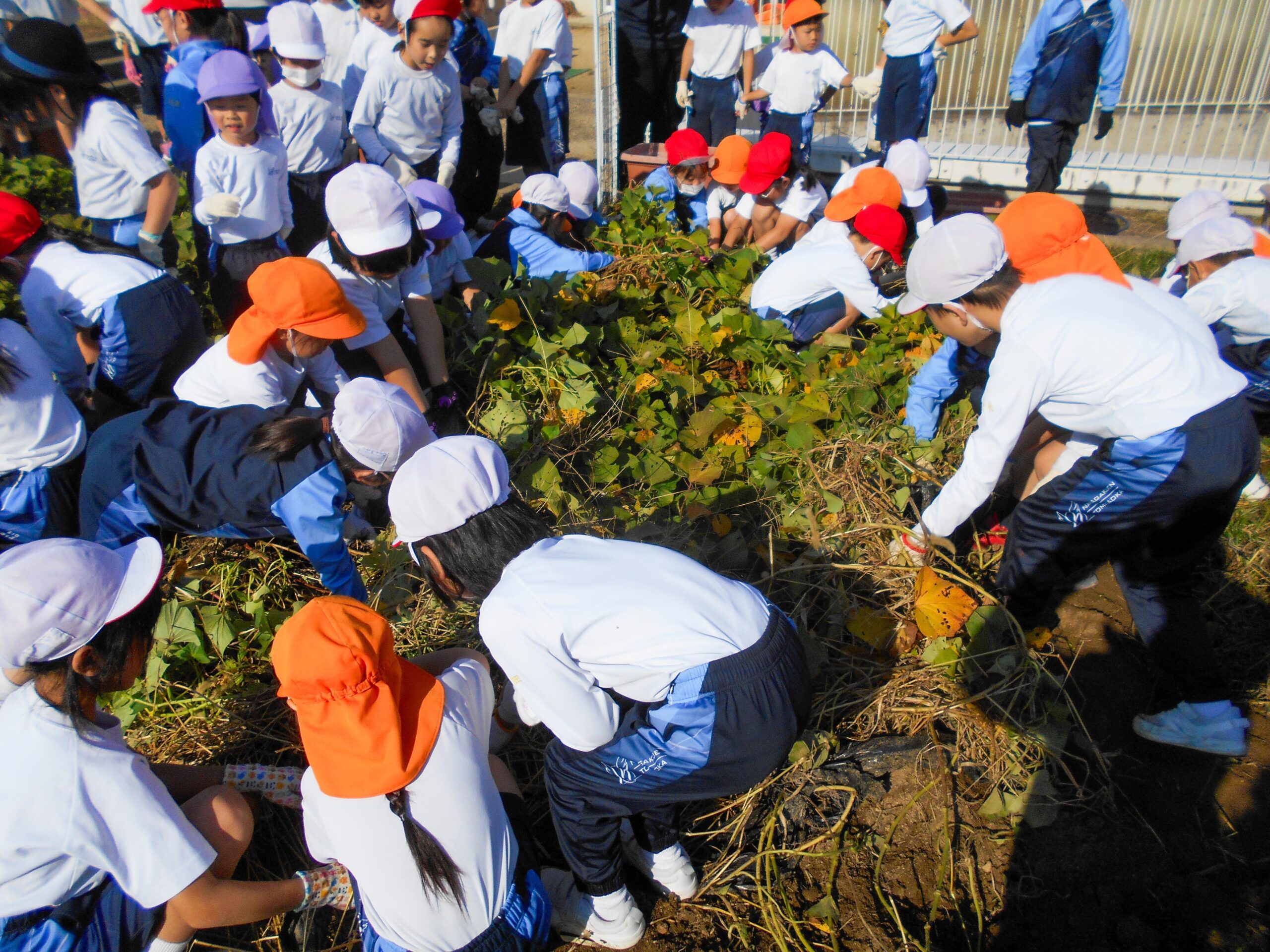 園児と楽しくサツマイモ掘り 2024.11.18(月) Tweet P2生(2年生)が、奈良学園幼稚園のPP2生(年中組)の園児といっしょにサツマイモ掘りをしました。 子どもたちは、手をつないで畑に行き、楽しそうに土の中にあるサツマイモを手で掘っていました。自分の両手よりも大きなサツマイモを見つけてびっくりしていた子もたくさんいました。 « ふれあい清掃 全校かけ足始まる! »