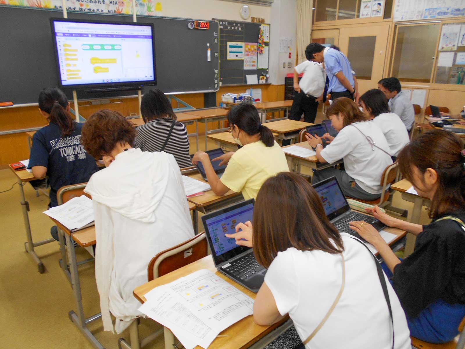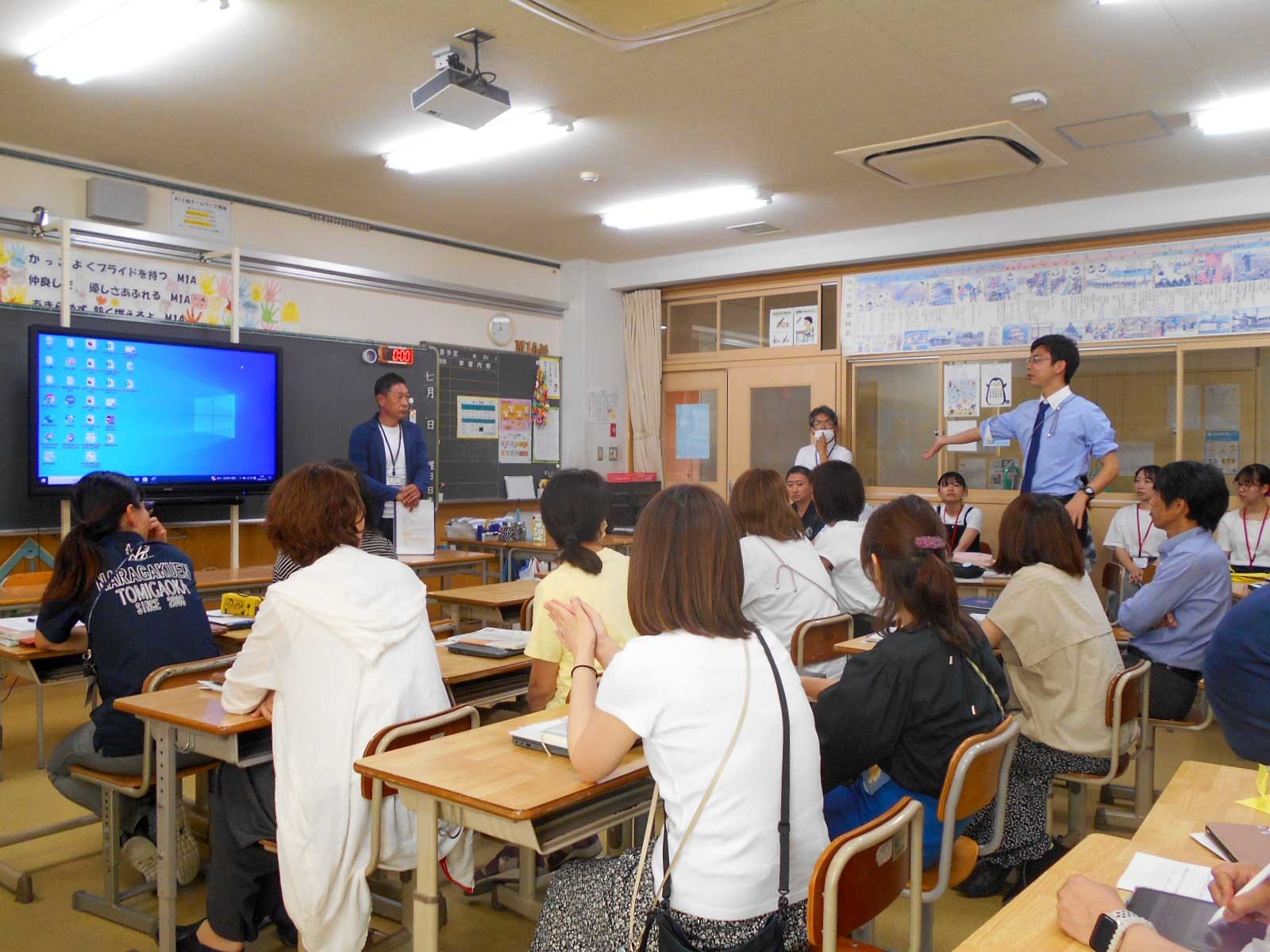 1日目は、プログラミング等のICT教育について実際にタブレットを操作しながら研修したり、いじめ対応や防犯についての研修を行ったりしました。防犯研修では、校舎内に不審者が侵入したことを想定した実施訓練を行った後、奈良学園大学の松井先生の講義を受けました。
