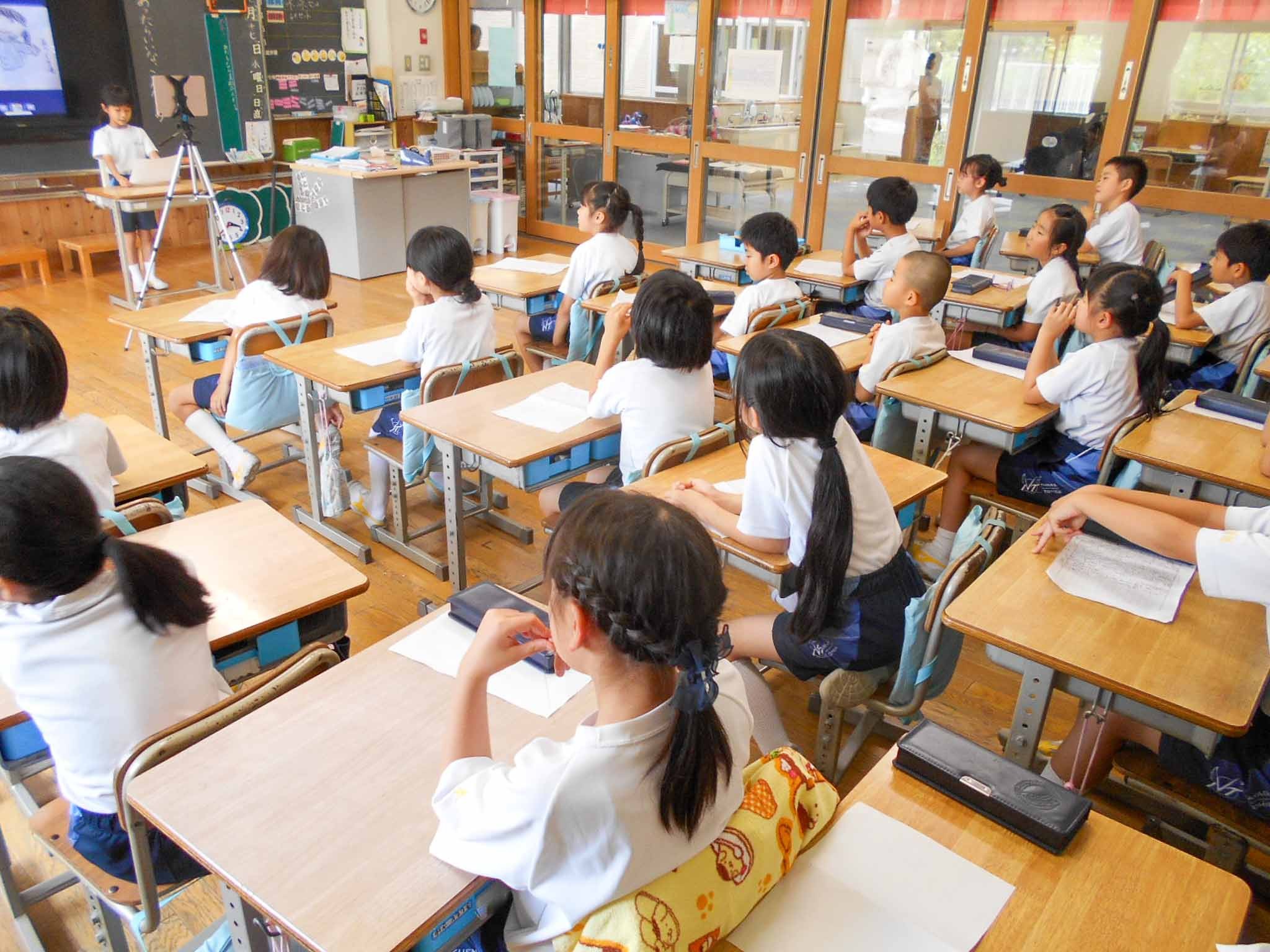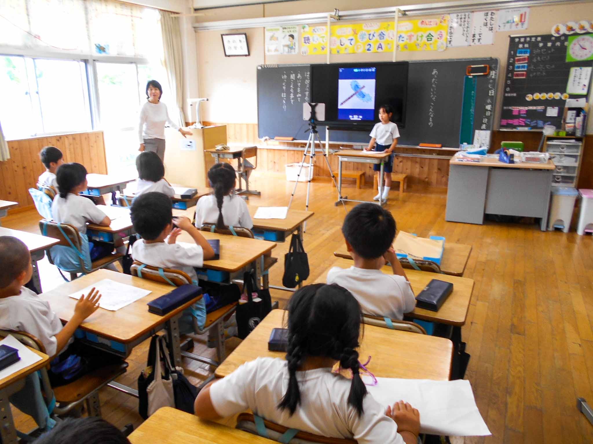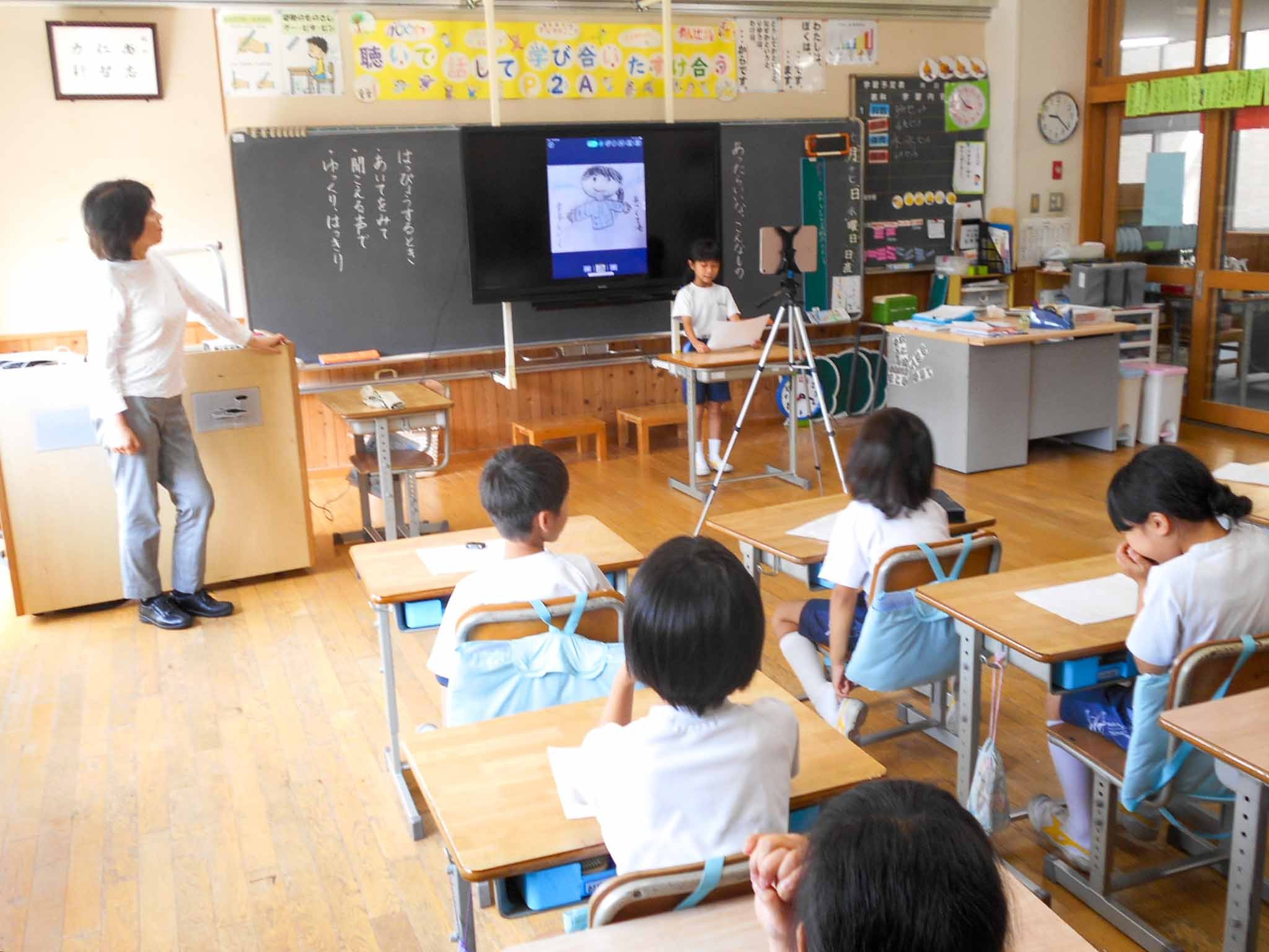 P2生(2年生)の教室に行くと、国語の学習で子どもたちが一人ずつ発表していました。「あったらいいな こんなもの」というテーマで、自分が考えたものの絵をテレビ画面に映し出し、説明していました。