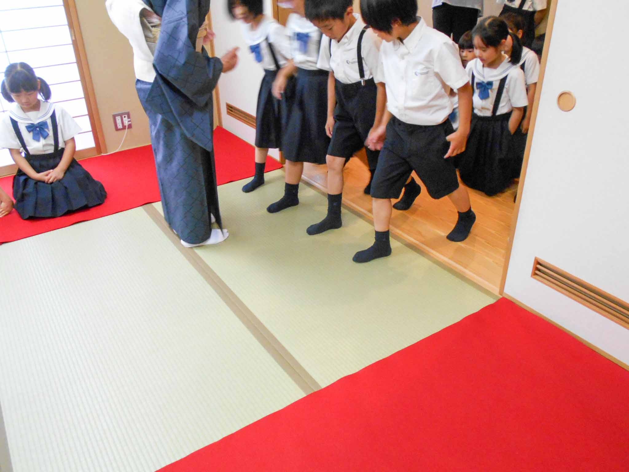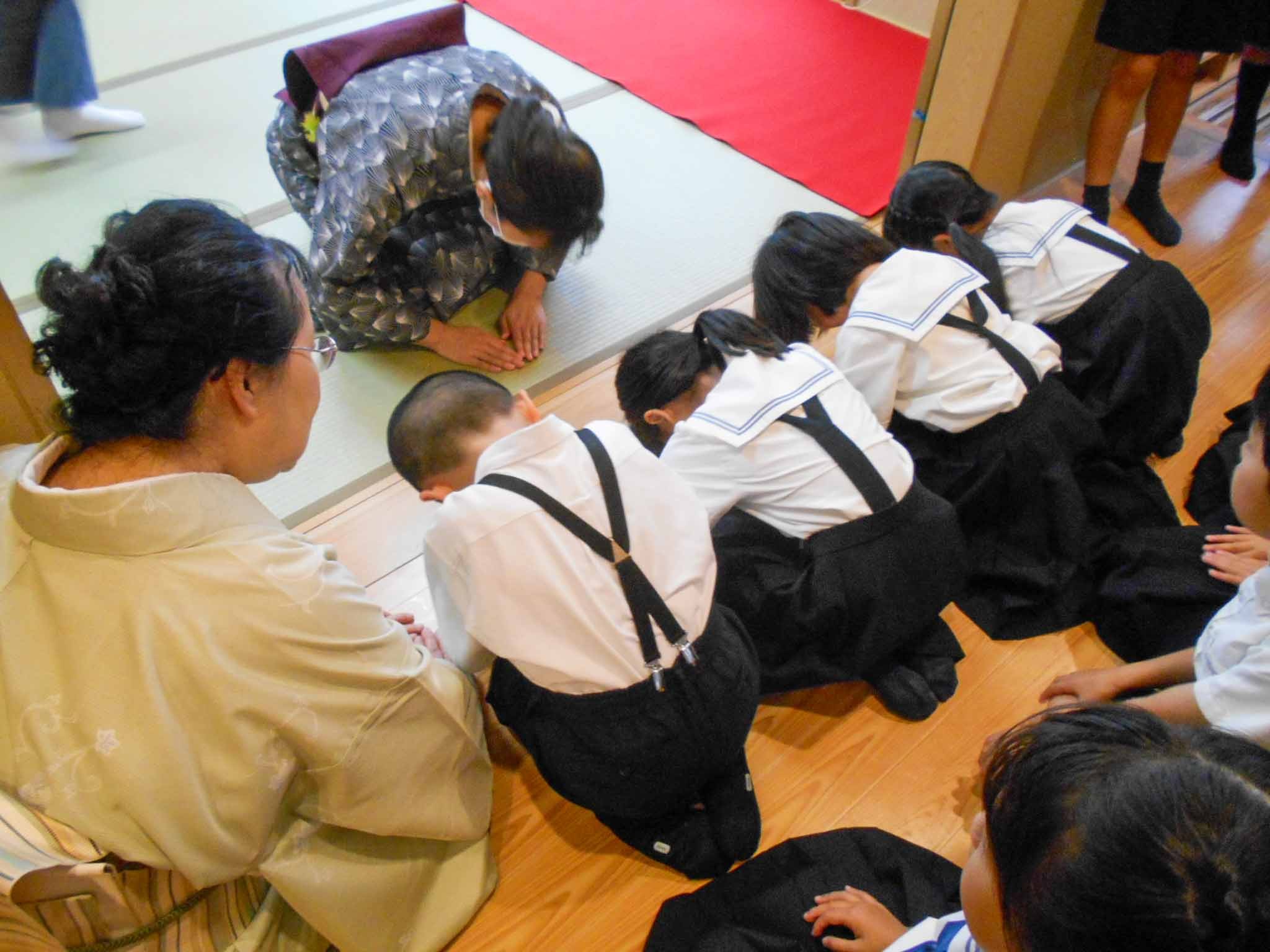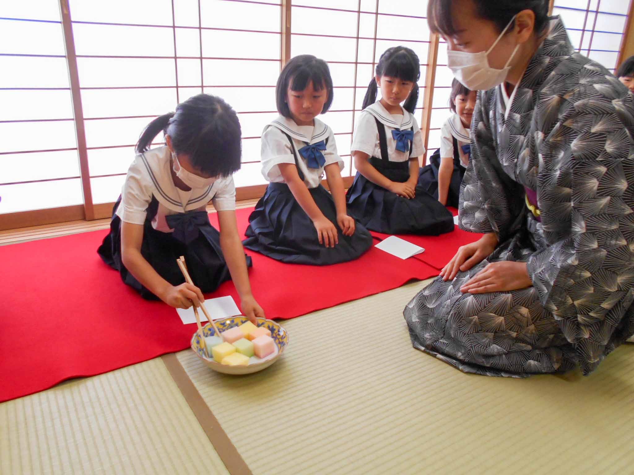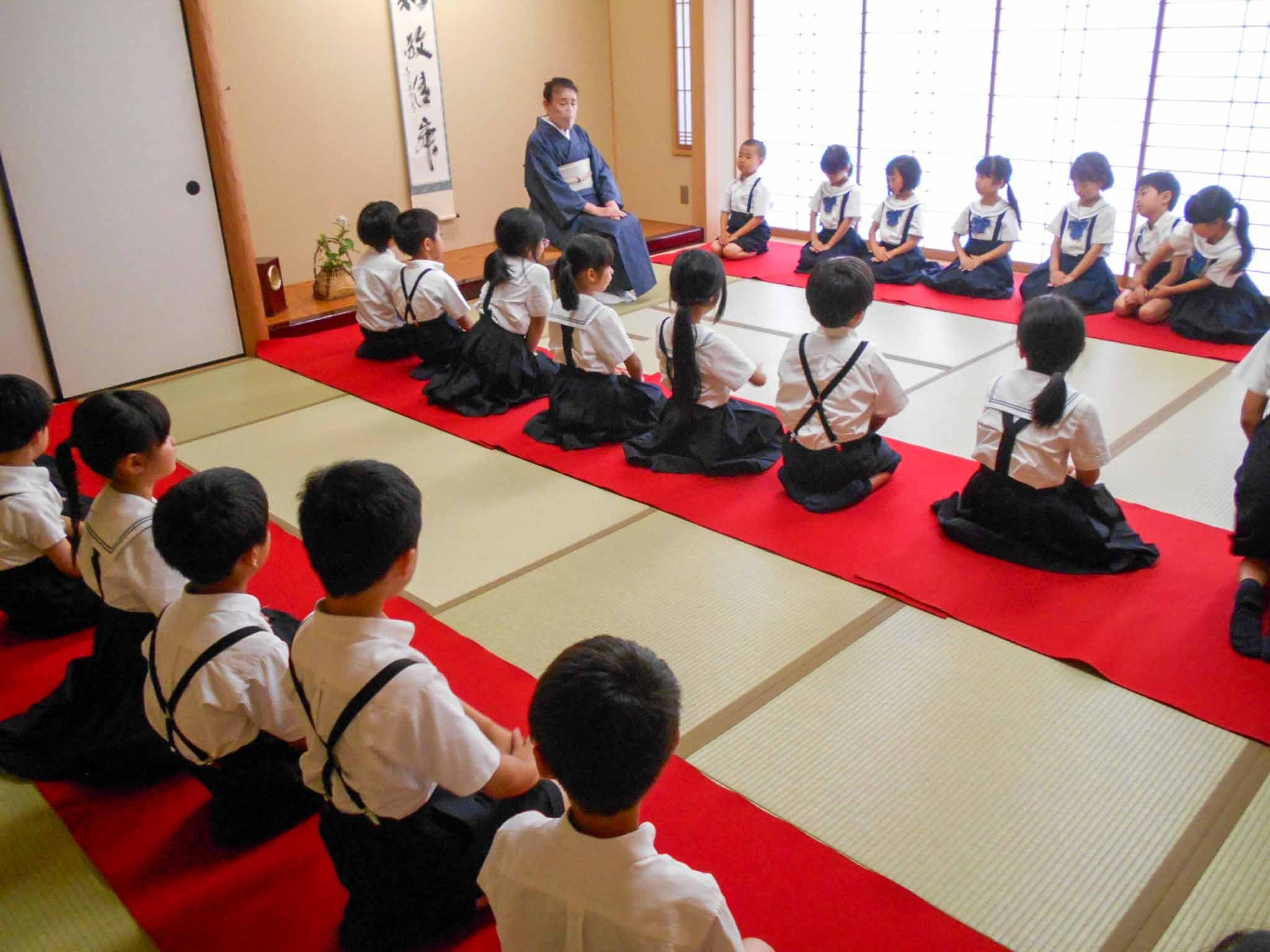 この日は、P2生(2年生)がお部屋への入り方や挨拶、そしてお菓子の頂き方などを教えていただきました。子どもたちはきちんと背筋を伸ばしながら正座をして先生のお話を聞いていました。
