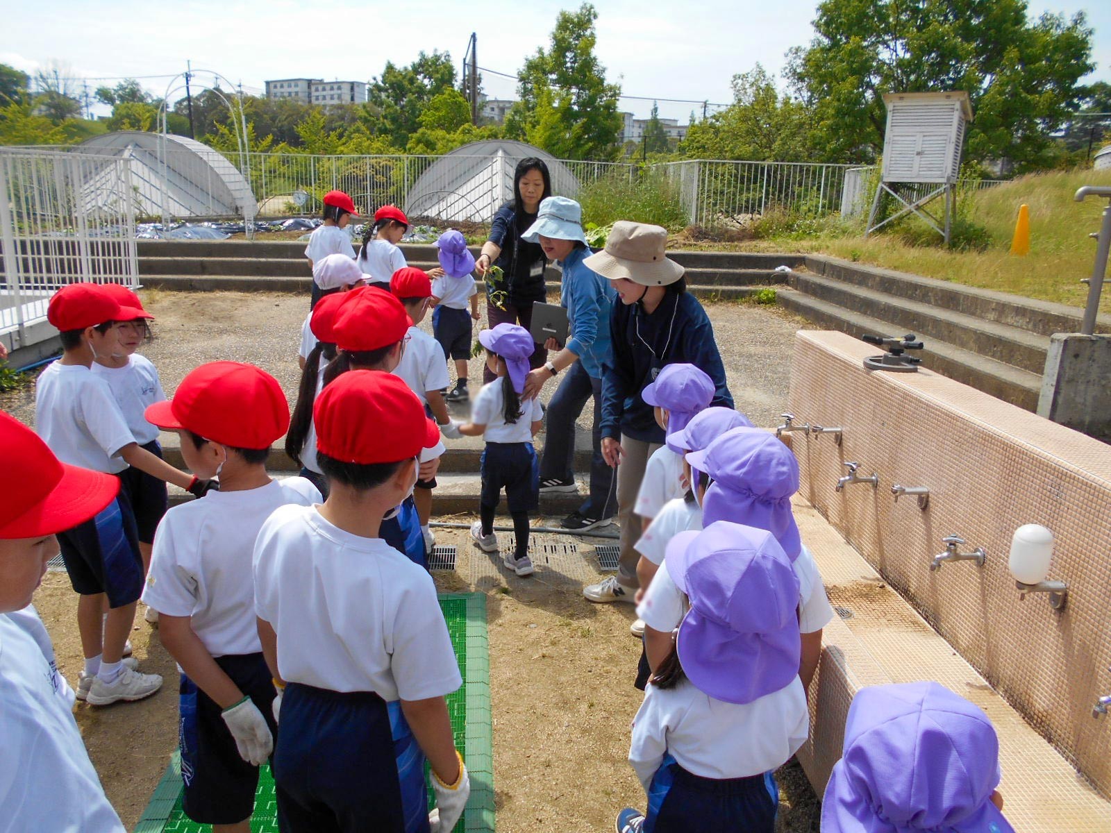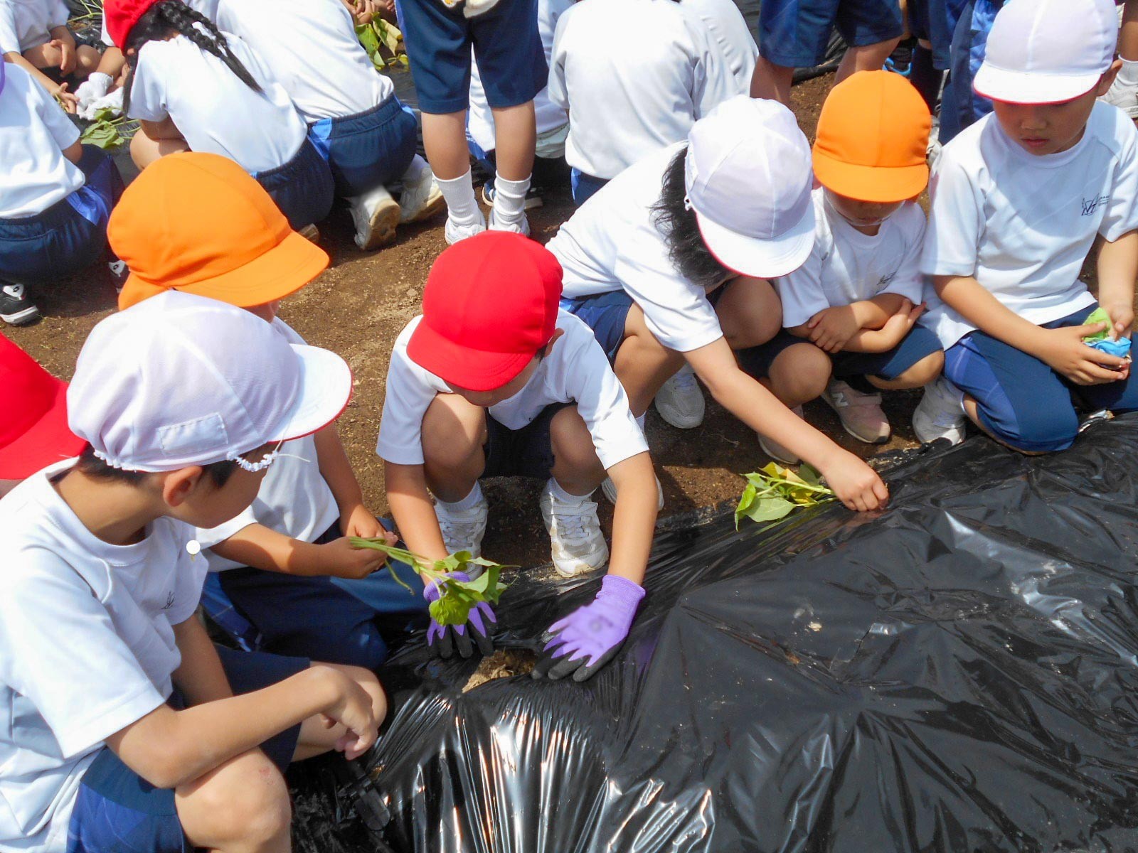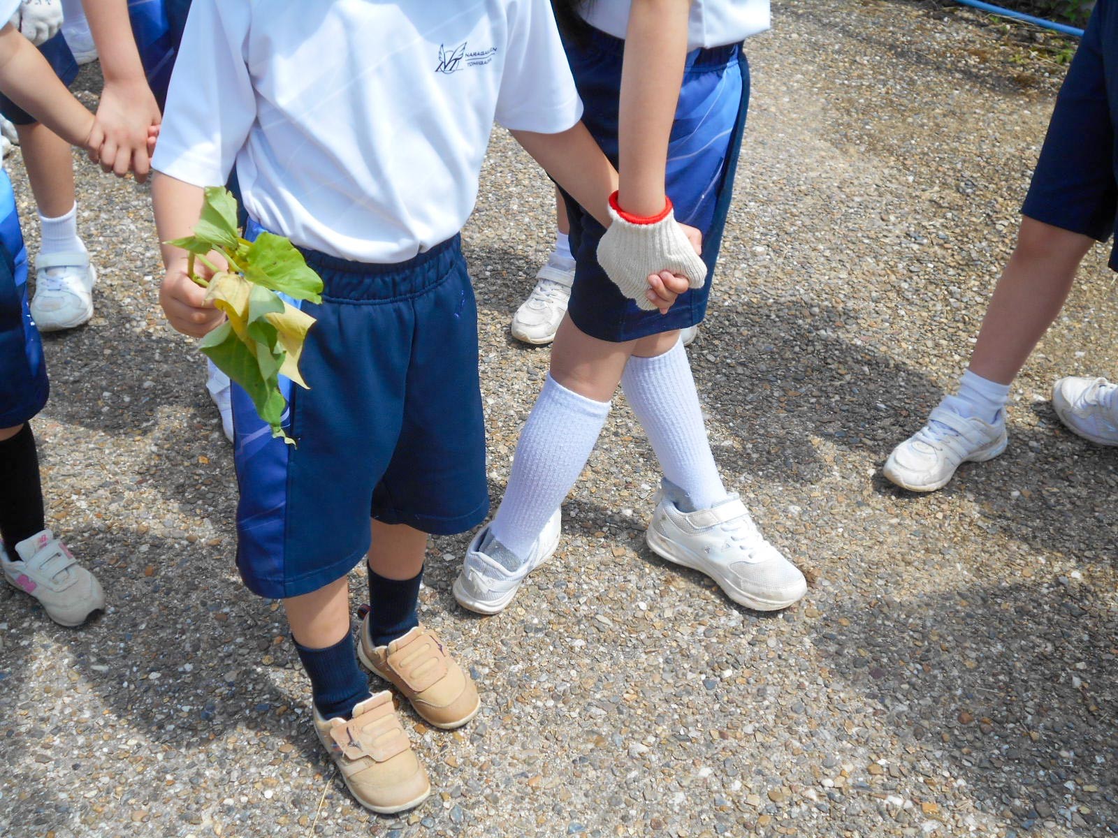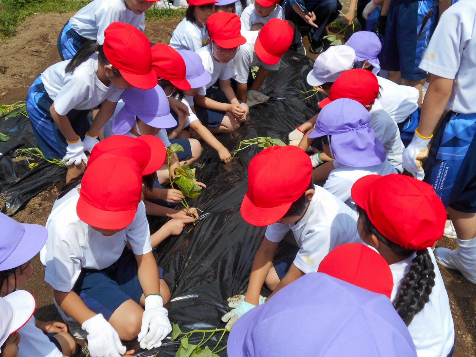 P2生(2年生)と奈良学園幼稚園の園児(年中組)がいっしょになって、サツマイモの苗植えをしました。
