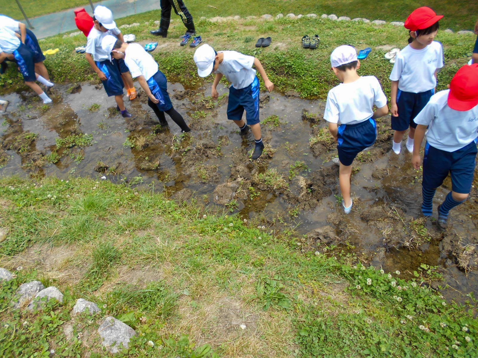 23日には、田の代かきを行いました。水をはった田に入り、自分の足で土を均しました。子どもたちは、最初は戸惑っていたようですが、少しずつ慣れるととても楽しそうです。