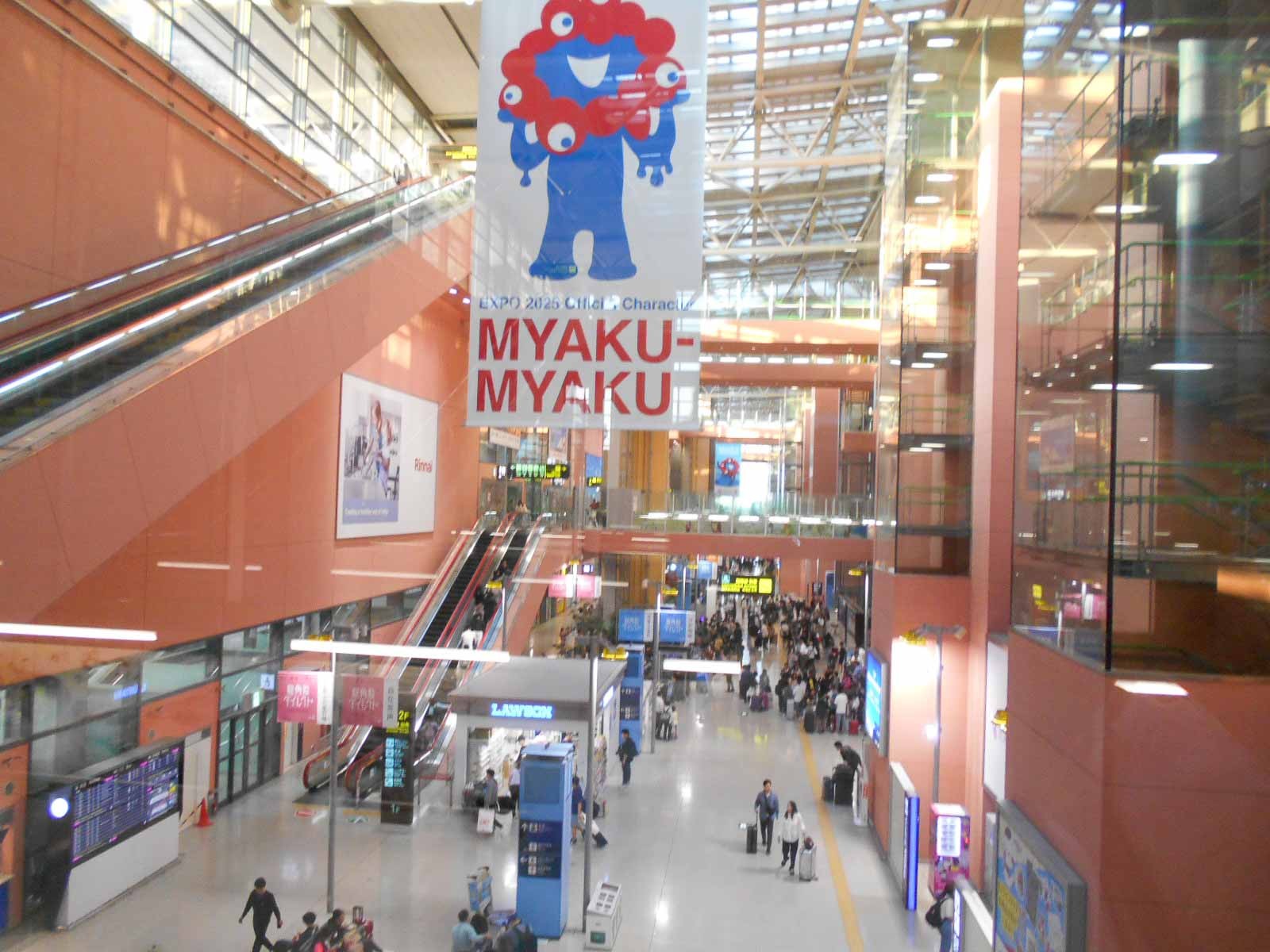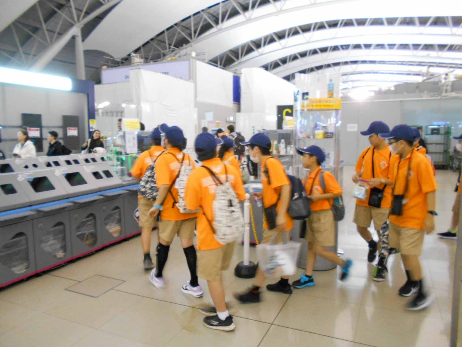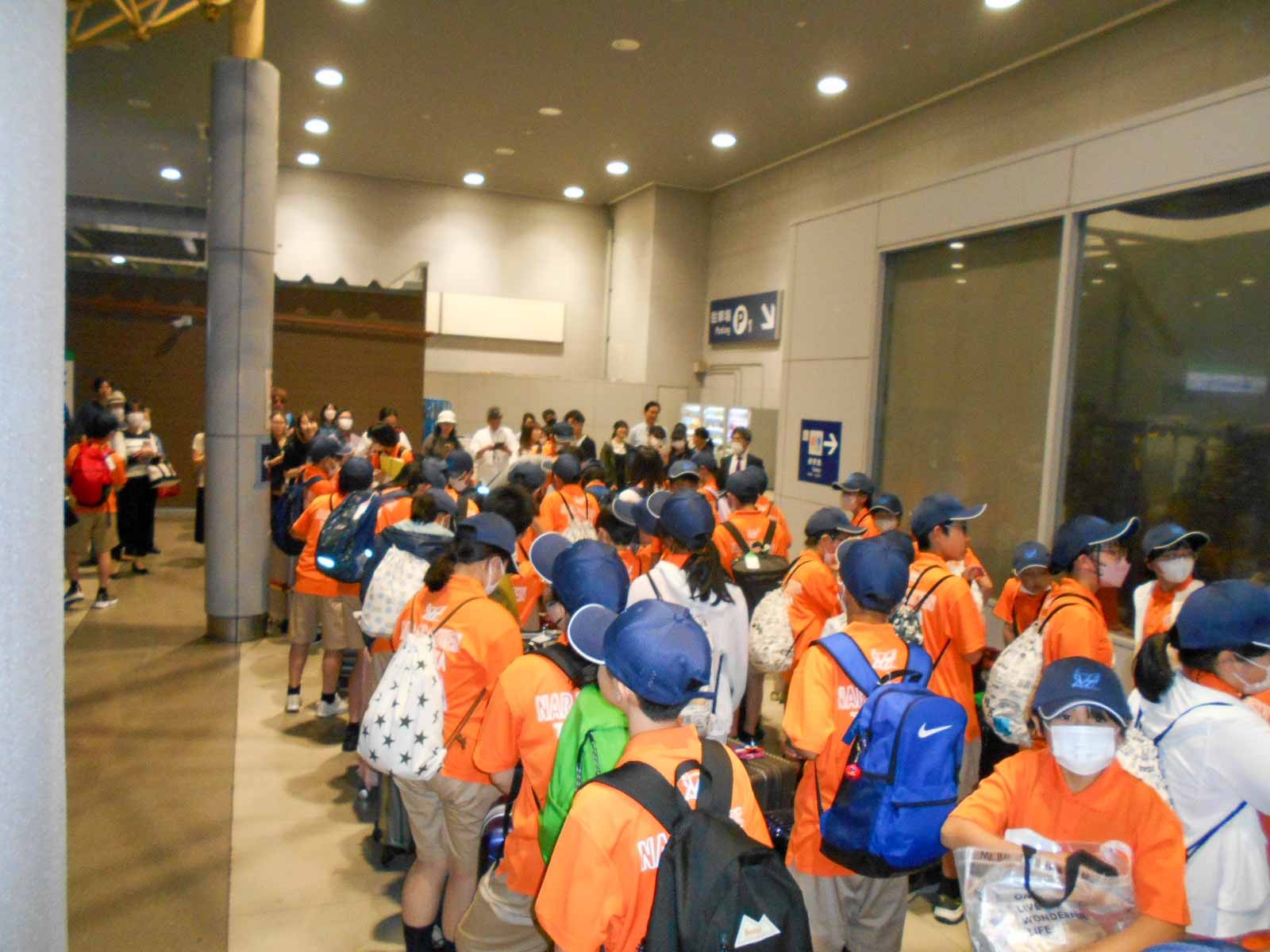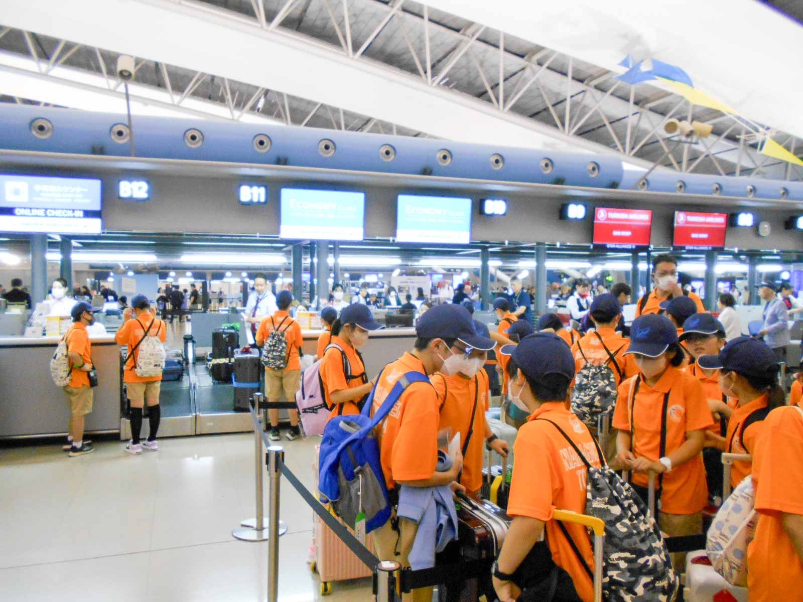 オレンジ色のポロシャツを着た子どもたちが関西国際空港に集合し、出発式を行いました。その後、チェックインカウンターへ行き、大きな荷物を預けた後、手荷物検査場及び出国審査場へ。