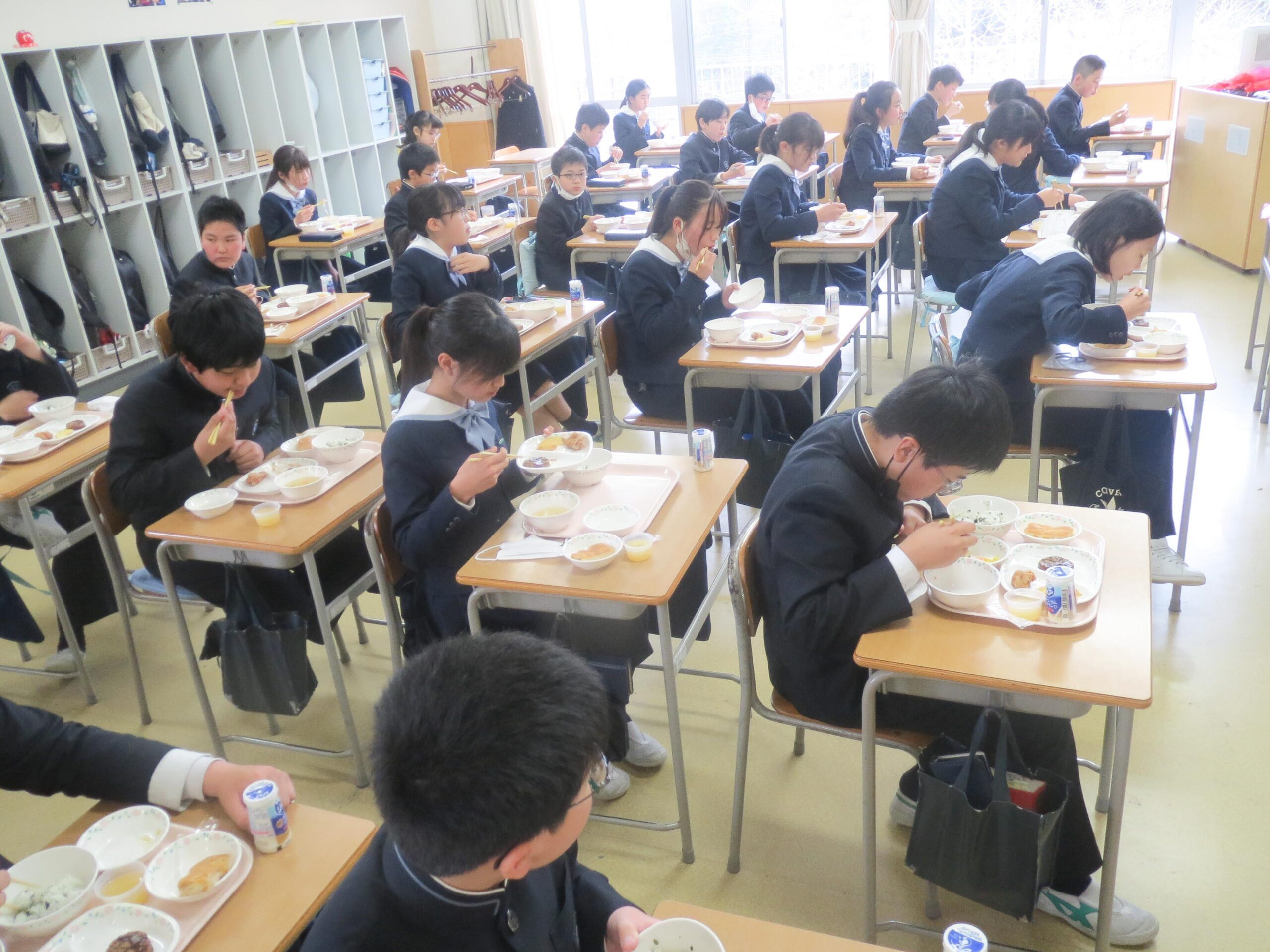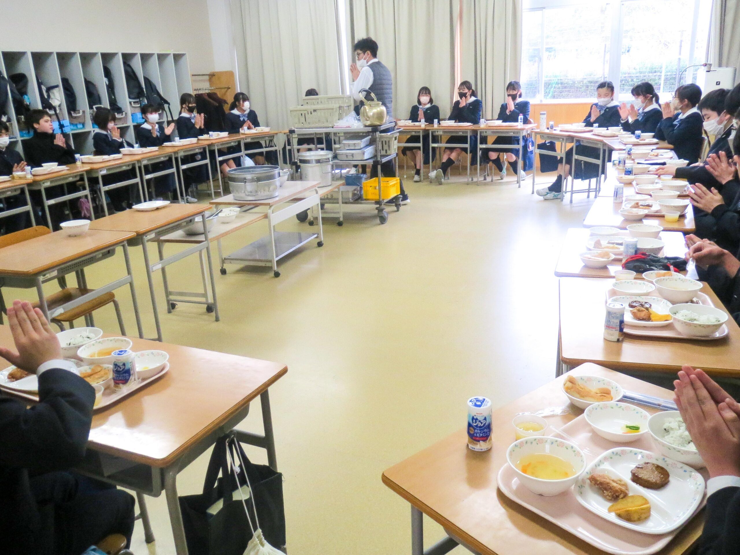 大好きなメニューに大喜びのM2生。「みんなで輪になって食べよう!」として机を移動させたクラスもあれば、速く食べたいから机を移動する時間ももったいない、というクラスもあり…。いずれにしても、美味しくて、大喜びの子どもたちでした!