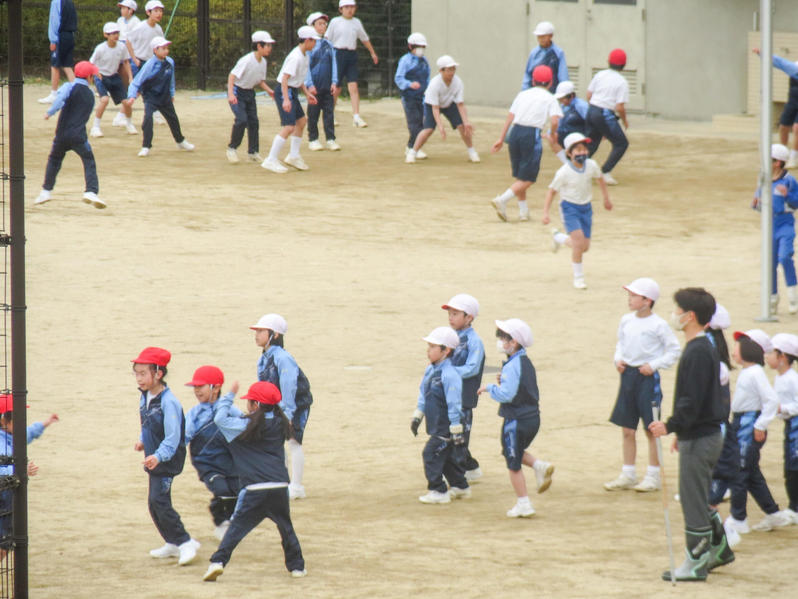 3月の昼休み。もちろん非常に寒い日ではなかったこともありますが、たくさんの子どもたちが運動場で遊んでいます。ドッジボールやおにごっこ、ブランコなどをしている中に、教員も複数一緒に遊んでいます。けがなどの急な対応が必要な時に、学年に関係なく対応したり、5時間目の準備にスムーズに入れるように必要に応じて声をかけたりしてくれているのです。時間が来ると、これまた走って昇降口に向かう子どもたちです。