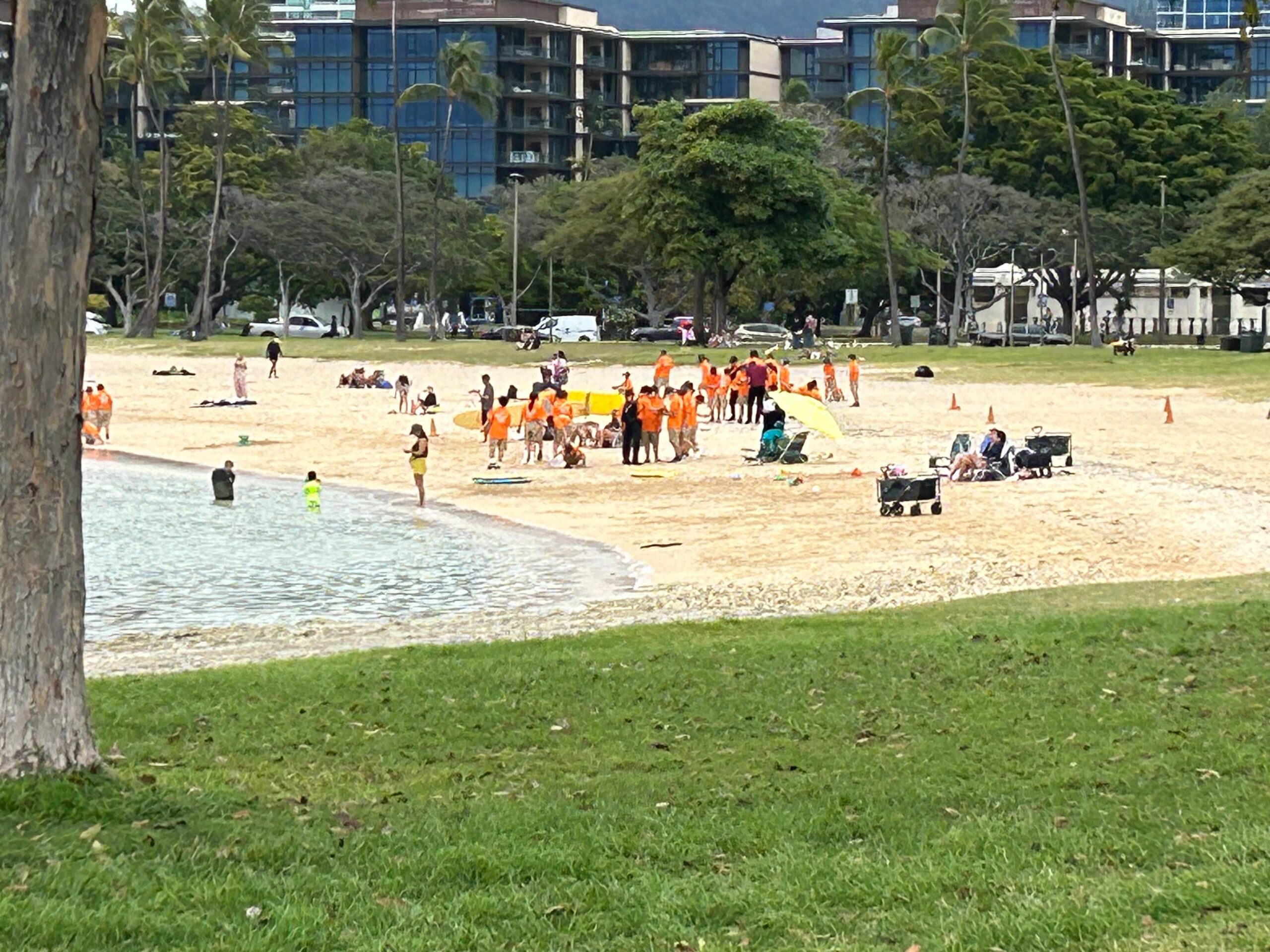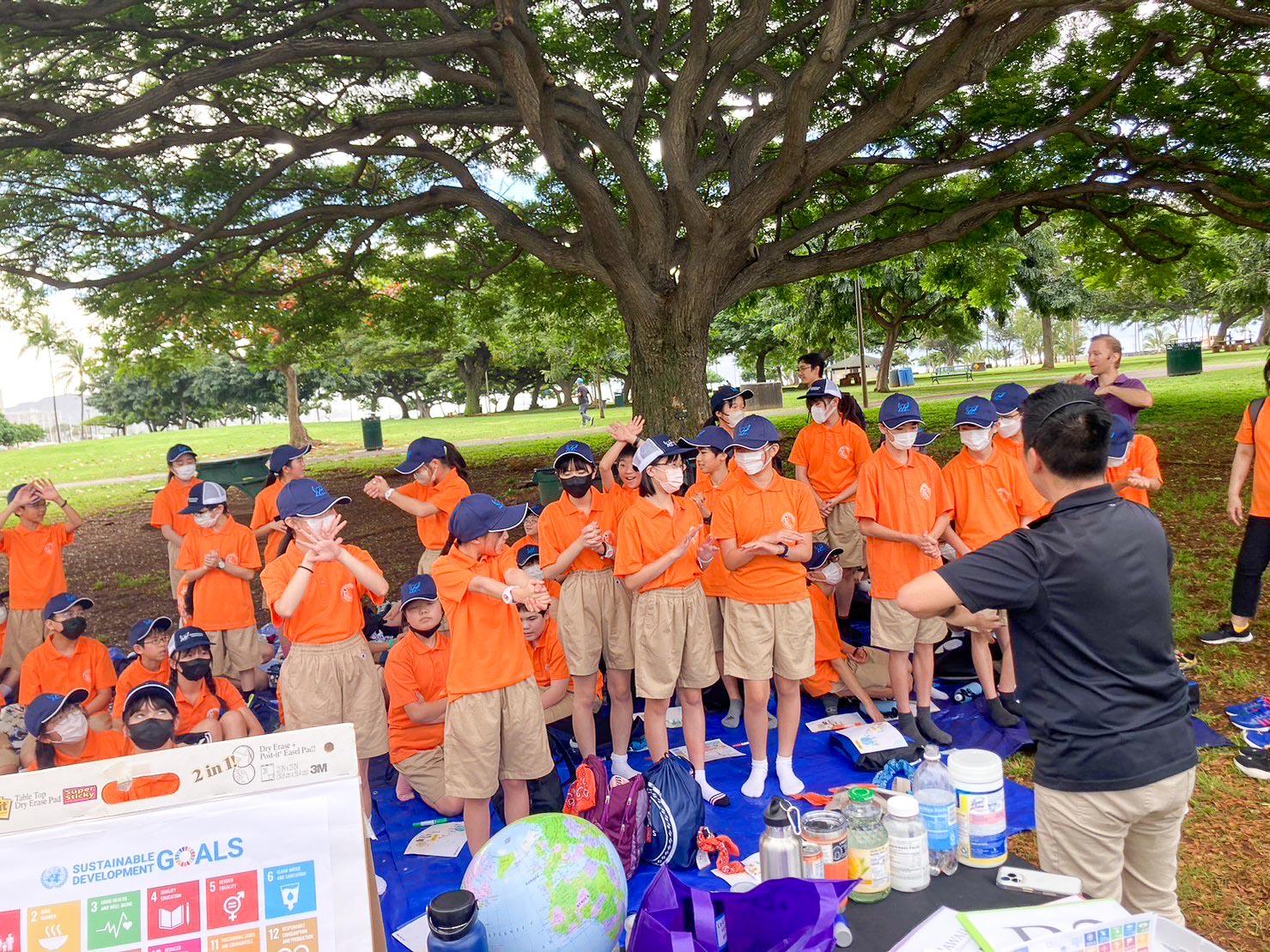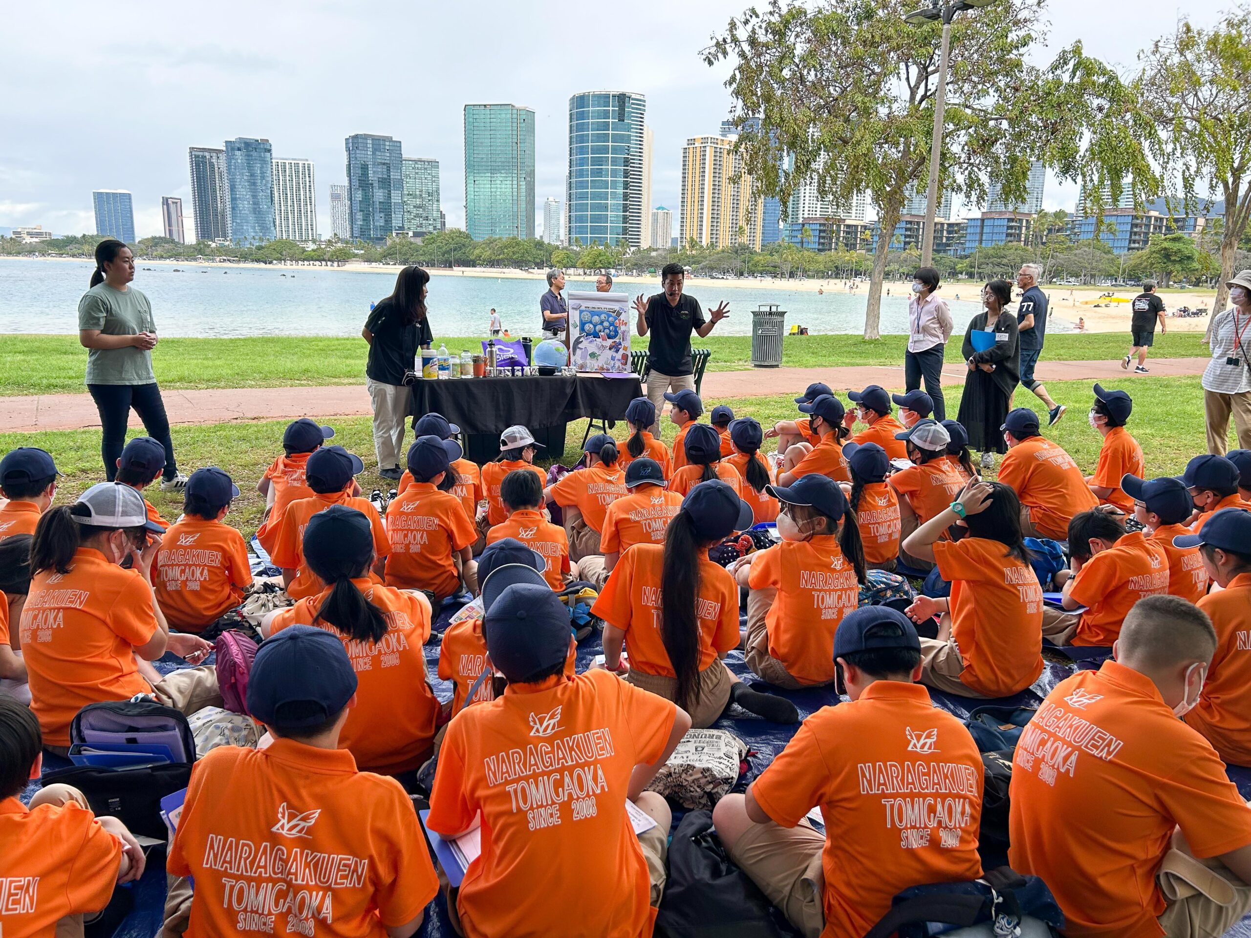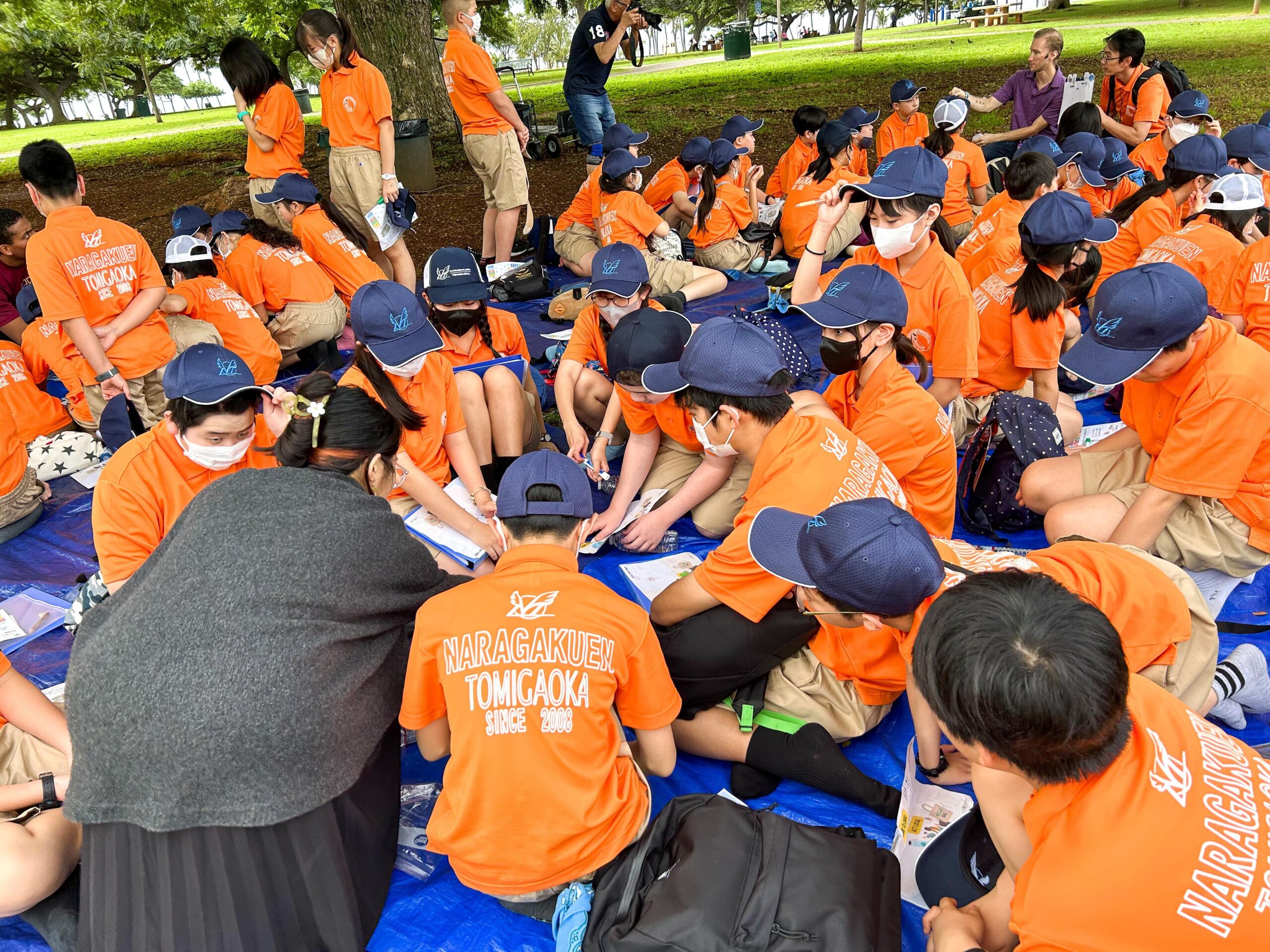 アラモアナビーチパークでハワイ大学の学生さんたちにリードしてもらいながら、LbEプログラムというSDGsの考えに基づいた、ハワイでの環境学習に取り組みました。学生さんの中には日本語もわかる人もいるのですが、できるだけわかりやすい英語を使いながら説明が続きますので、そんな時間があるというだけでも子どもたちにとっては有意義な時間となりました。