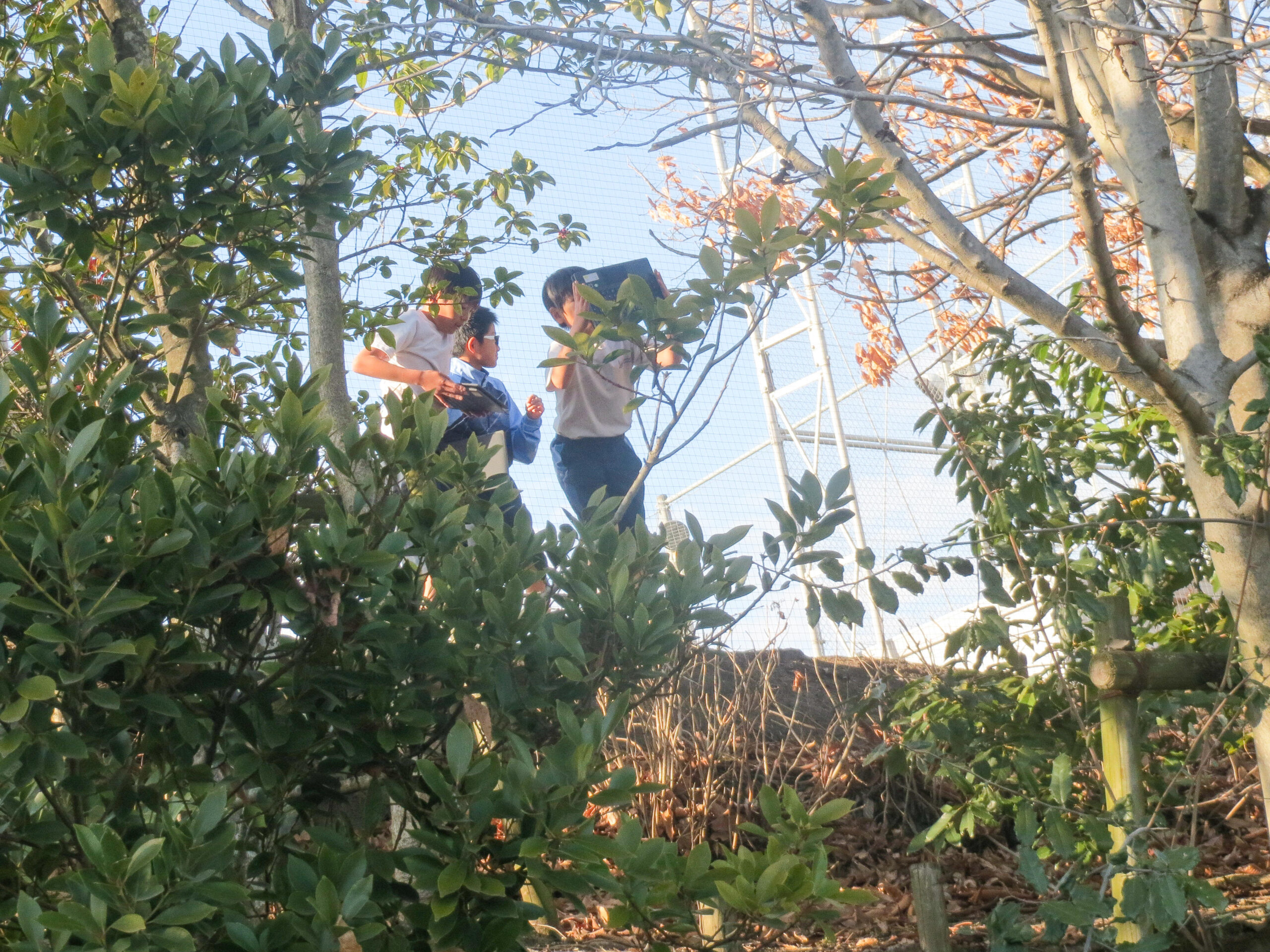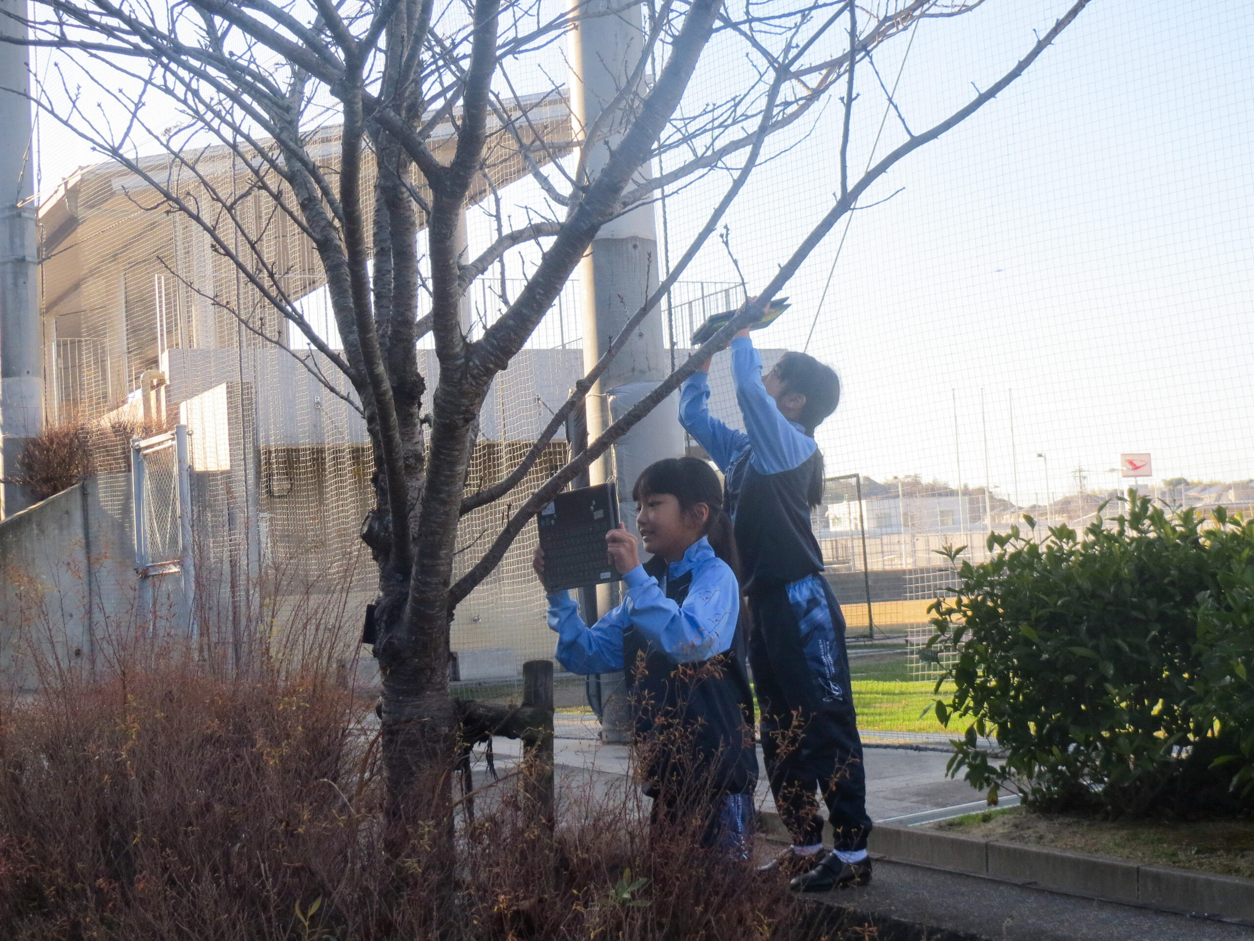 P4(小学4年)生が、クロムブックをもって昇降口から出てきました。「何をするの?」と聞くと、「冬の木の観察をします」とのこと。