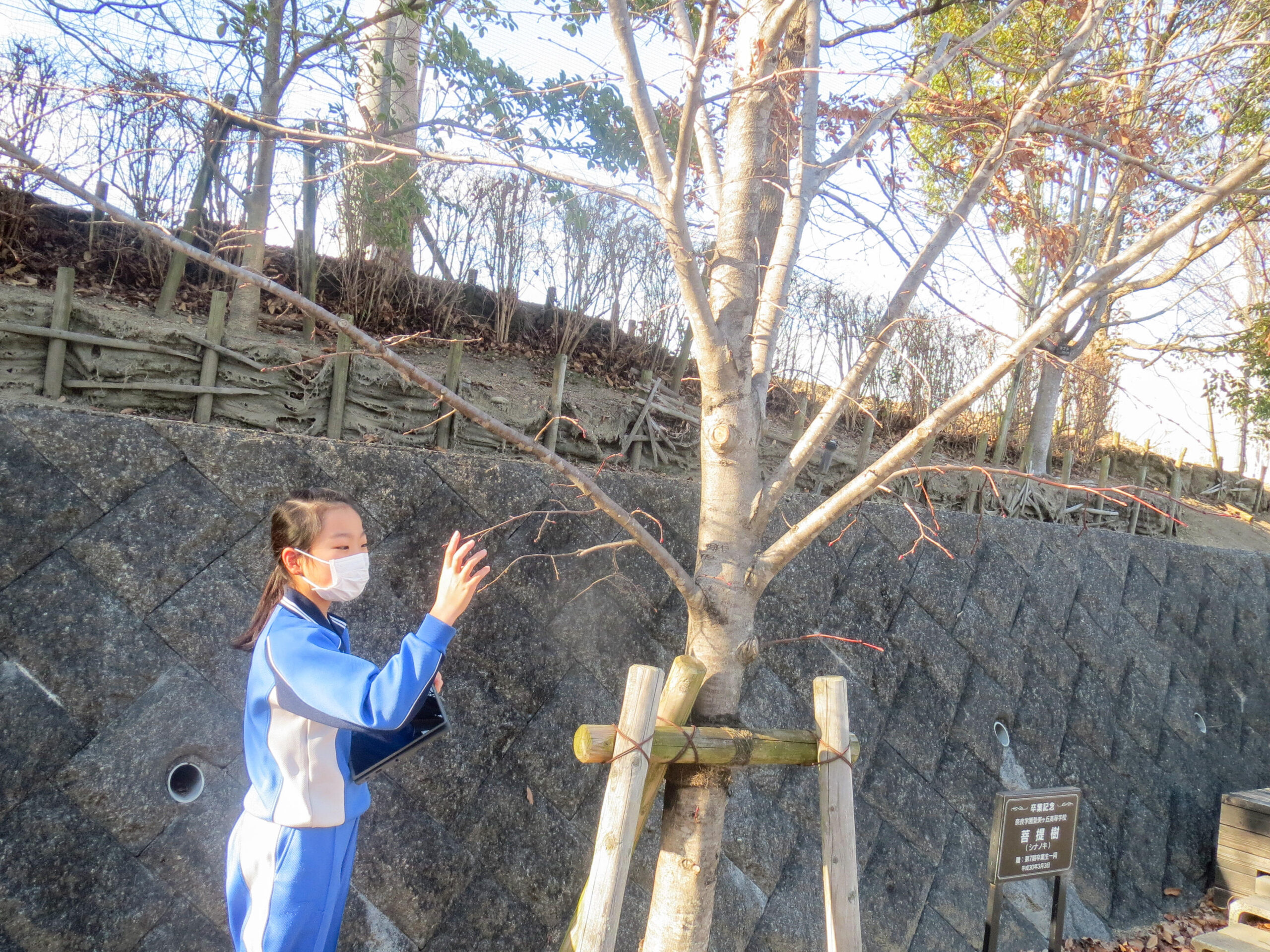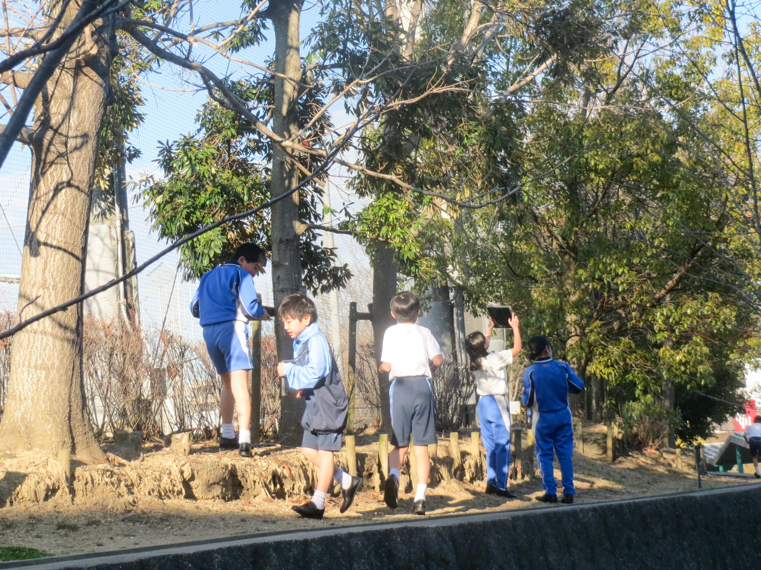 4年生の理科では、「季節と生き物」の様子を春、夏、秋と継続して観察してきました。決めていた自分の木の冬の様子を観察して、一年間の変化をまとめようとしているのです。特に冬芽に注目しているようで、自分の木だけでなく、いろいろな木のまだ固い冬芽を見つけては写真を撮る子どもたちでした。冬の季節にはすべてが動いてないように思えますが、焦点を当てると春を待つ木々の営みを感じ取ることができるのです。