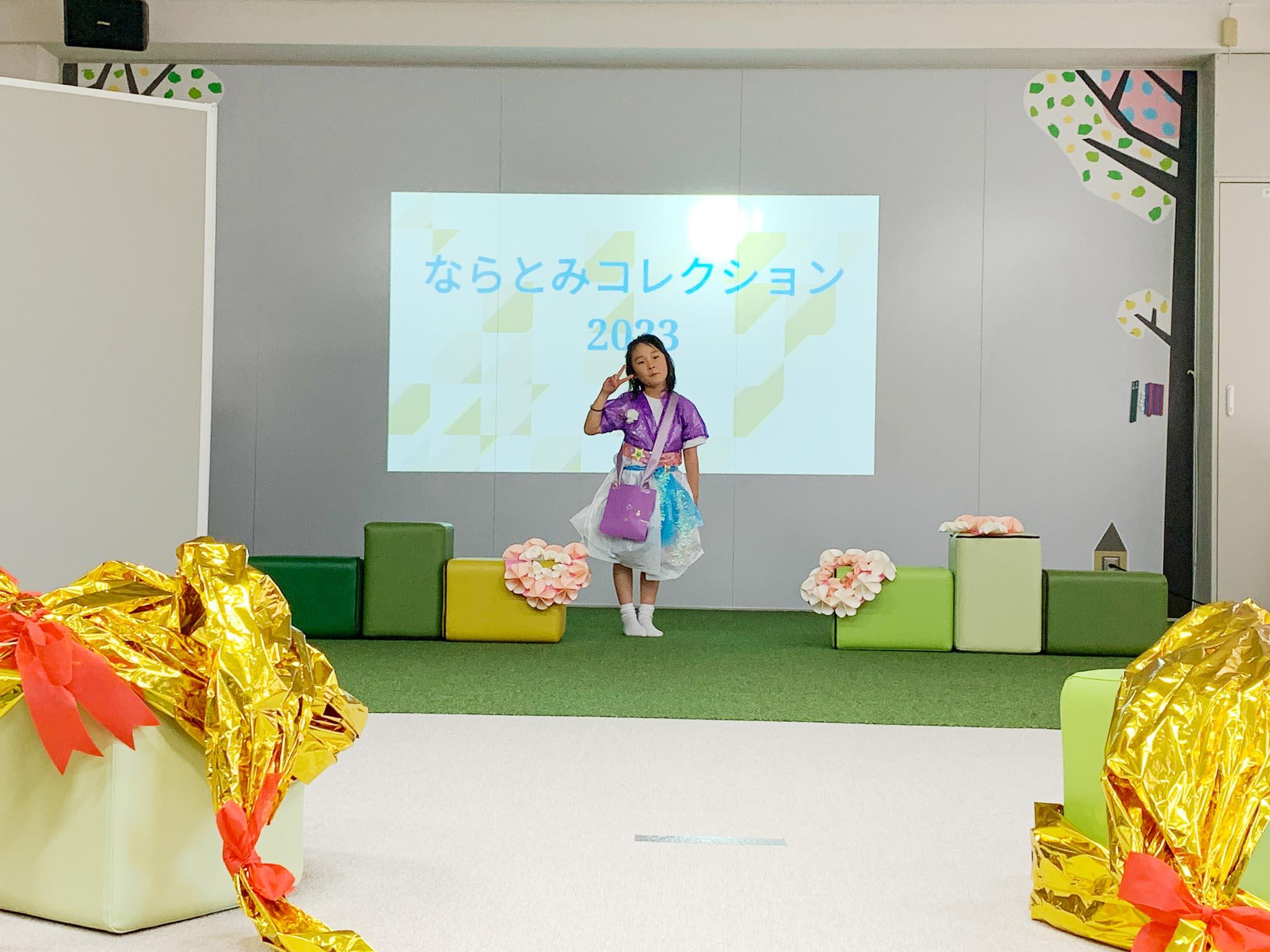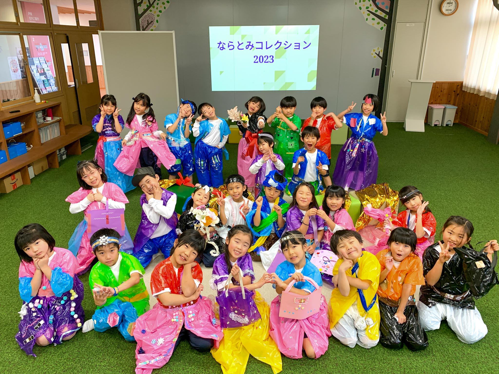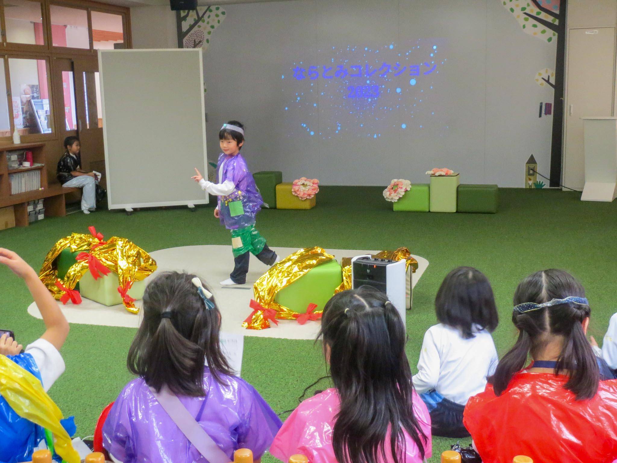 P1(小学1年)生が、生活科の学習で、秋の実りで手に入れたドングリやはっぱを使っていろいろなものを作ったことをきっかけに、身近なものを使ってファッションショーをしよう、ということになりました。
