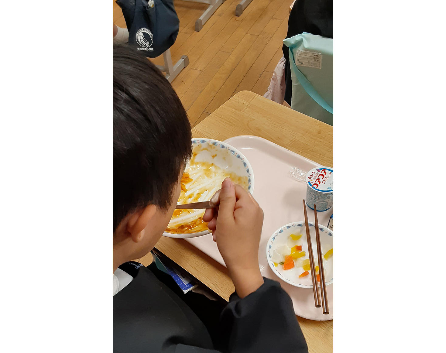 本校の給食は、校舎内にある食堂で作ったあたたかくて美味しい給食です。美味しく「食べる」ことはもちろんですが、「食育」としていろいろな食材の話などを聞いて食べる、という機会も定期的に位置づけています。