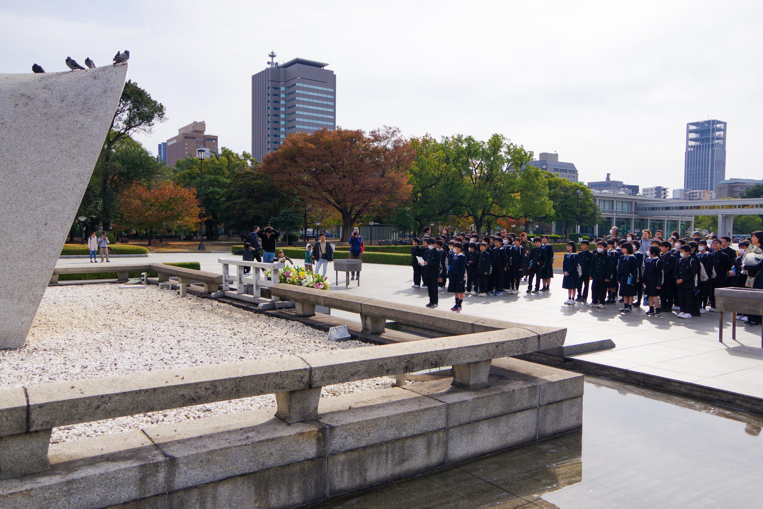 広島の宿泊学習二日目は、原爆資料館の見学から始まりました。事前学習で知りたいこと、見たいことをしっかりもってこの地を訪れた子どもたちです。資料館の中の一つ一つの展示を食い入るように見つめ、説明を読み進めていました。もっと時間がほしい、というつぶやきが子どもたちからは聞かれるほどでした。さらに、被爆された方の伝承者のお話を聞いたり、慰霊碑に献花したりして、多くの学びを得た広島平和公園を後にしました。