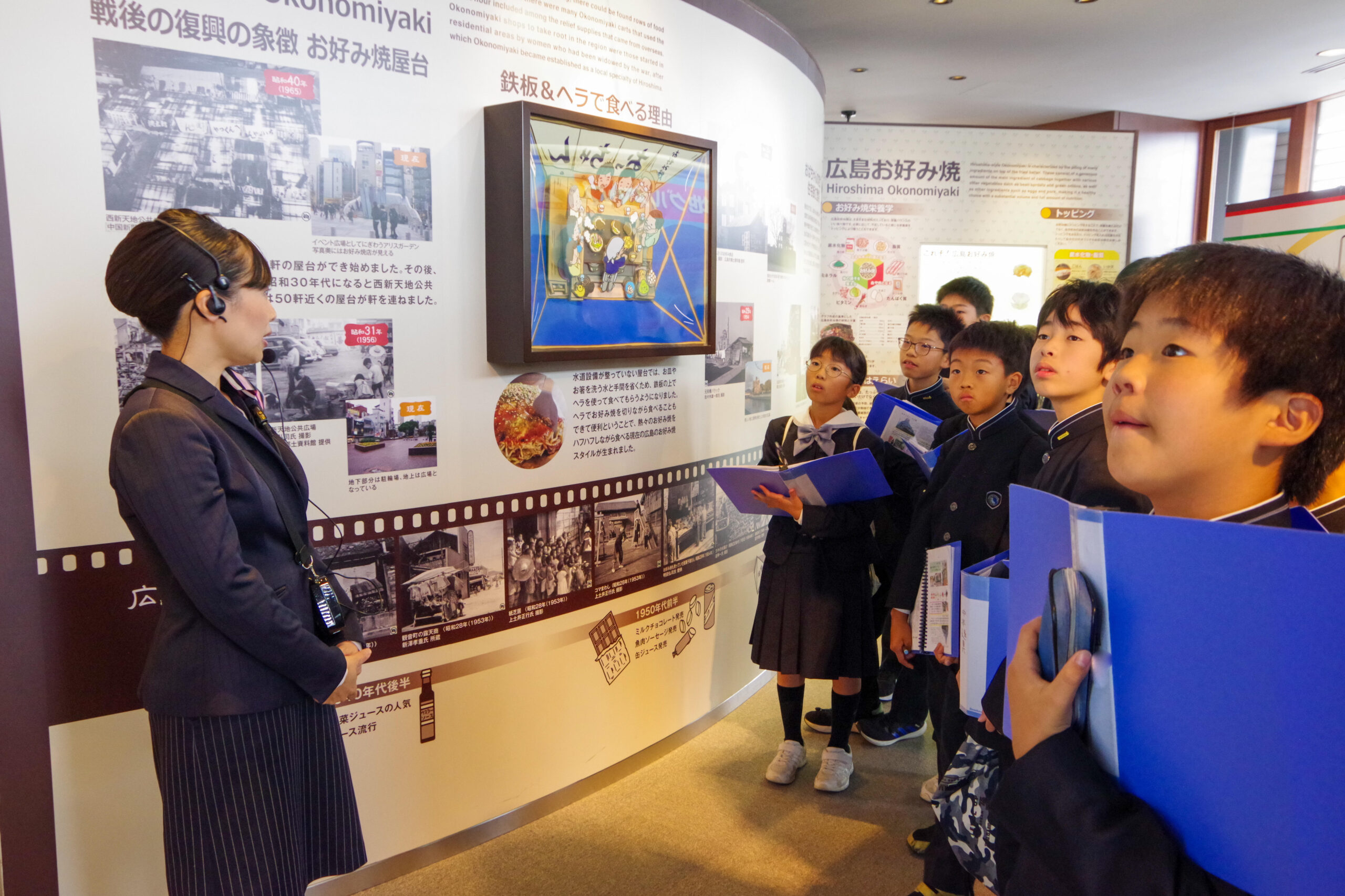 そして訪れた「お好み焼館」。ここでも、戦後の生活とお好み焼きとの関係について学び、その後は、お好み焼きを作って食べる時間です。上手に説明をしてくださるので、全員が腕のいいコックさんです。美味しくお好み焼きを焼き、いただくことができました!