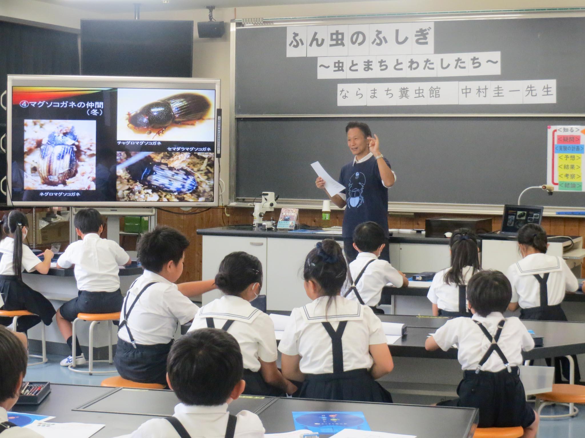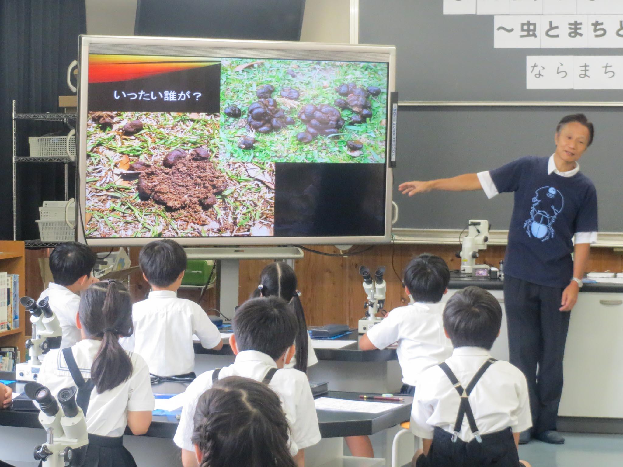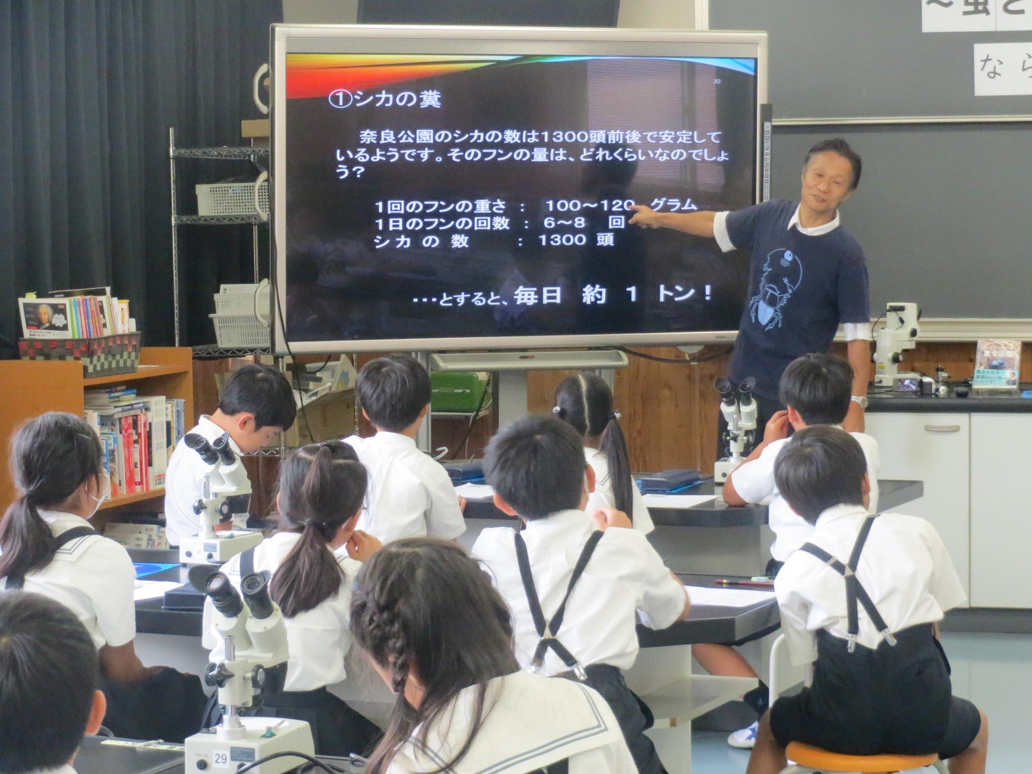 ならまち糞虫館の中村館長に来ていただき、理科で昆虫の学習をしたP3(小学3年)生にお話をしていただきました。テーマは、「ふん虫のふしぎ ~虫とまちとわたしたち~」です。約160種いるといわれる日本の糞虫をスライドで見たり、中村館長が奈良公園で採取した糞虫を双眼実体顕微鏡で観たりした子どもたち。その後に、奈良の鹿は約1300頭前後いて、毎日約1トンの糞が出ている…、でも糞だらけにならないのはなぜだろう、実は糞虫が分解しているおかげで奈良公園の環境が保たれているんだよ、などという話もしていただき、夢中になって聞いていました。「糞虫を始めて見られてうれしかった」「奈良公園のたくさんの鹿の糞を糞虫が処理しているのはすごいと思った」などの声が聞かれた子どもたちでした。