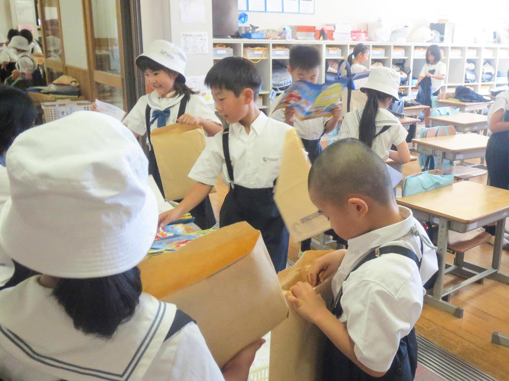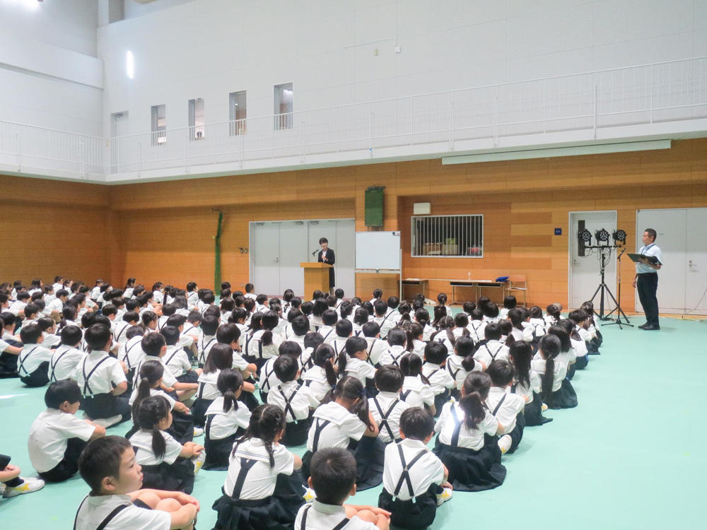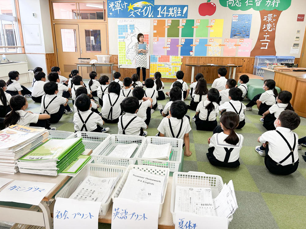 教室の前に準備された場所を確認しながら宿題や制作物を提出する子どもたちです。全員がそろうと、体育館で始業式です。みんなが元気に登校できたことを喜びながら、2学期に頑張ってほしいことを子どもたちに伝えました。始業式の後には、学年で集まって学年集会。各学年の先生たちからも、2学期を見通して子どもたちへの語りかけが行われていました。