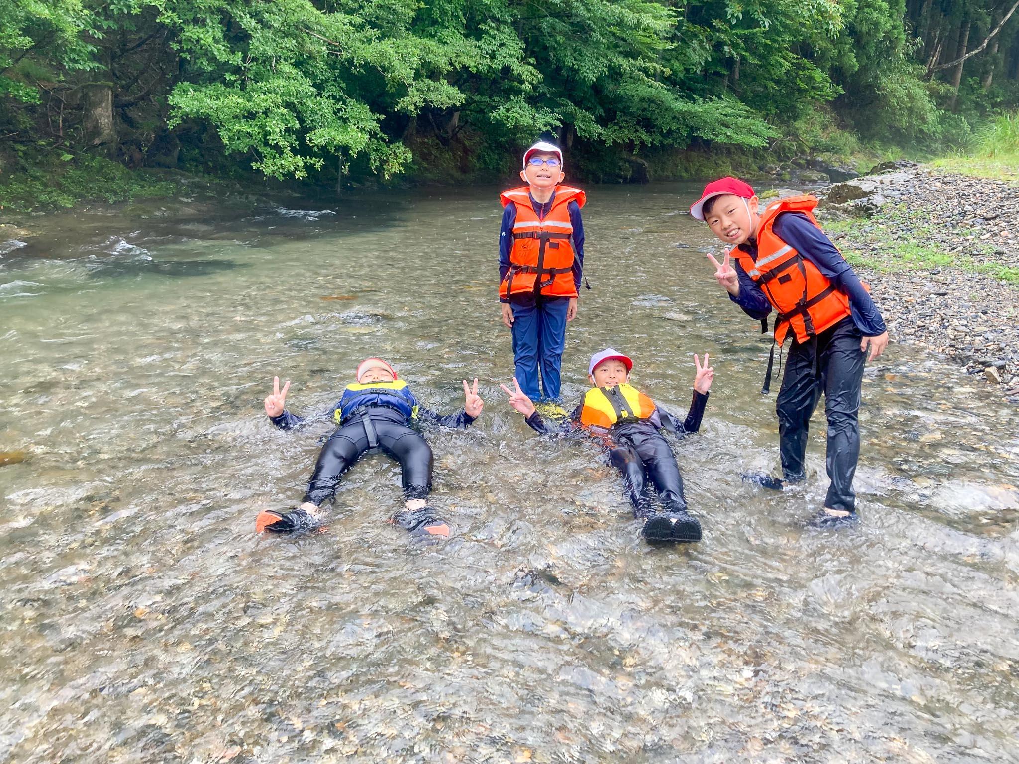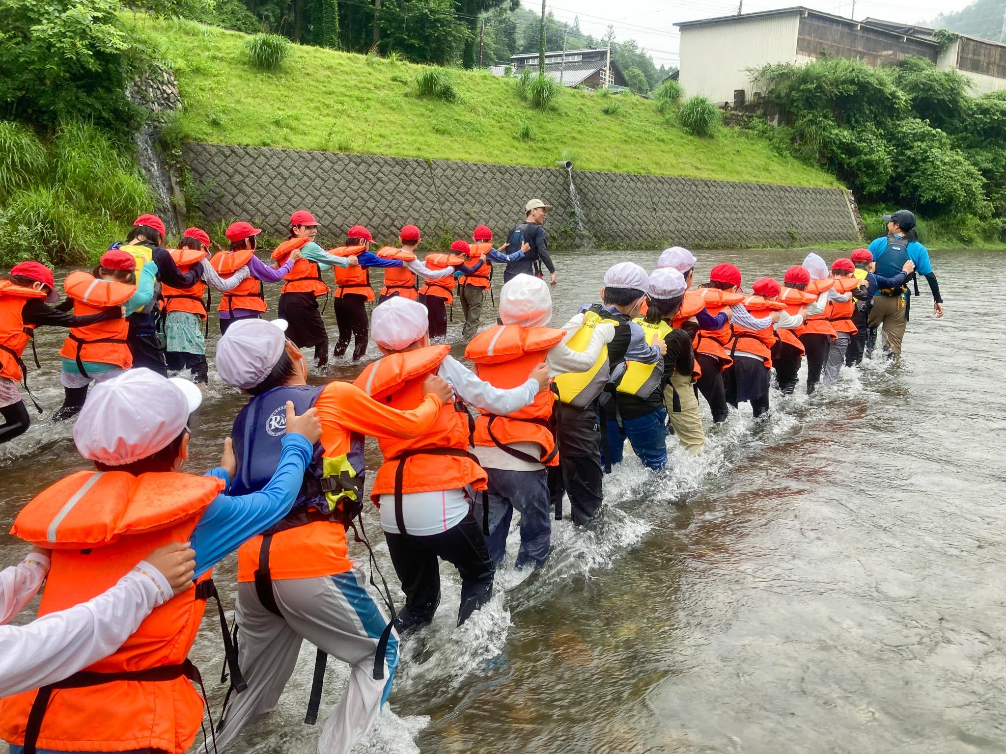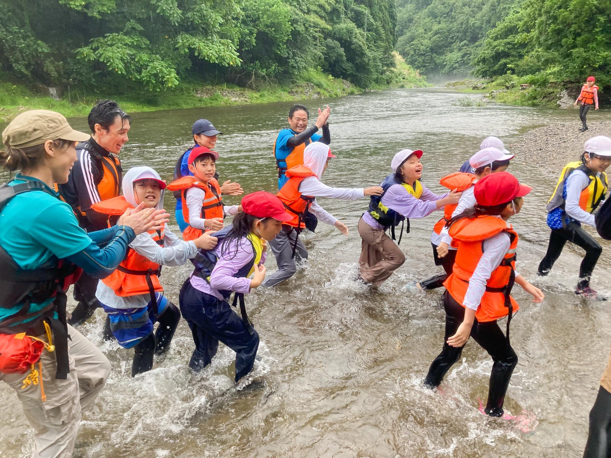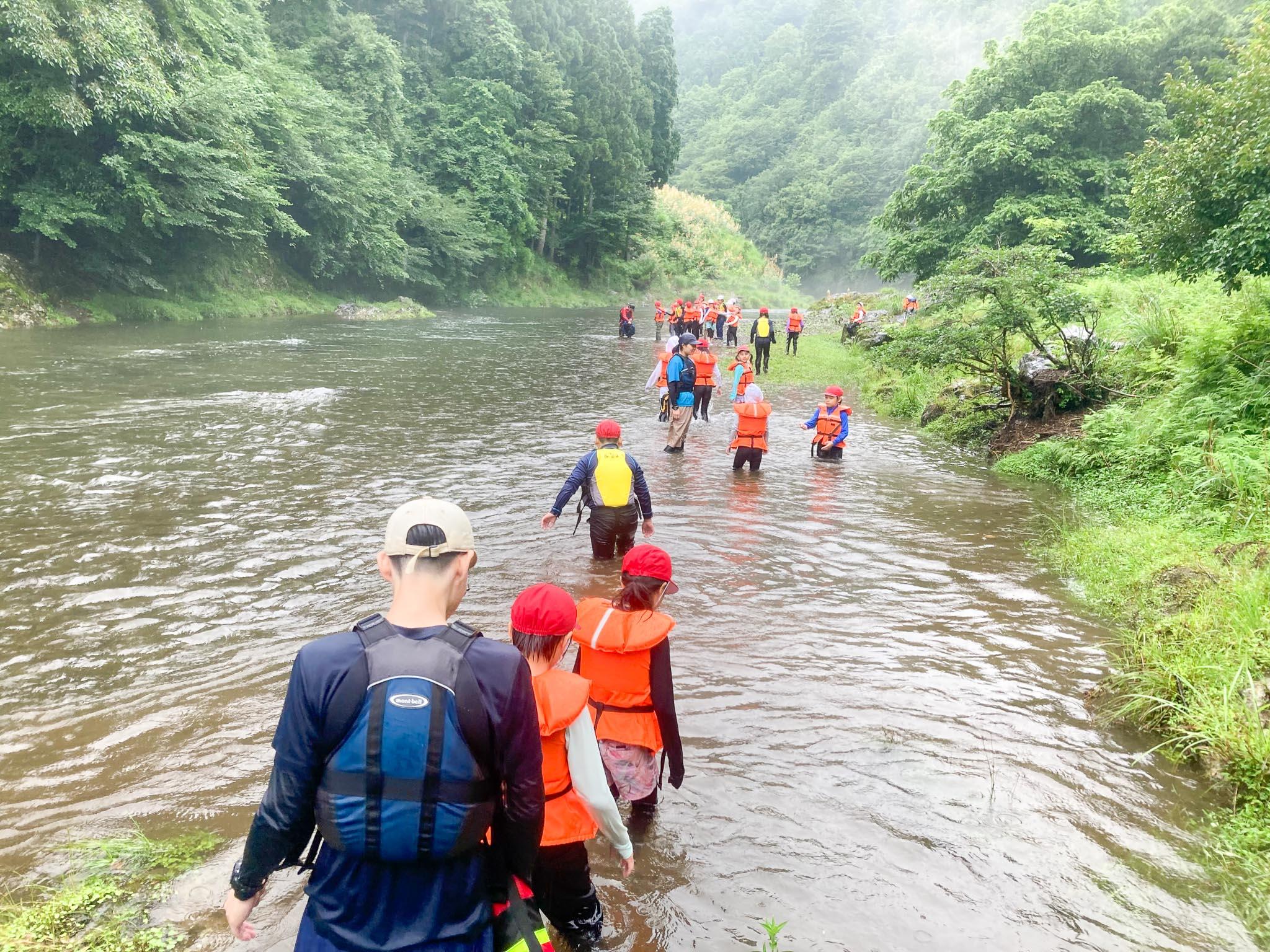 川で流された時のライフジャケットを使った浮き方やロープを使った救助の仕方など教えてもらいました。その後、みんなで協力して上流に向かって歩き、川の流れに身をまかせて下流まで流れて戻りました。川の流れに乗って流されたり、生き物やきれいな石を見つけたり、川遊びを楽しみました。
