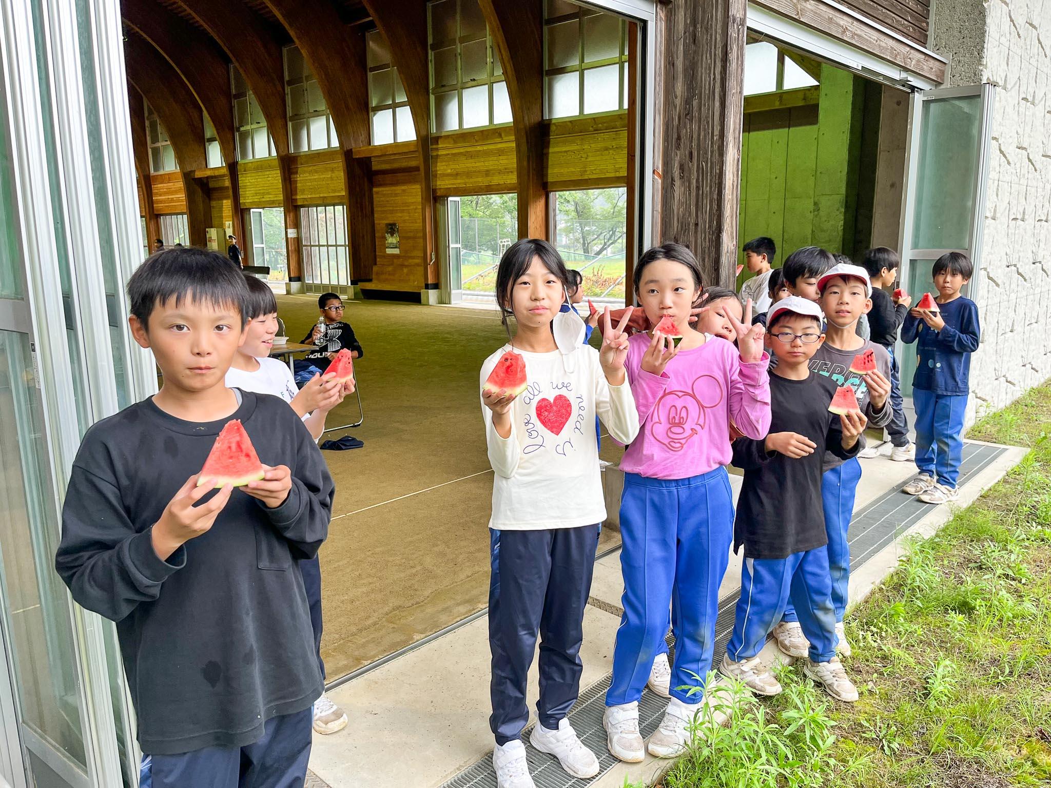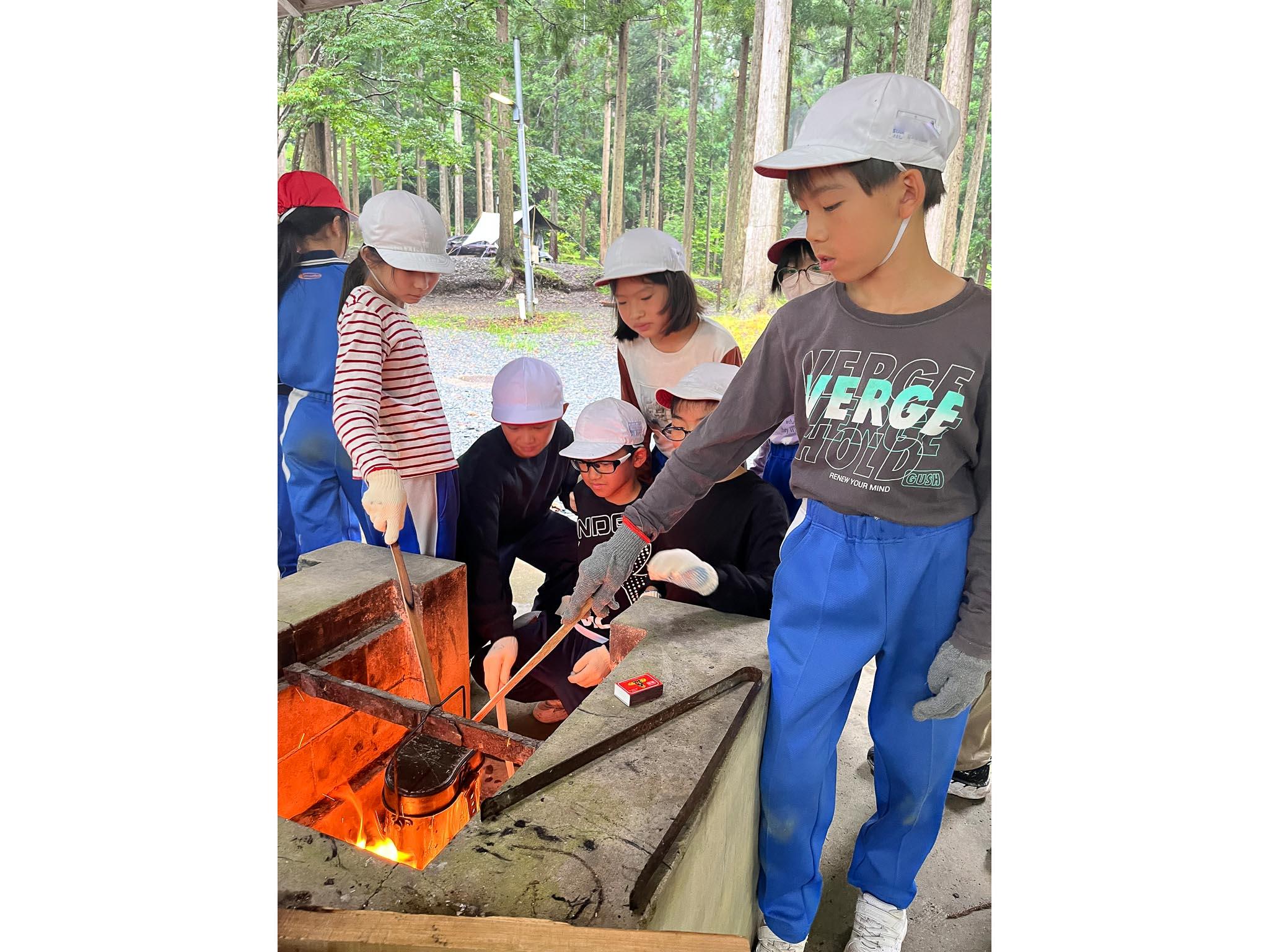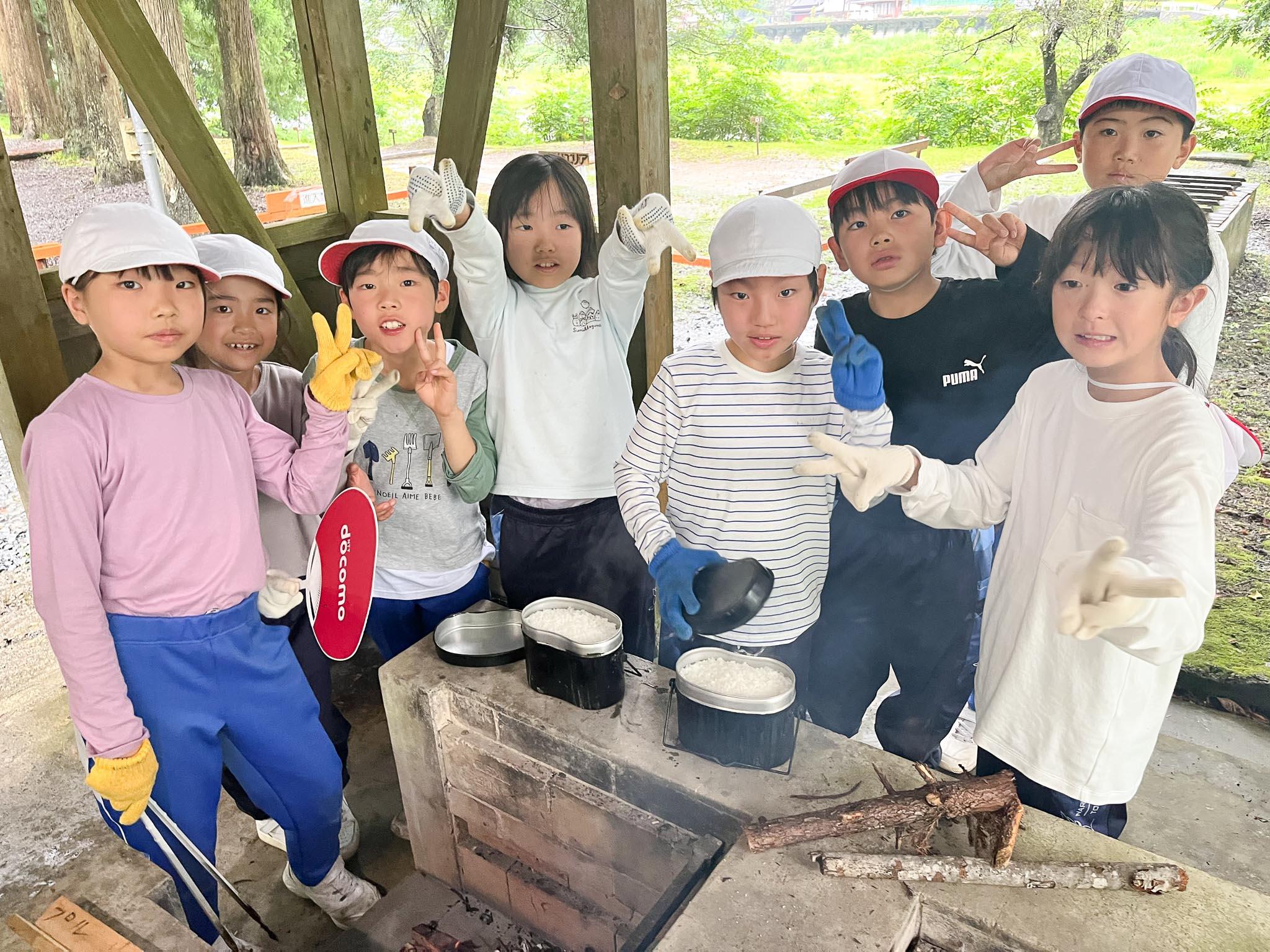 飯盒炊爨では、各グループが薪を組んで火をつけることに苦労しました。どのグループも苦労した分、ご飯が炊き上がったご飯を見て歓声があがりました。みんなで作ったご飯はとてもおいしかったです。食後のデザートのスイカもとてもおいしかったです。