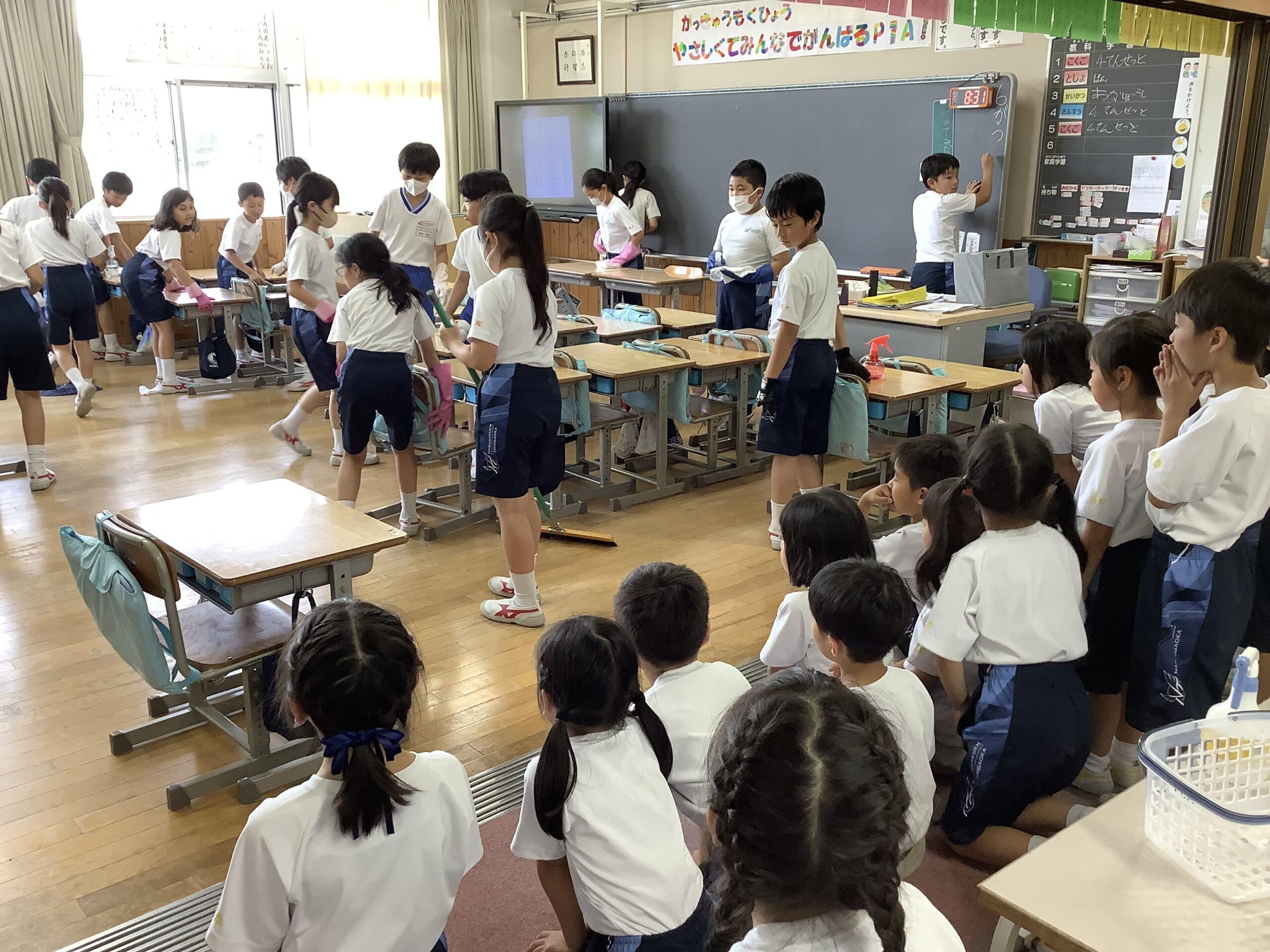 奈良学園小学校の掃除は、ダスキンとコラボして実施しています。コロナ禍において、自分たちの身体は自分たちで守る取り組みの一環として導入した「衛生環境を守る掃除」です。