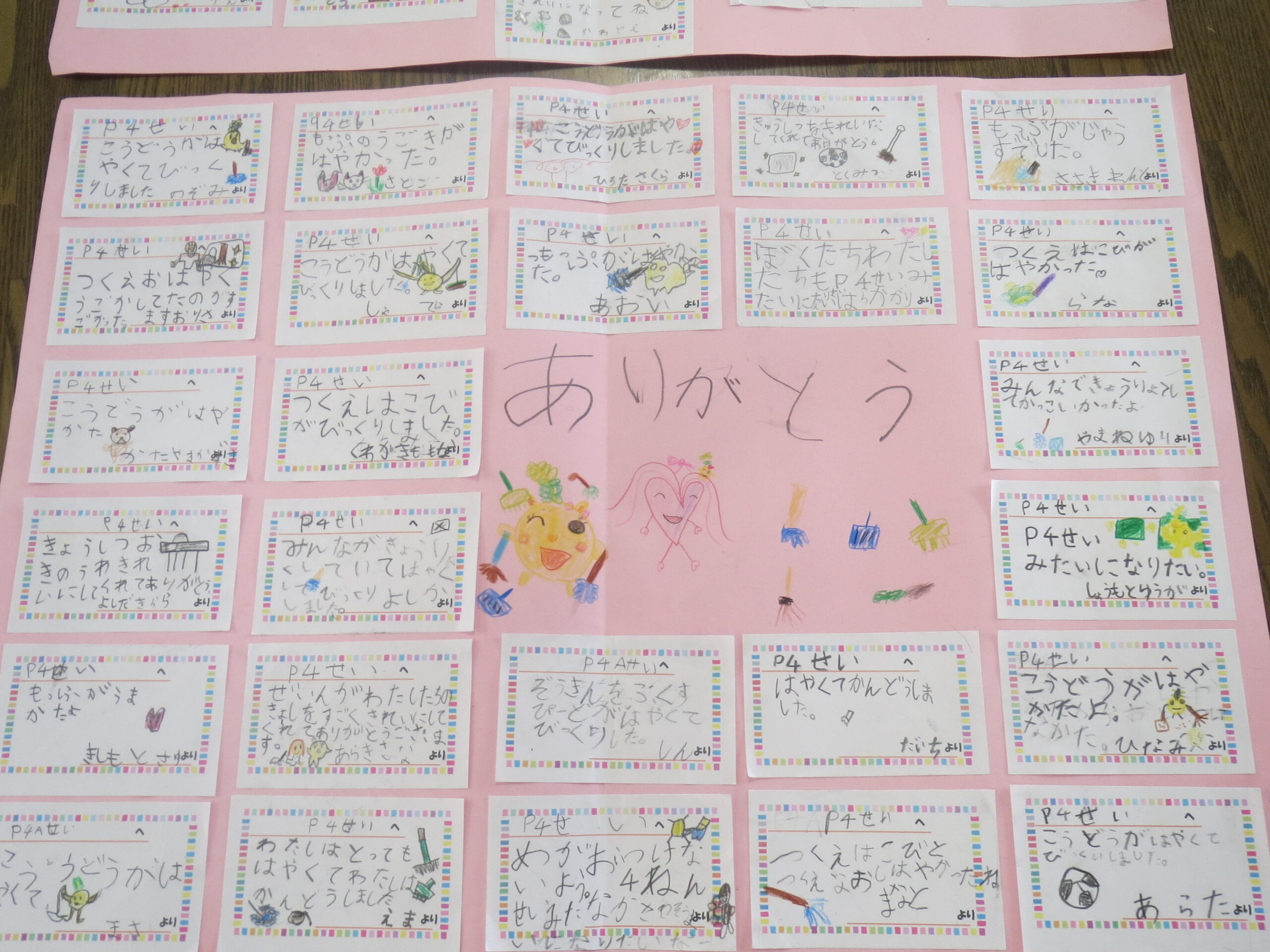 「ぜんいんが わたしたちのきょうしつをすごくきれいにしてくれて ありがとうございます」「こうどうがはやかったよ」「はやくて かんどうしました」「みんなできょうりょくして かっこよかったよ」「P4せいみたいになりたい」