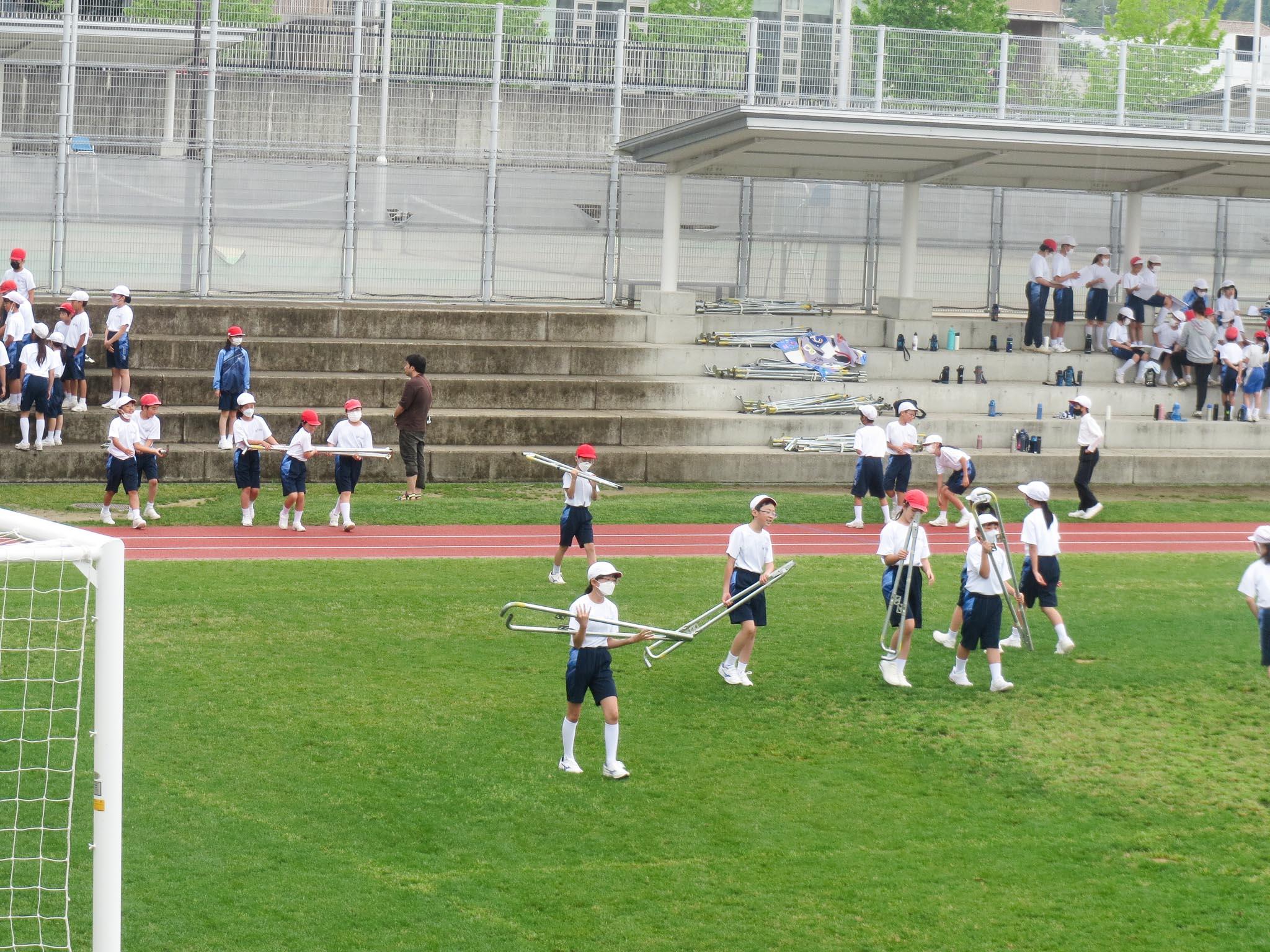 残念なことに、天気がすぐれず、みんなが集まっての予行練習はできませんでした。低学年は、一学年ずつで一時間を使って本番の確認です。それぞれの競技の並び方も確認しました。高学年の4年、5年、6年は一緒に集まって、競技の確認と役割分担の確認やテントを運ぶなどの準備をしました。