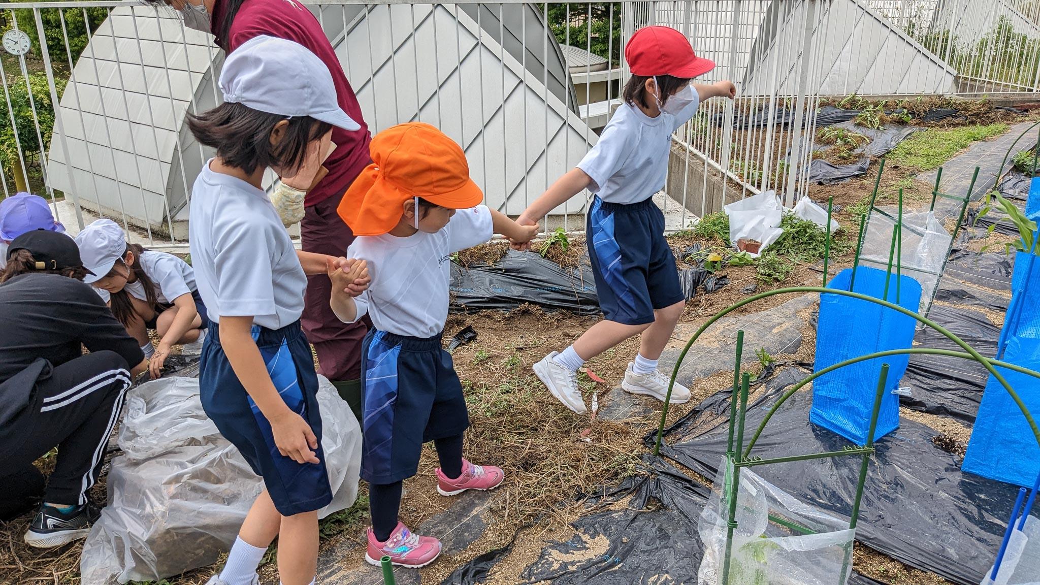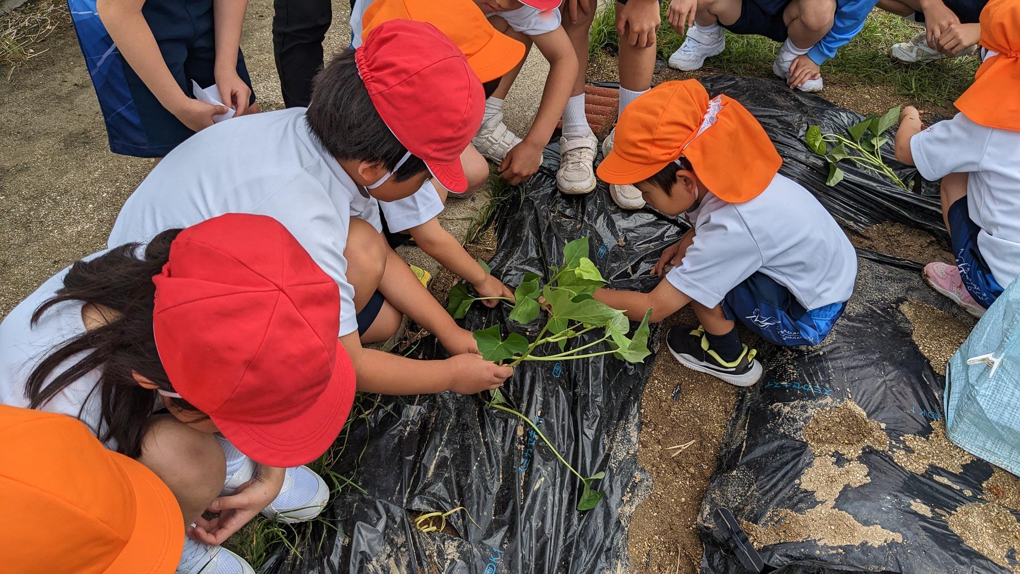 P2(小学2年)生が、奈良学園幼稚園の年中さんと一緒にサツマイモの苗を植えました。