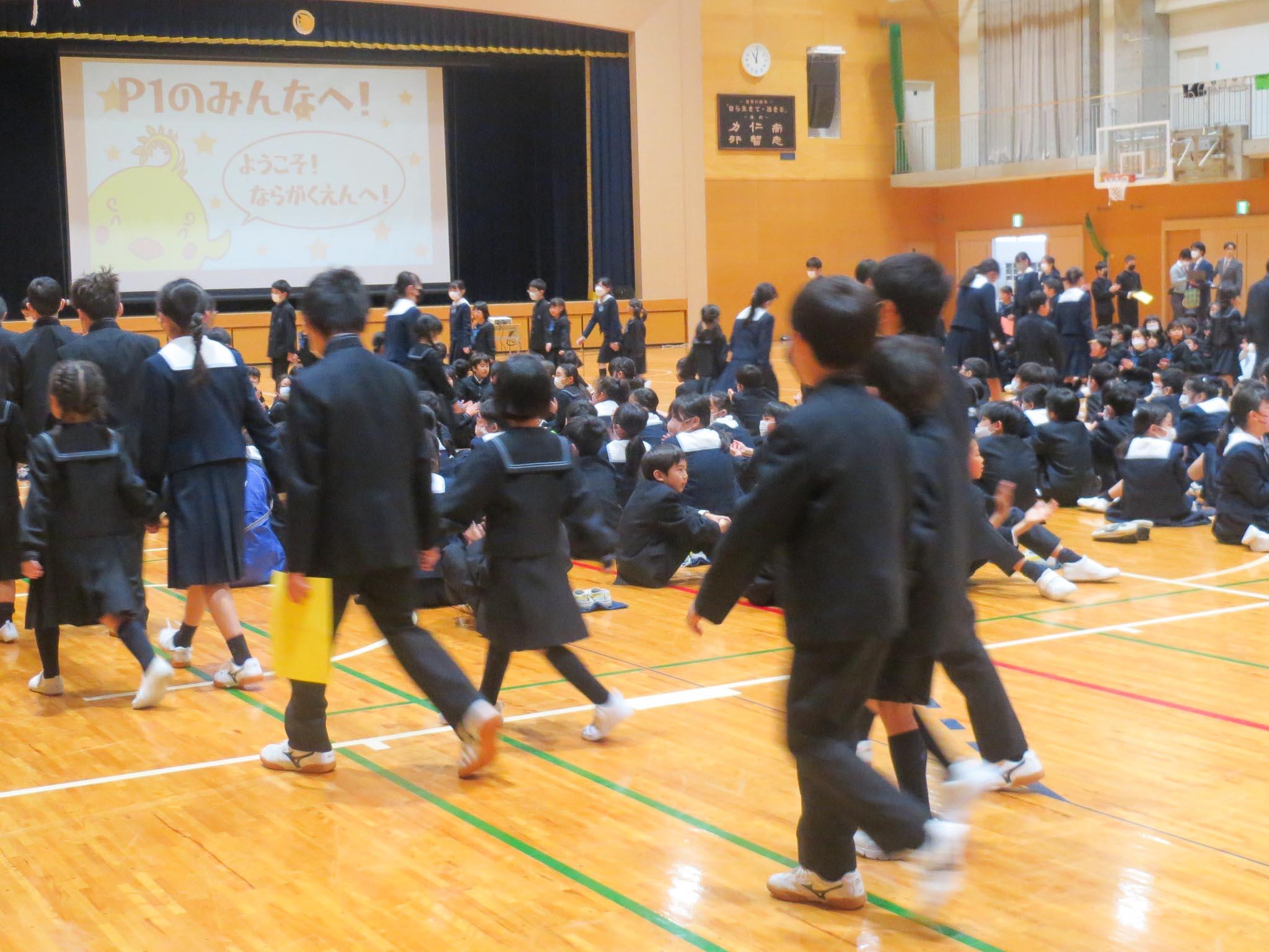 P1生を奈良学園小学校に迎えて、上級生との対面式がありました。