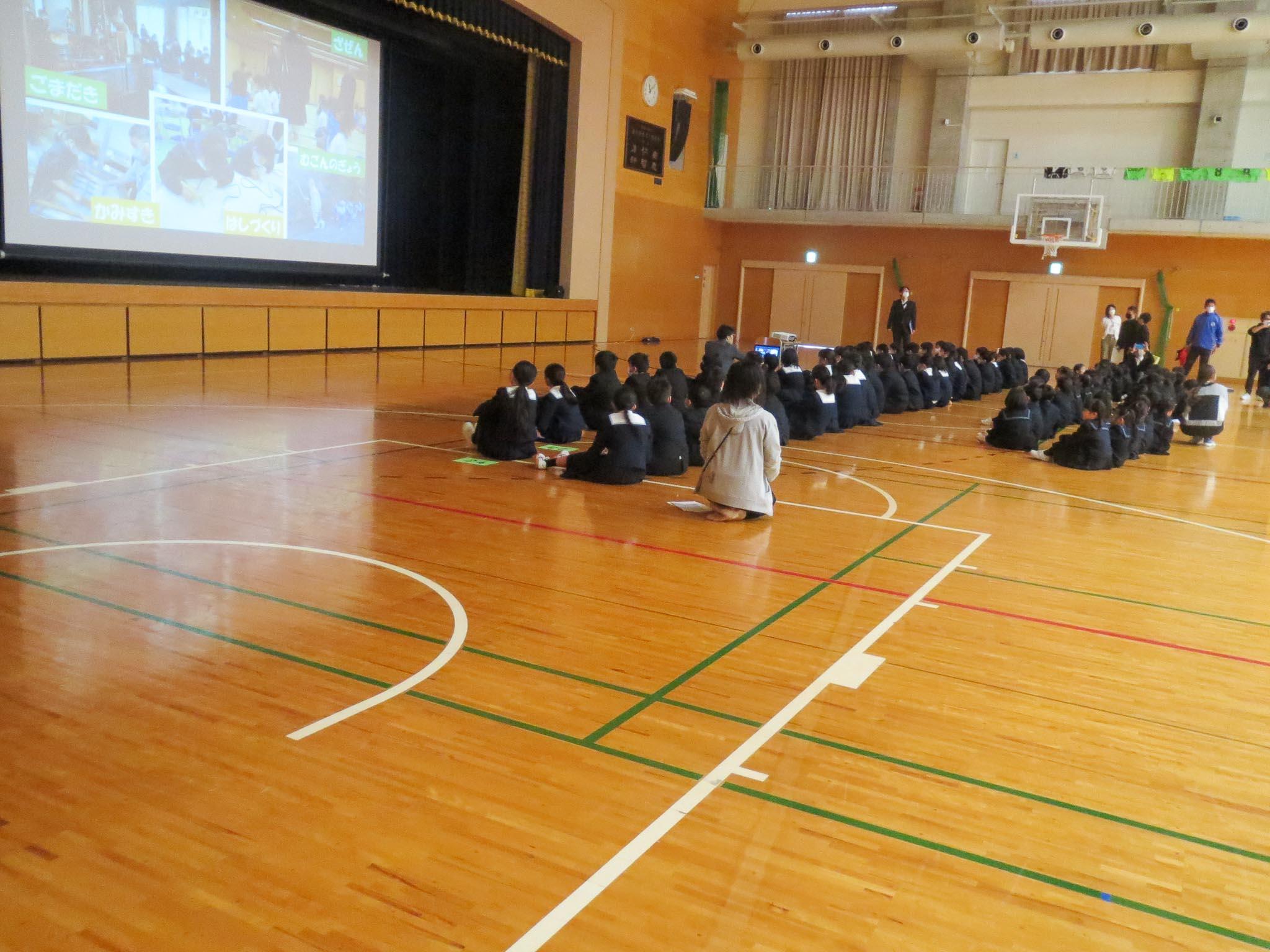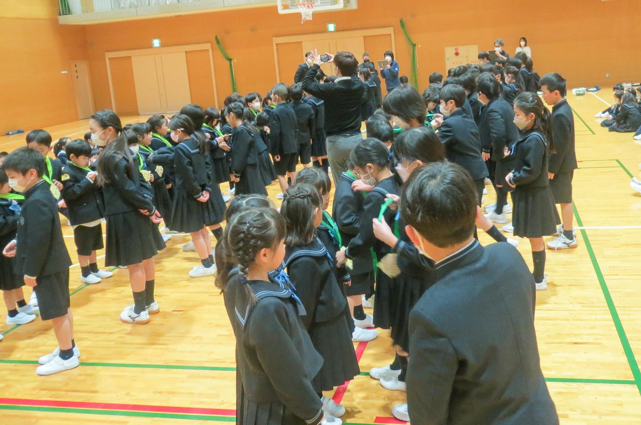 長い間、みんなが集まって実施できなかった行事でしたが、MY体育館に集まって、P2生からM2生が歌った校歌は、素晴らしい歌声でした。P2生以上の学年からは、宿泊学習を中心に、どんなところに行って、どんな体験をするのか、簡単に説明があり、聞いているP1生の楽しみな気持ちも膨らんだようです。そのあと、P4生からメダルのプレゼント。実は、P4生は、自分たちがP1生の時にはこんな会を開いてもらうことはできなかったけど、こんなメダルが欲しかったな、という気持ちを込めて作ってくれたということ。メダルをかけてあげる顔もうれしそうです。P1生からのお礼もしっかり伝えてくれました。