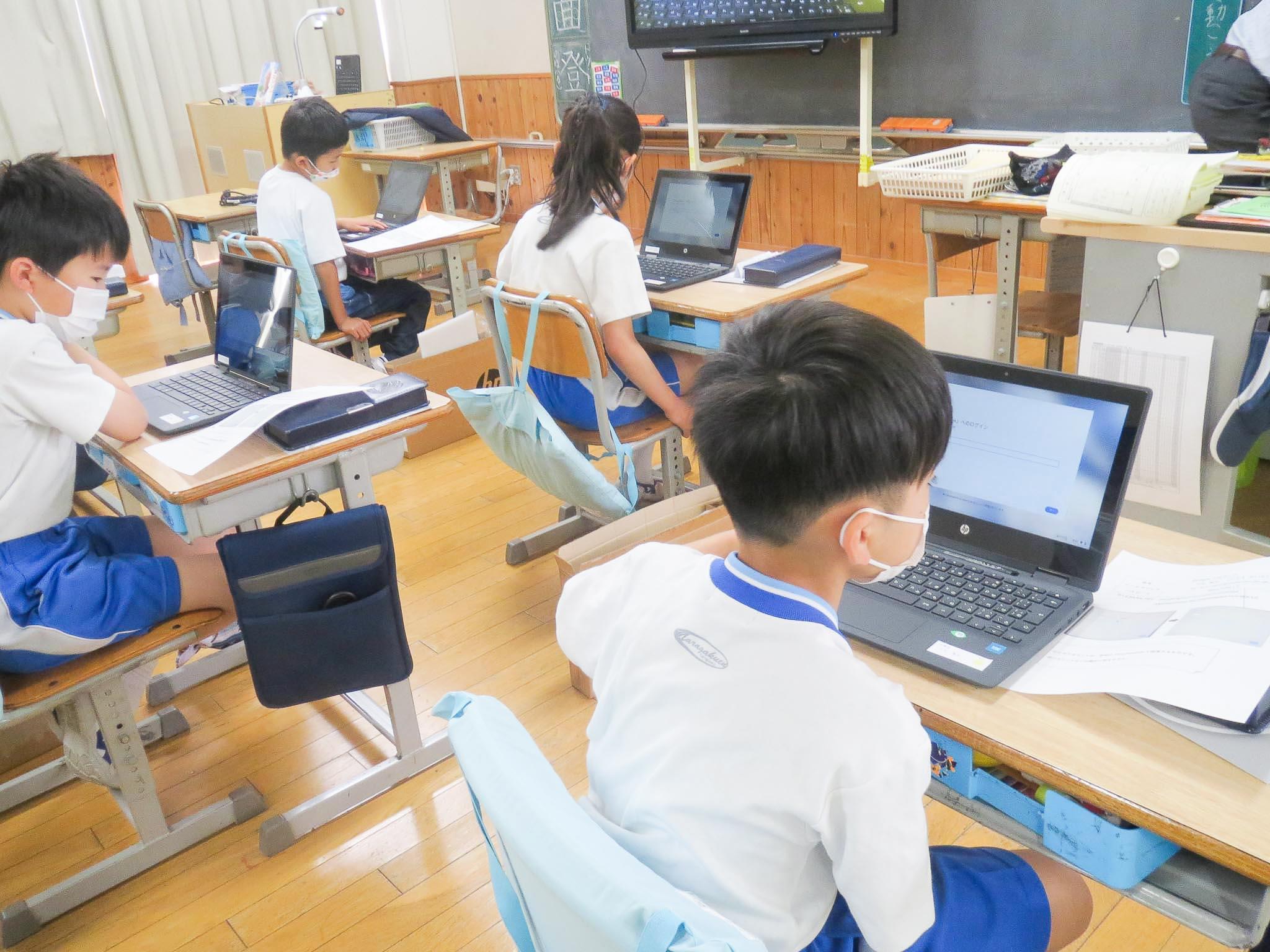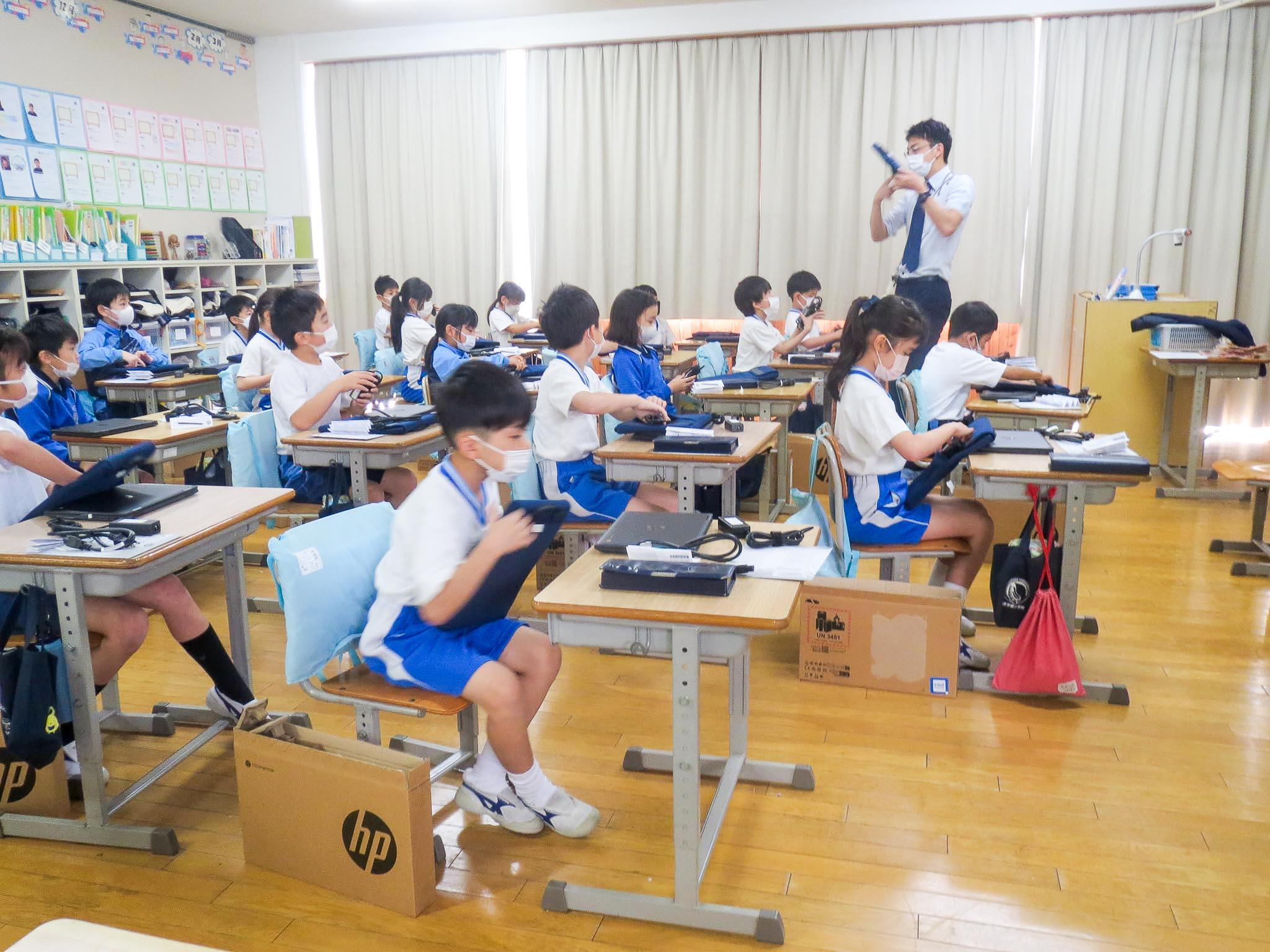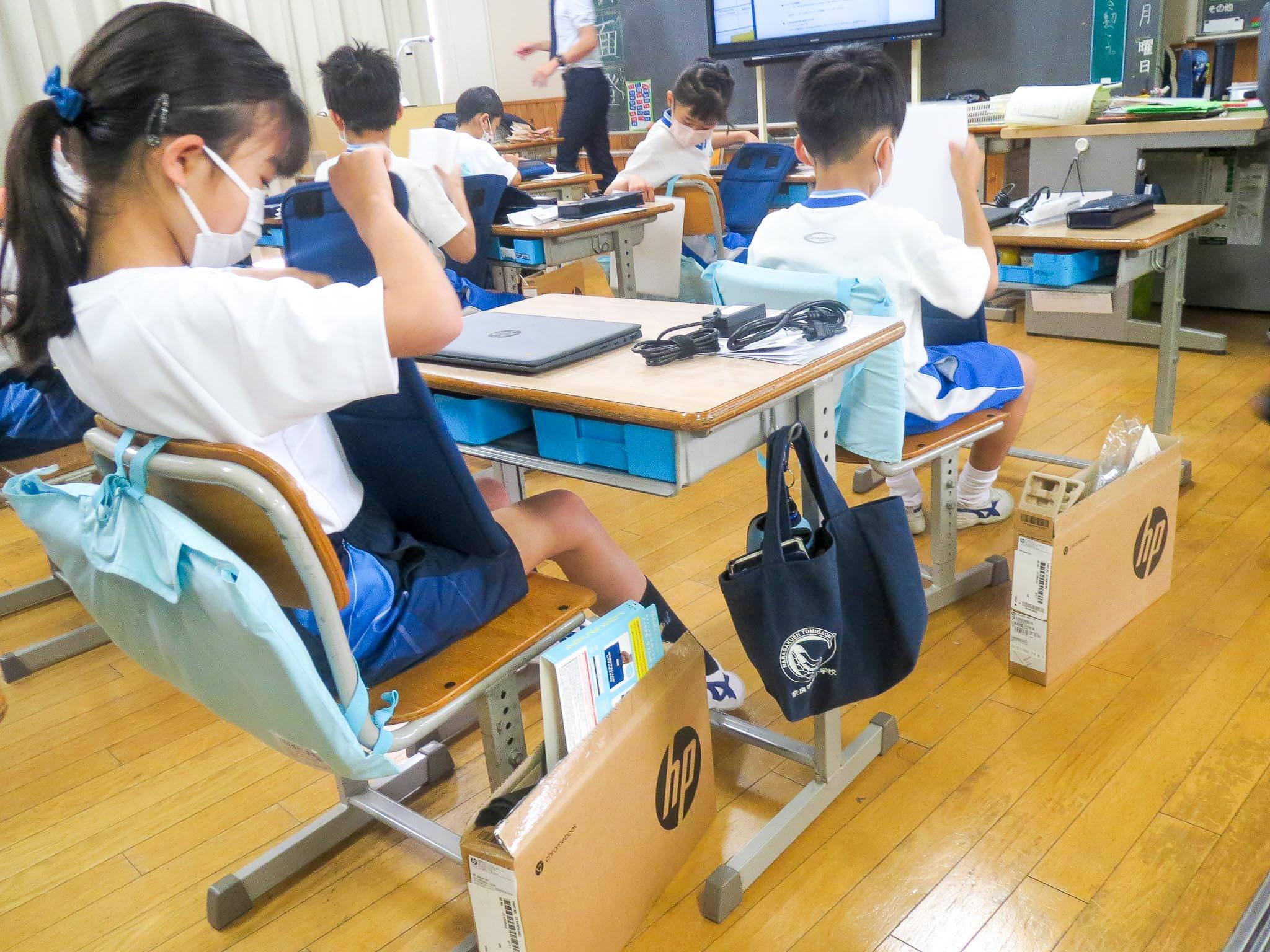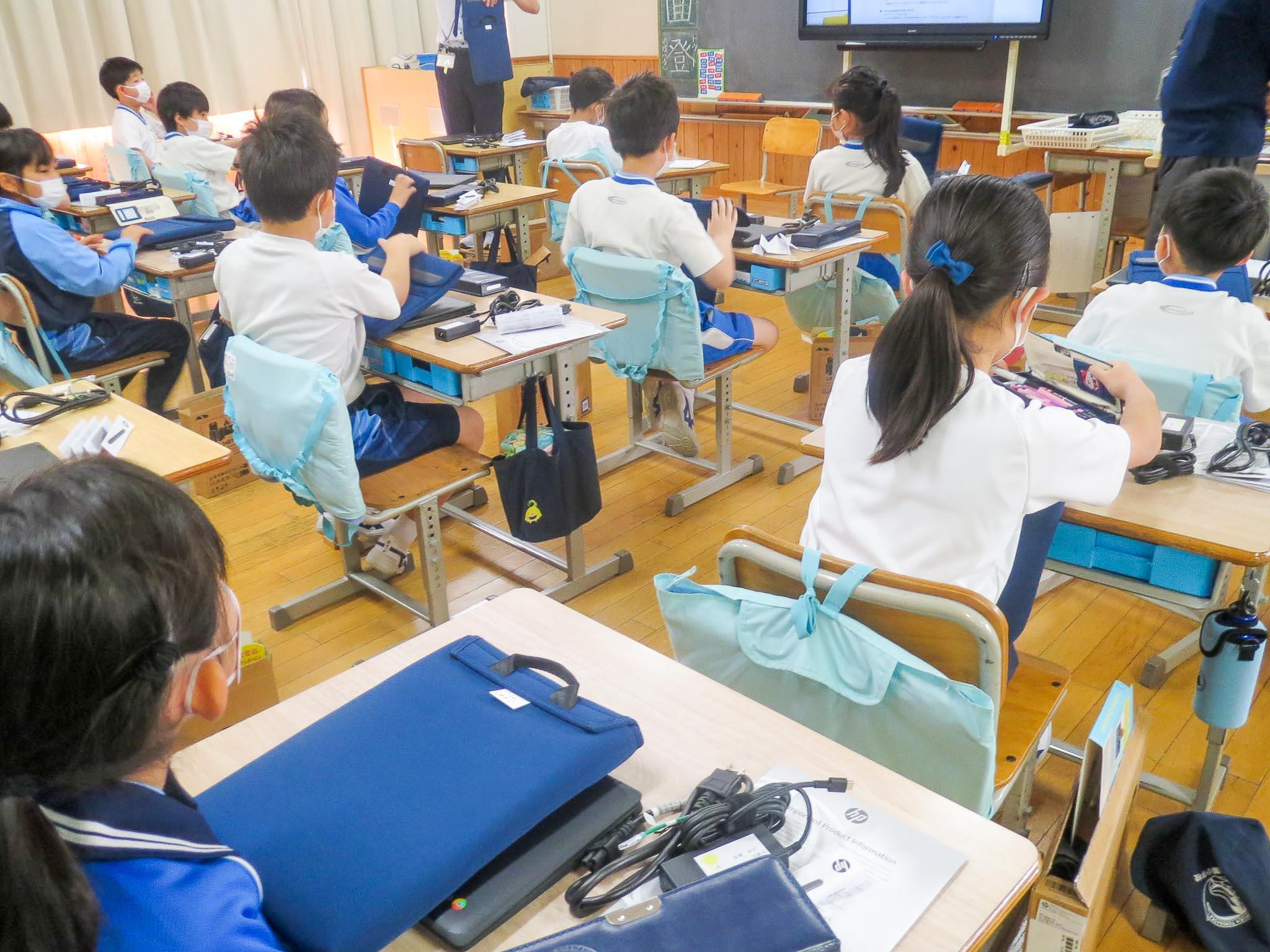 今年度のP3生が、自分のPCを初めて使う日がやってきました。段ボールに入っているPCを箱から出して、電源を入れてログイン。使い方は分かっている子どもたちですが、自分のPCとなると、うれしい気持ちも高まっている様子でした。