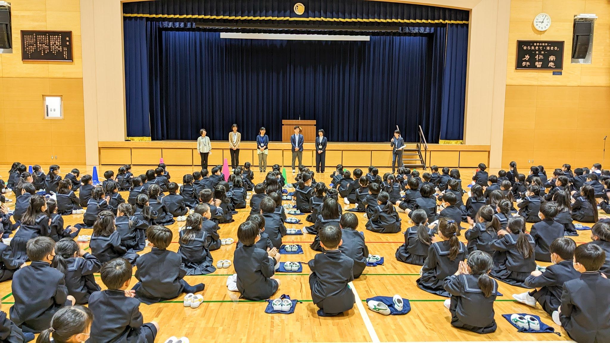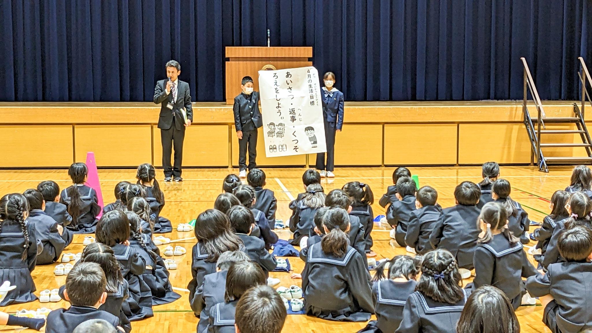 学年初めの校長からの話を聞いた後に、各学年の担任の先生の発表、4月の生活目標についての話を全員で聞きました。全員が集まることで、自分たちの学級だけではなく、どの学年も同じようにスタートするのだな、ということを一人一人が感じ取る時間になったと思います。