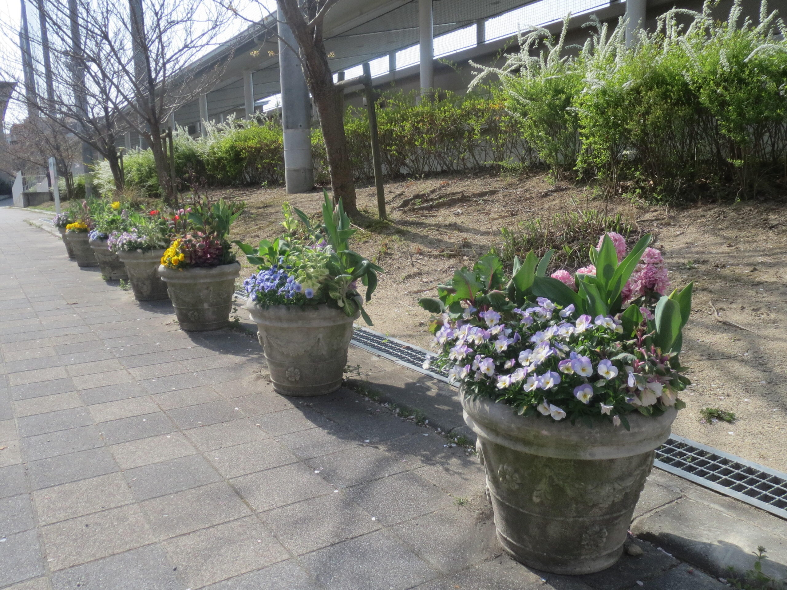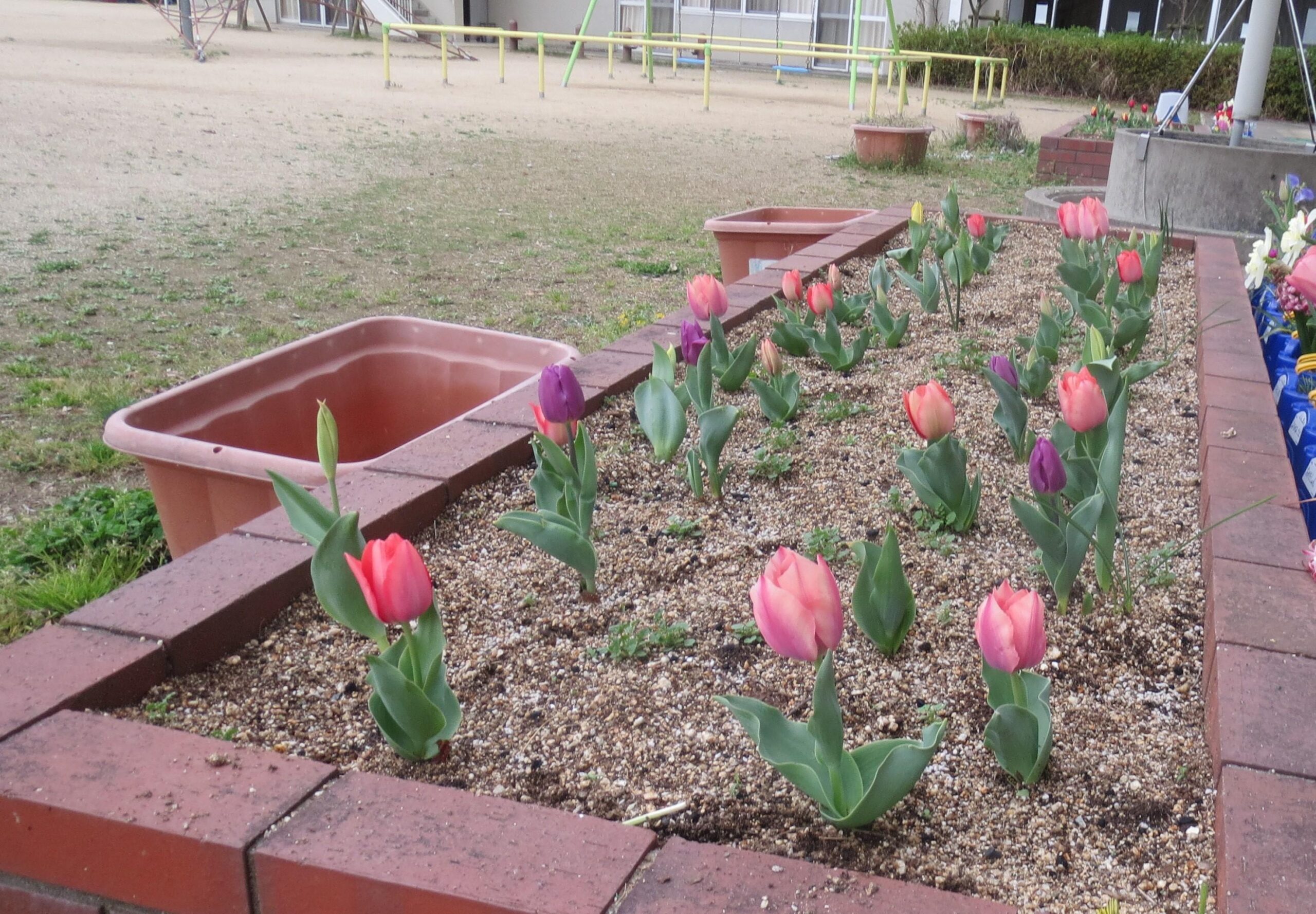 色鮮やかな花々と伸びていく緑とともに、新学年の子どもたちが登校してくれるのを待ちわびている春休みの学校です。
