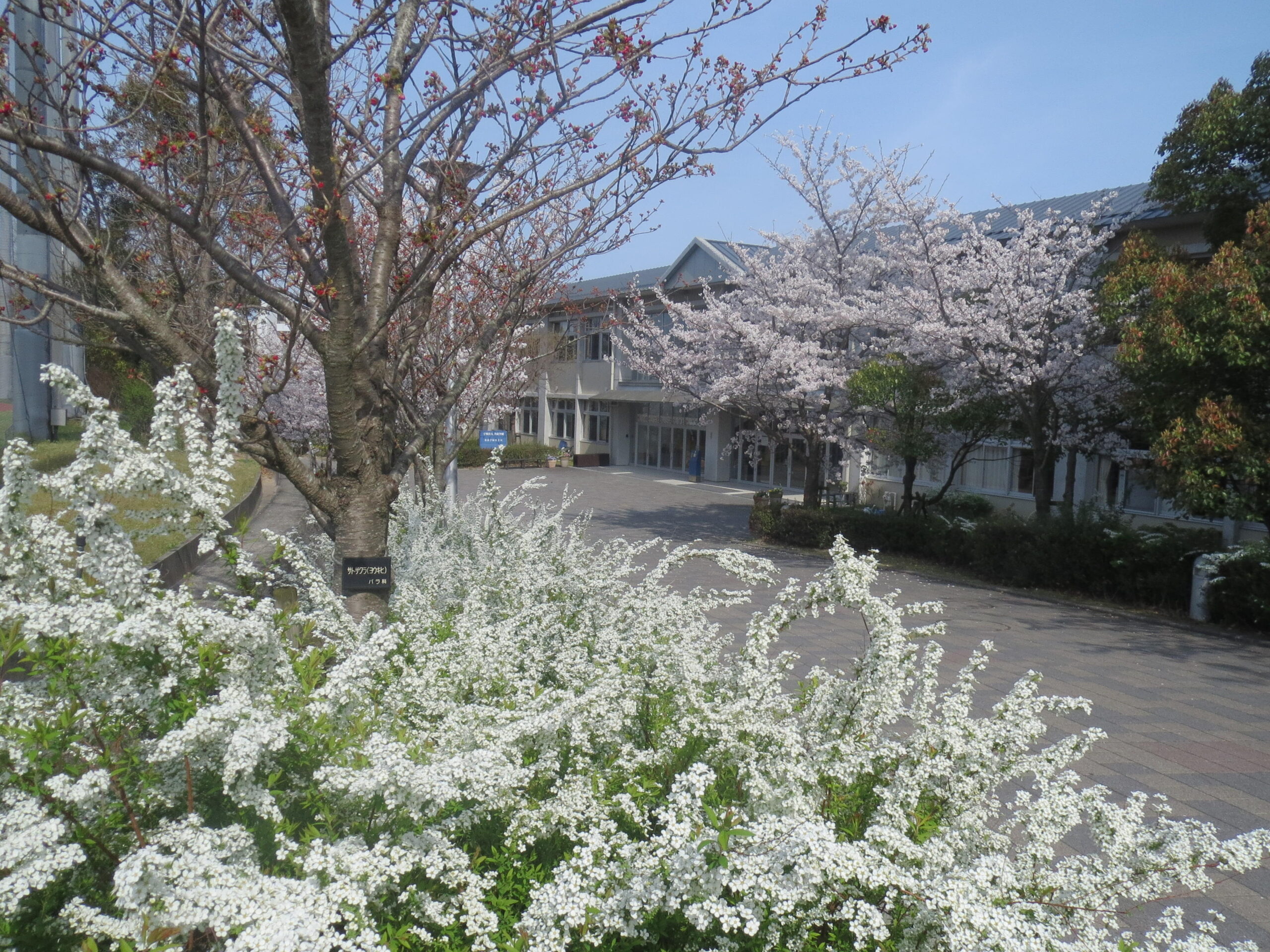 春休みの学校では、桜の花が満開です。すでに少し花びらが落ち始めている木もあります。あとを追うように、八重桜が開花の準備をしています。1年生の教室前の畑を見てみると、チューリップも見事に花開いています。入学式まで待っていてくれますように…。でも、あでやかな花の後には、勢いのある新芽が緑の芽吹きを見せてくれます。