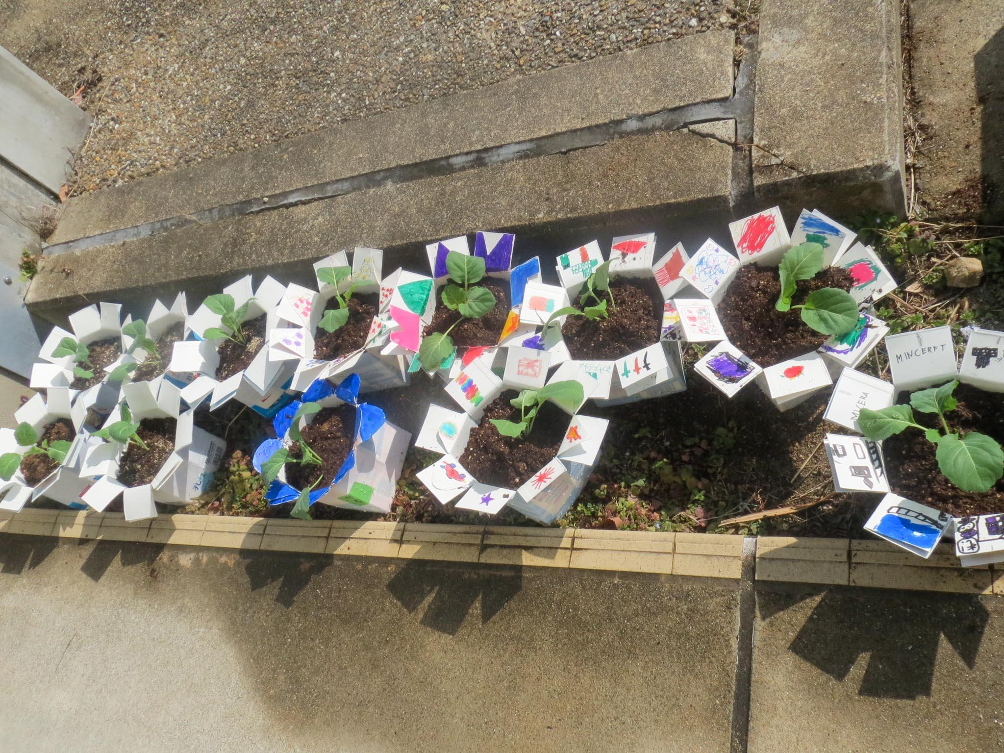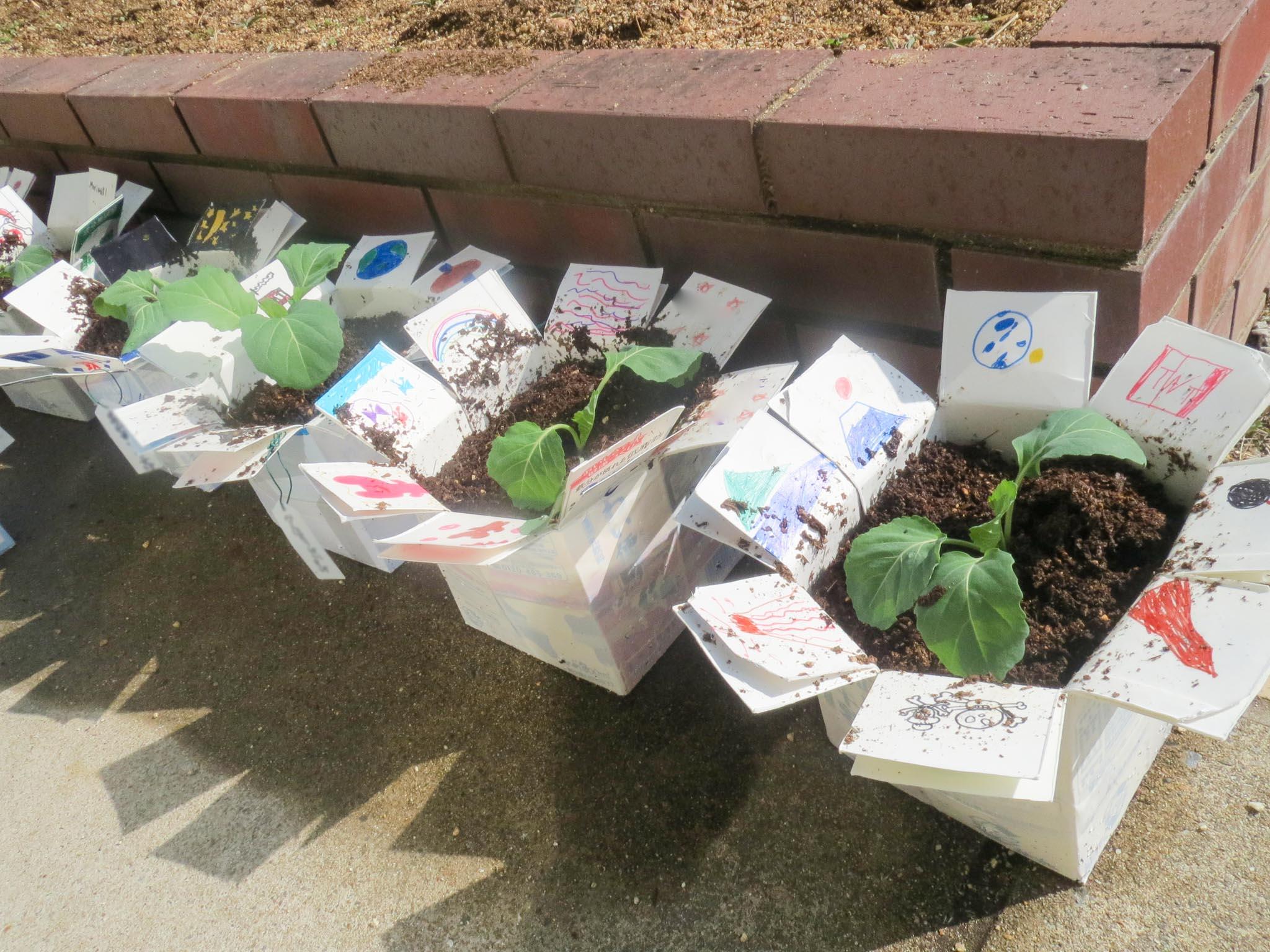 P2(小学2年)生が、牛乳パックを組み合わせて作った鉢に、キャベツの苗を植えました。春が来て、P3(小学3年)生になったら理科の勉強が始まります。その中で、チョウのタマゴを見つけて、その生長を観察するという活動をするのです。チョウがタマゴを産み付けてくれるように、キャベツを育てていこう、ということです。