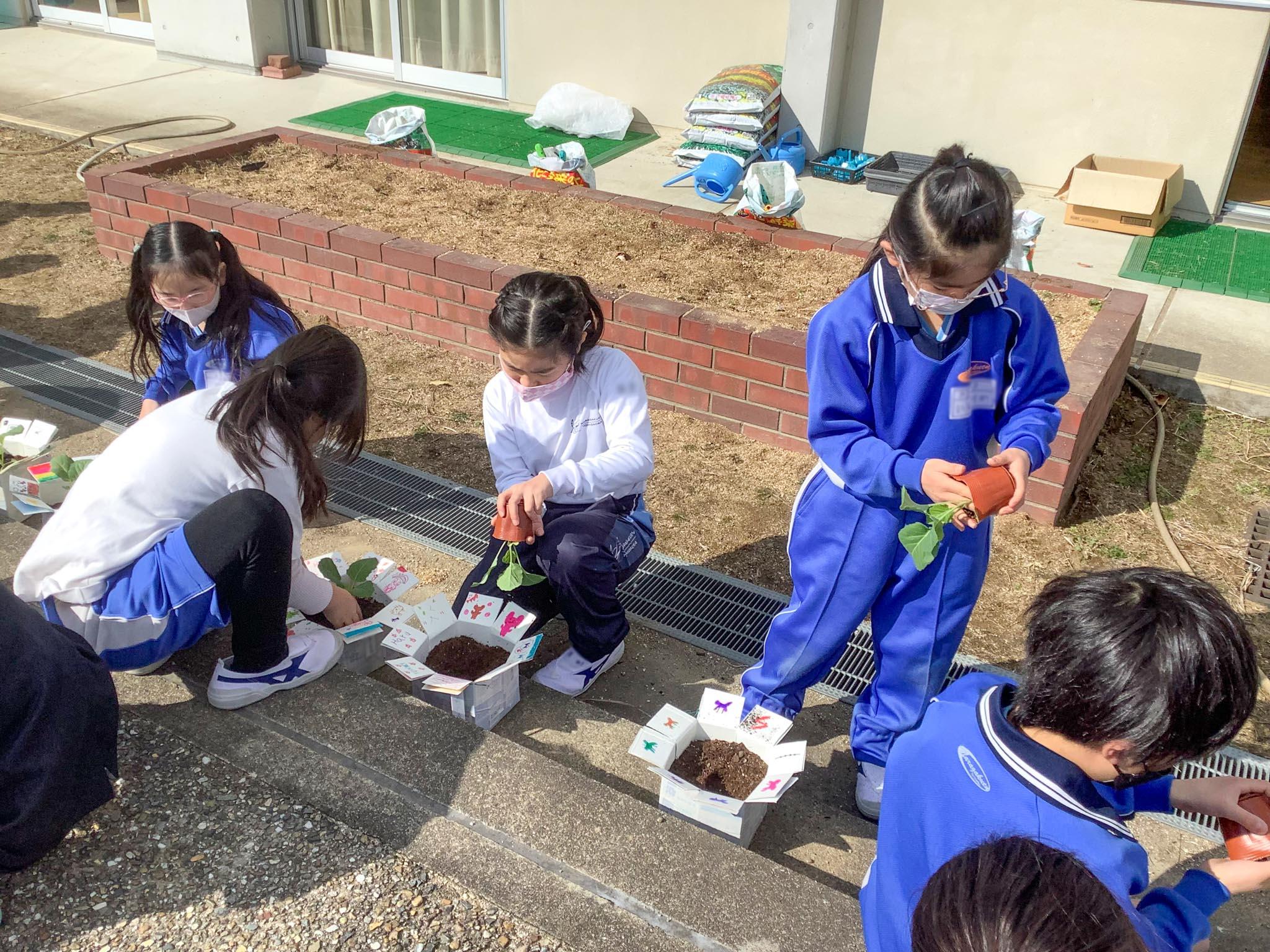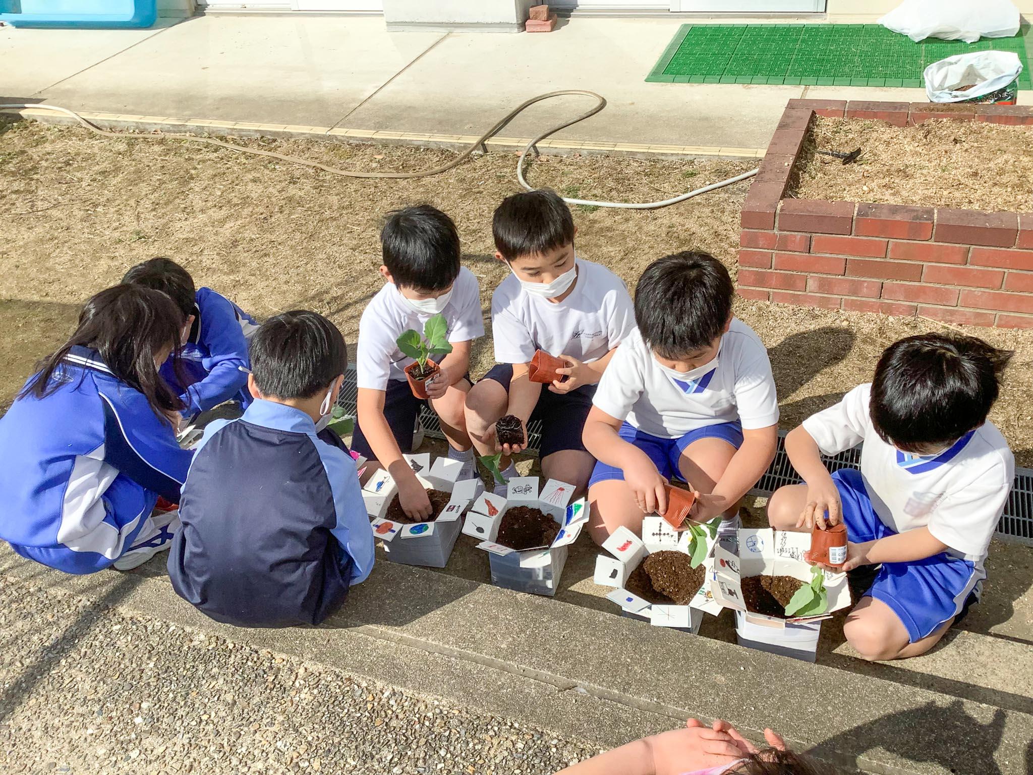 P2生は、P1生の時からたくさんの植物を植えて育ててきています。今植えたキャベツが、自分たちとともに3年生になって、自分たちの勉強にまた役立ってくれる、ということを知って、育てる気持ちがうんと高まったようです。