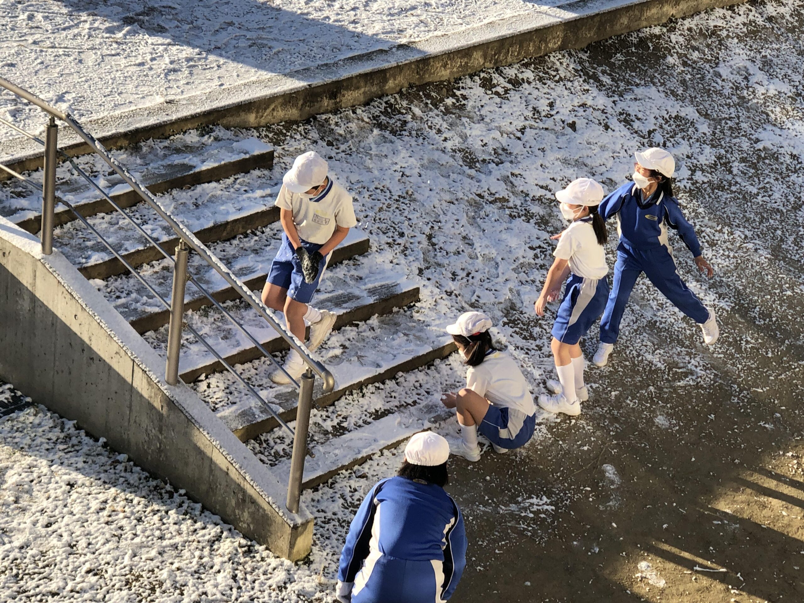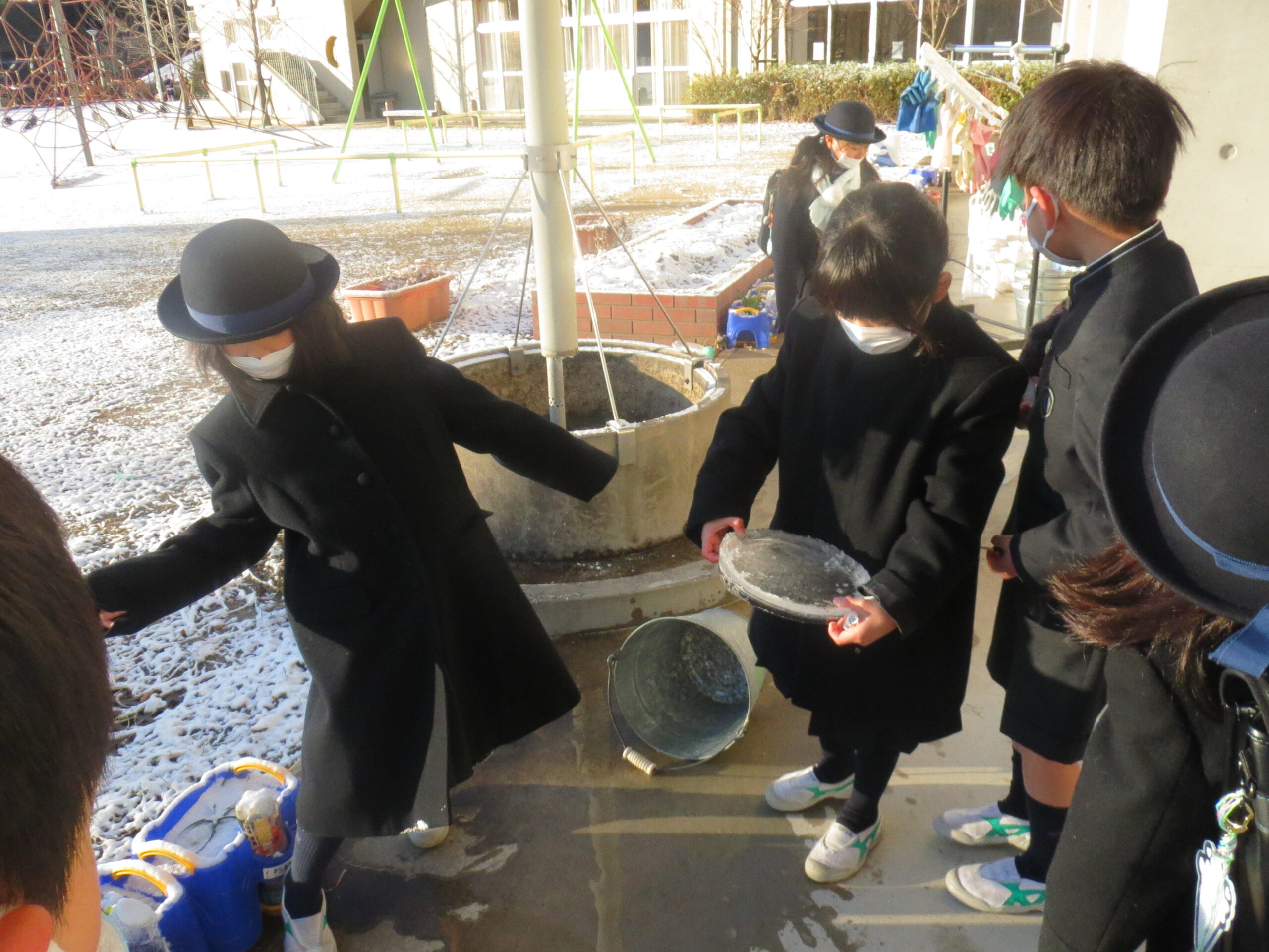 教室の外のバケツの水が凍っていた、と大喜びで持ち上げている子どもたちや早速外で雪遊びを始めている子どもたちがたくさんです。