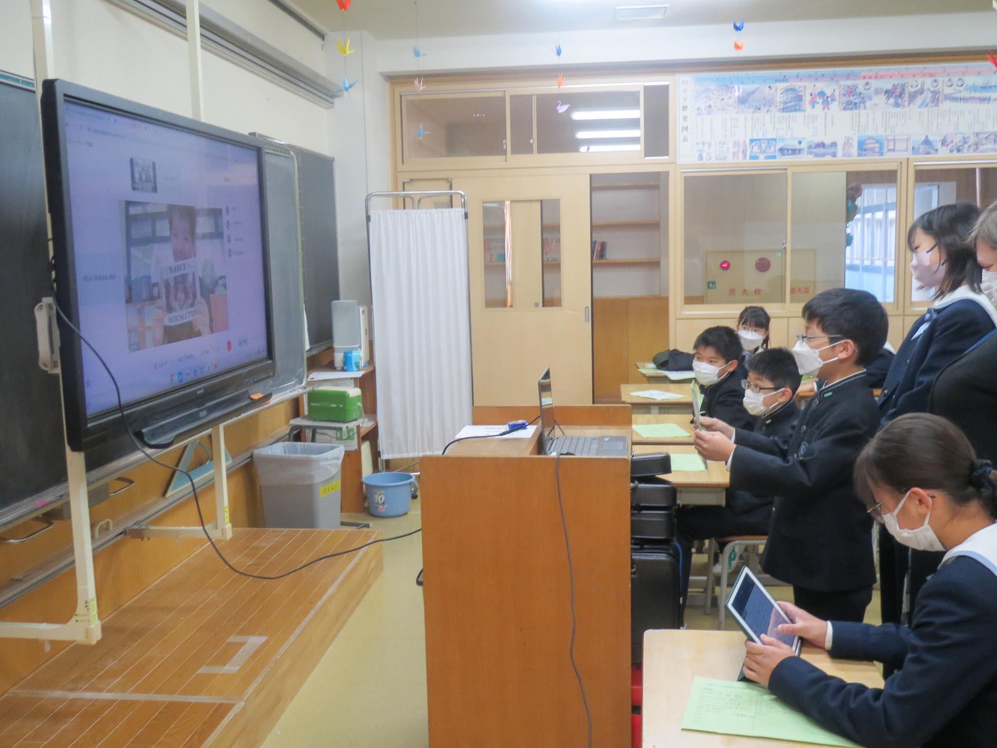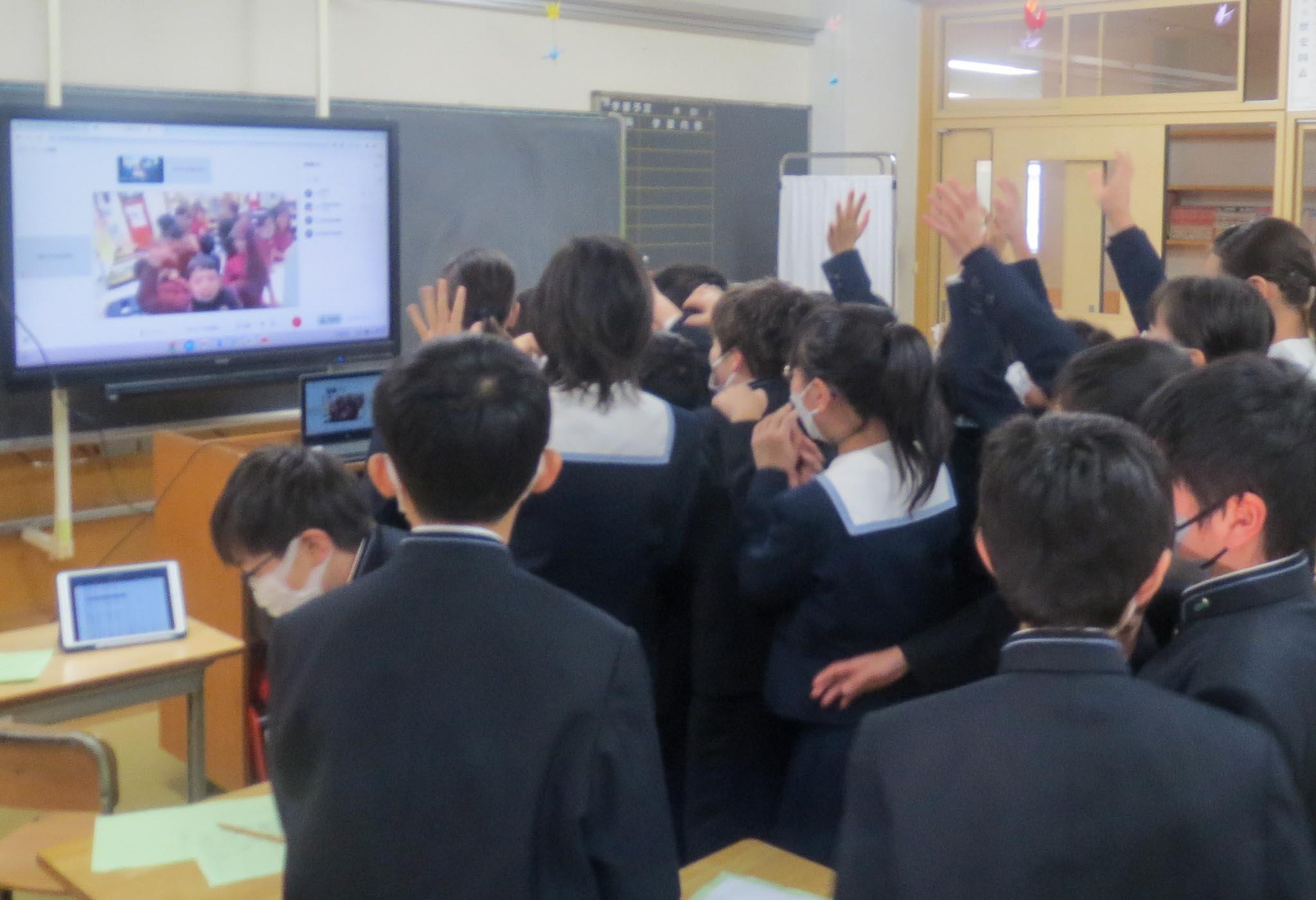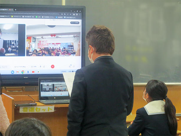 すでにM1の子どもたちは、ペアとなる友達にメールをしたり、クリスマスカードを送ったりしていますが、今回は直接顔を見ての自己紹介です。自分の名前と、好きな食べ物や趣味についてなど、ペアの友達と簡単なやりとりをして手を振って挨拶をするだけです。でも、画面の向こうのハワイの友達に話しかける表情から、ドキドキしている気もちが伝わってきます。全員がやり取りした後には、みんなで手を振ってお別れです。画面の向こうの様子も、みんなうれしそうです。