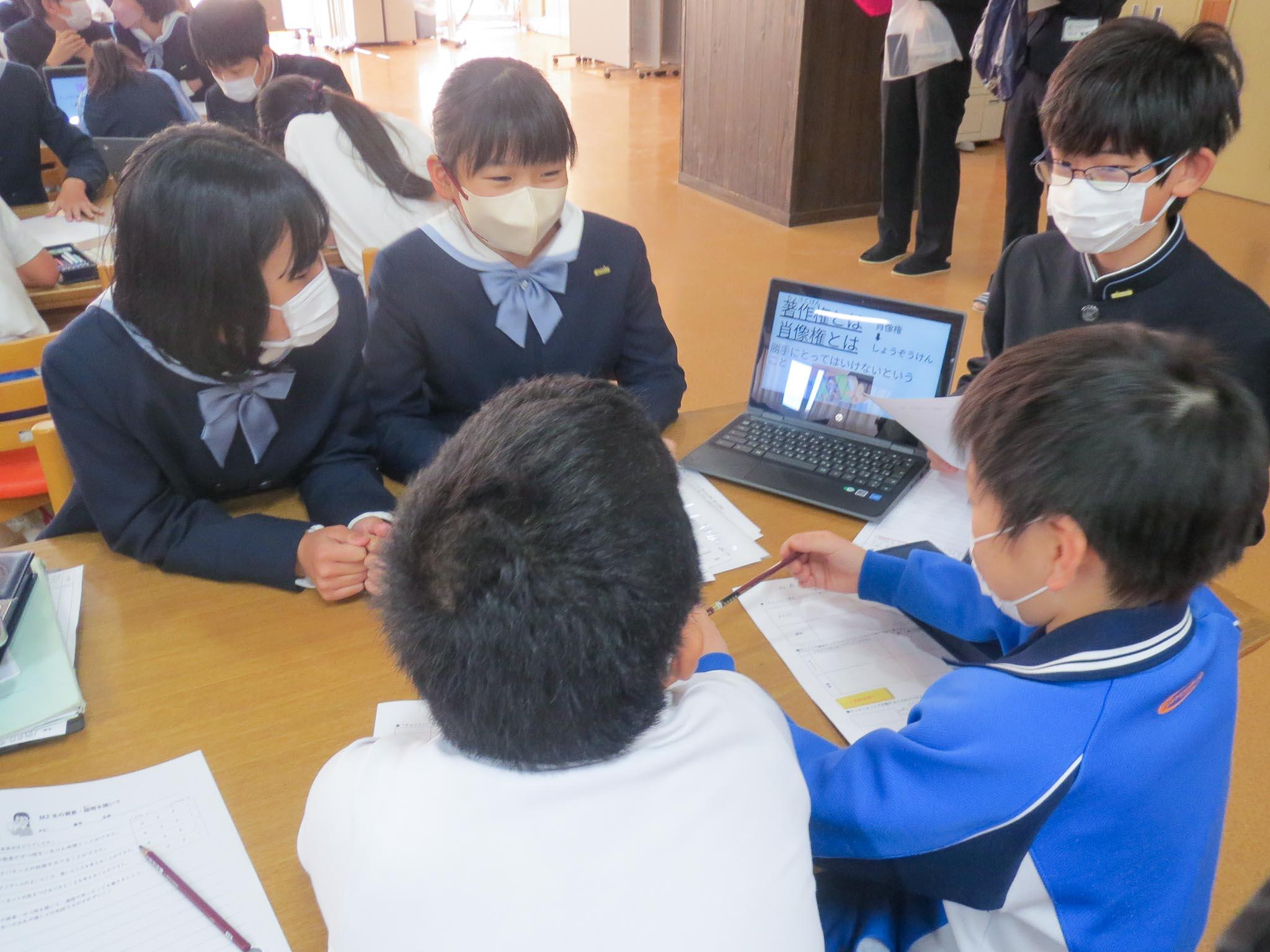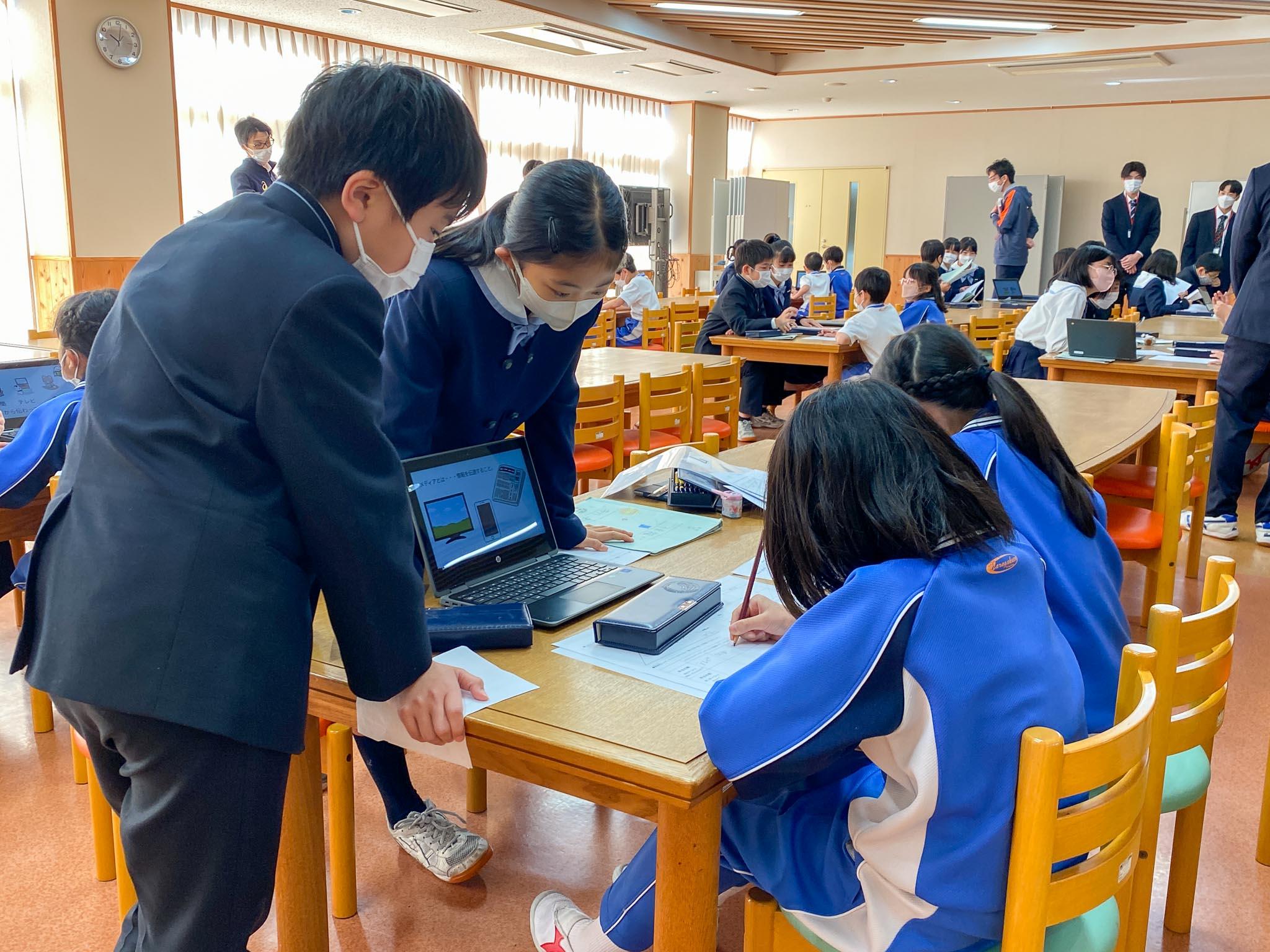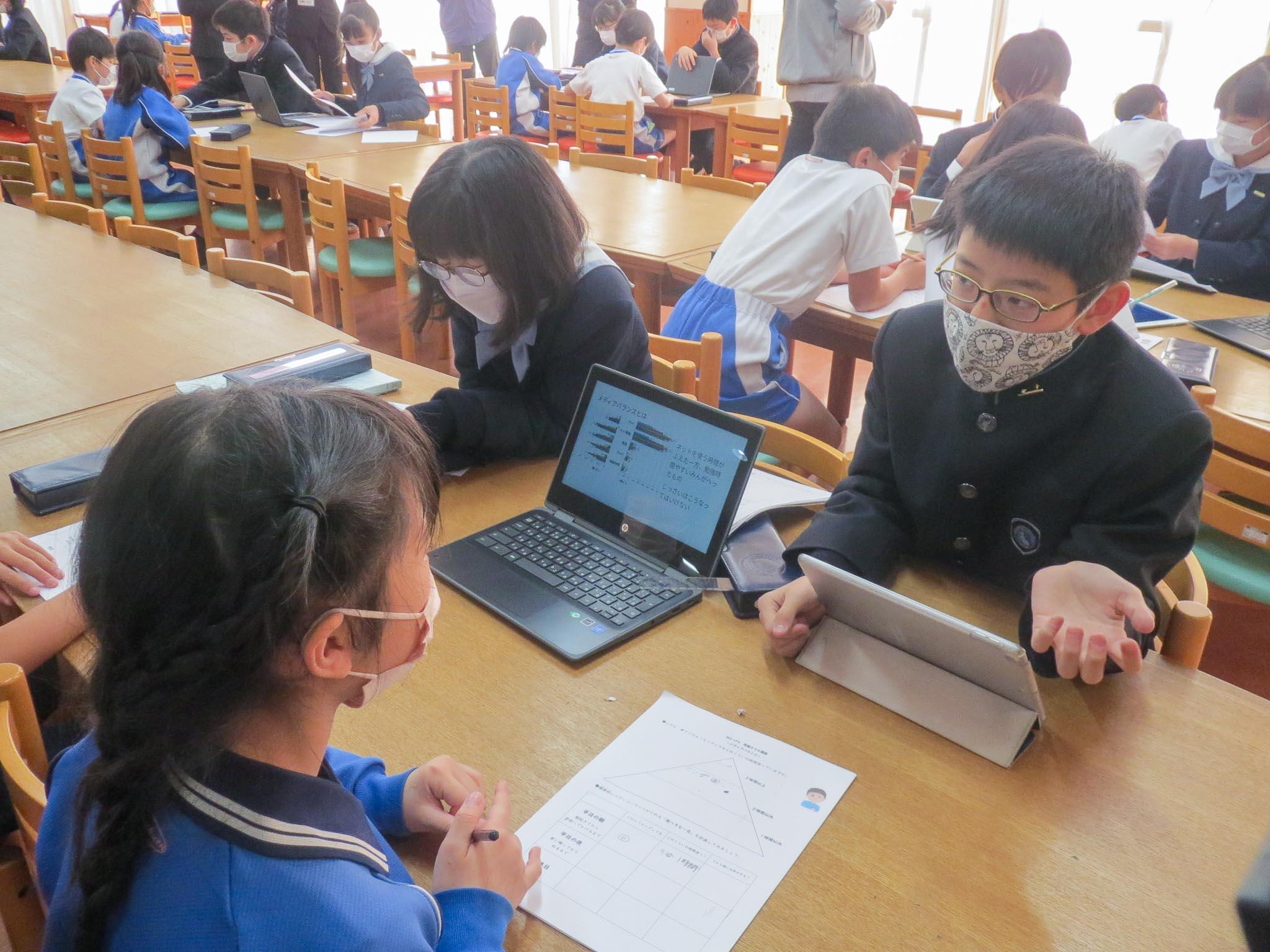 「情報モラル」というと「してはいけないこと」や「気を付けること」がとてもたくさんになってしまいます。でも、肝心なのは、身近にあふれている様々なデジタル情報に対して、「デジタルシチズンシップ」の力を身に付けることです。デジタルシチズンシップとは、デジタル社会において、コンピュータやインターネットを適切に活用して生きていかなければならない社会の中で、その一員として責任をもって行動していくにはどうあるべきか考えて行動できることをいうのです。なかなかすぐに身に付くものではありませんが、今回のように、下級生に伝えるために自分たちがしっかり理解したり考えたりすることを通して少しずつ身に付いていくと考えています。